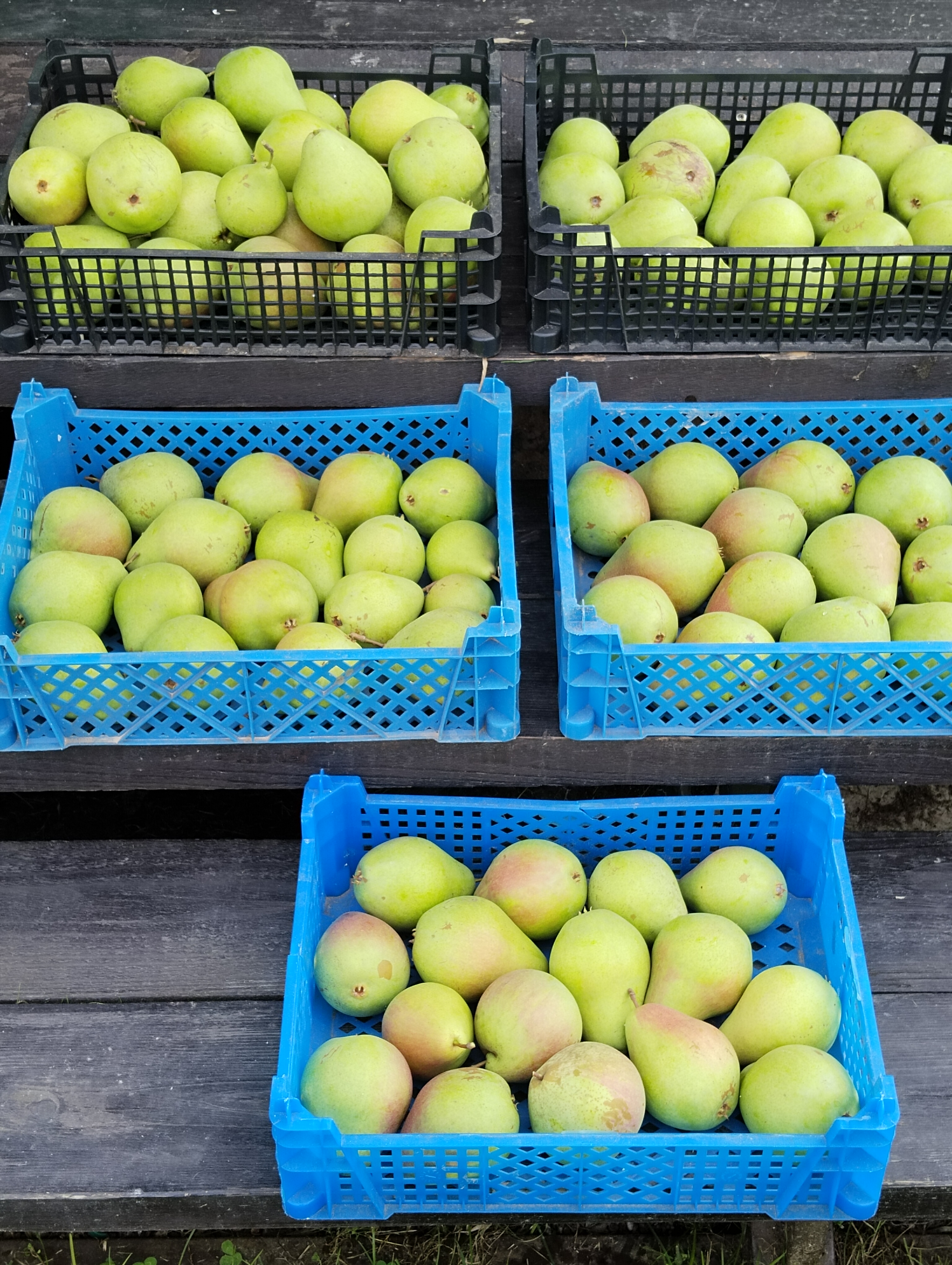 Велеса ещё не созрела, но сняла большую часть (осы вовсю едят). Тронутые осами почти поспели - очень вкусная груша, хотя кожура в этом году довольно терпкая. Если почистить ее, вкус сразу меняется. В прошлые годы терпкость кожуры почти полностью уходила при созревании. Убрала в погреб и немного в холодильник.