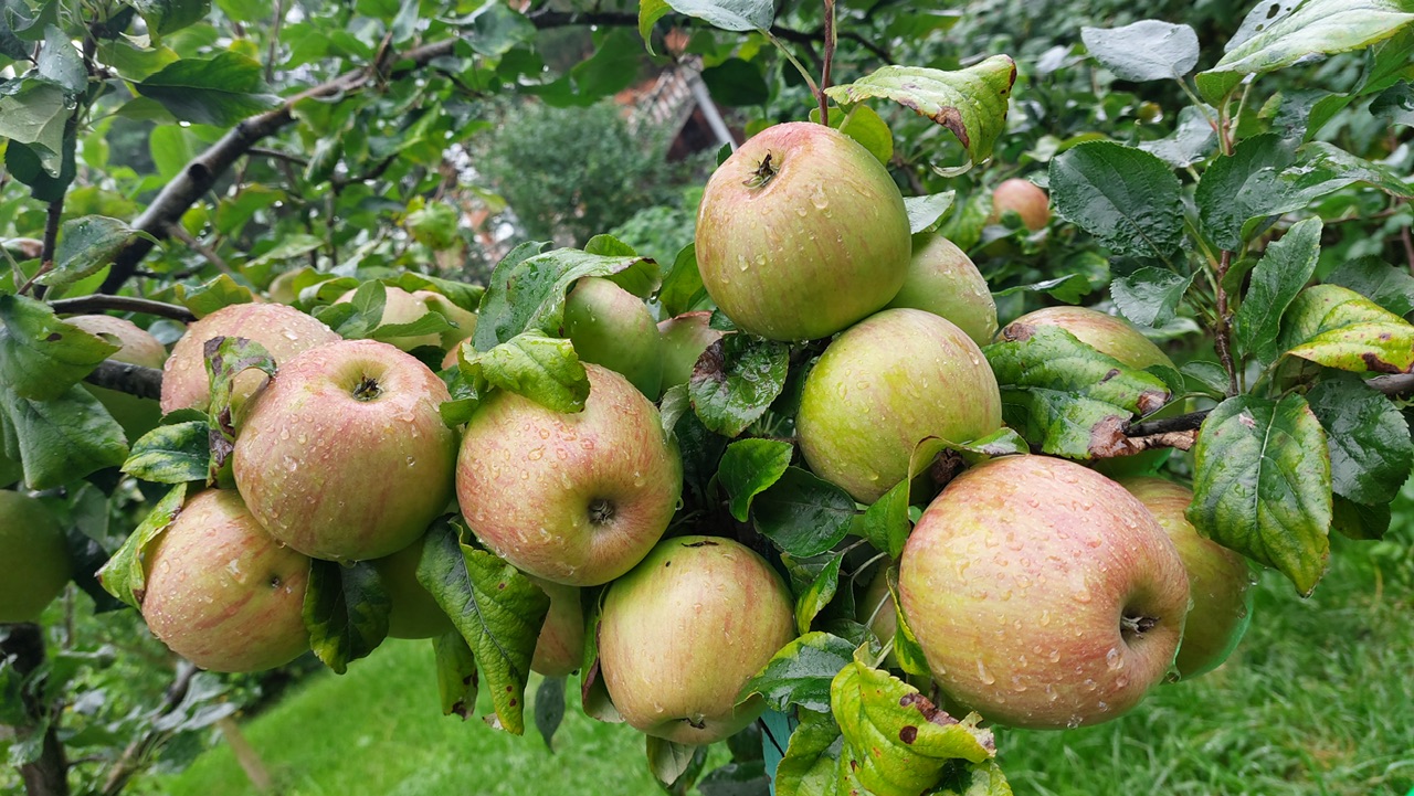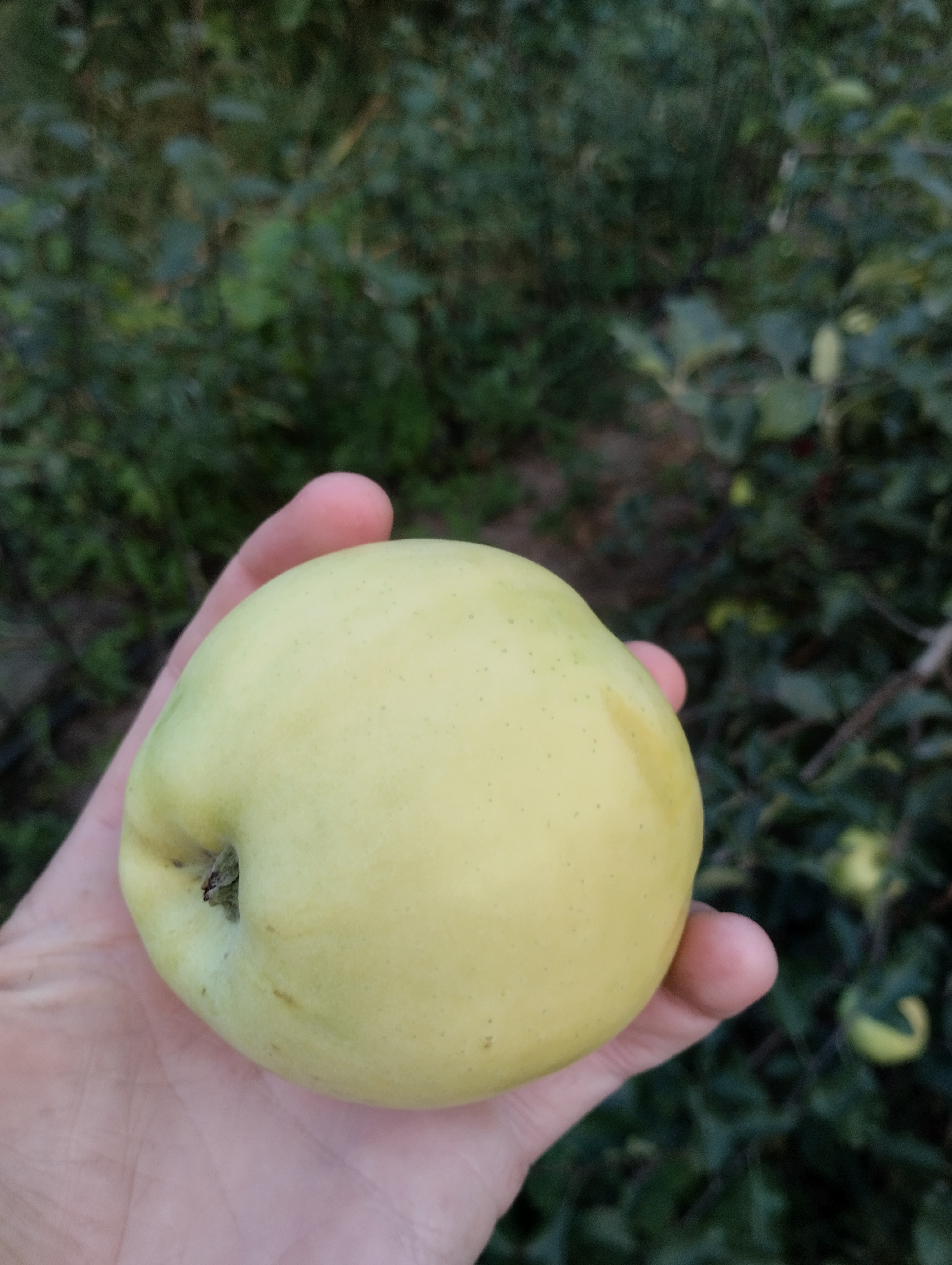 Вечером 6-го числа нашел в траве под деревом пару кило ВП. Основная часть плодов сорта уже созрела, да и сильный ветер помог снять яблоки с веток. Благо трава там высокая, еще не успел покосить, да и сами прививки находятся невысоко. В общем, видимых на глаз травм яблоки не получили, думаю какое-то время еще смогут полежать...) В тот же вечер снял основную часть урожая, получилась пара ящиков.