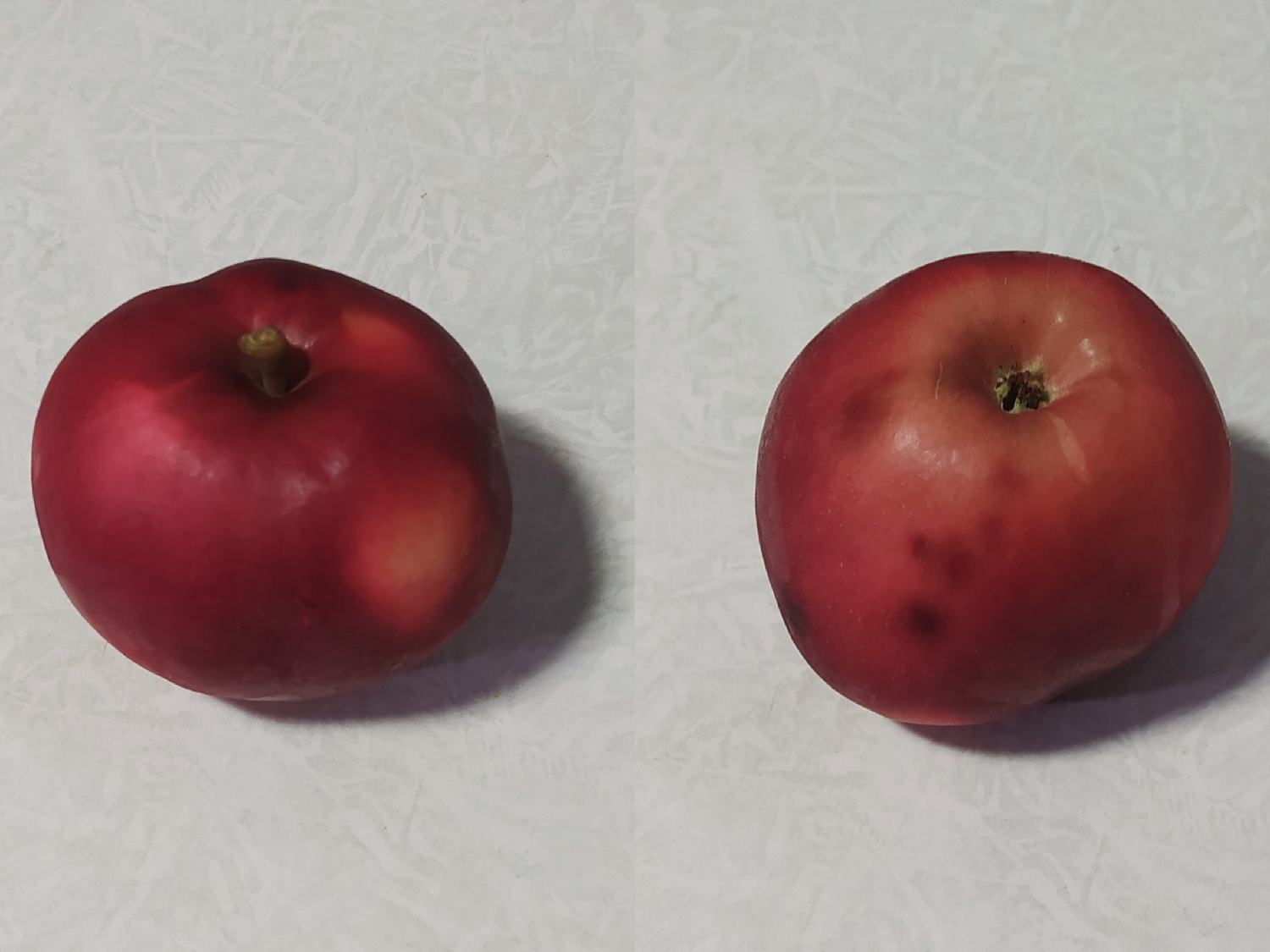 В тот же вечер нашел ещё под соседним деревом пару сигналок Энтерпрайза. Вот это действительно плохой знак, не должен этот сорт осыпаться так рано. На плодах видны небольшие точки пятен горькой ямчатости, хотя было несколько обработок проверенными препаратами кальция, причем в хелатной форме. На других сортах, склонных к этой проблеме (например, Сябрына), таких пятен нет. Посмотрим как поведут себя оставшиеся на дереве плоды, но что-то мне подсказывает, что этот вариант хорошей перспективы не имеет.