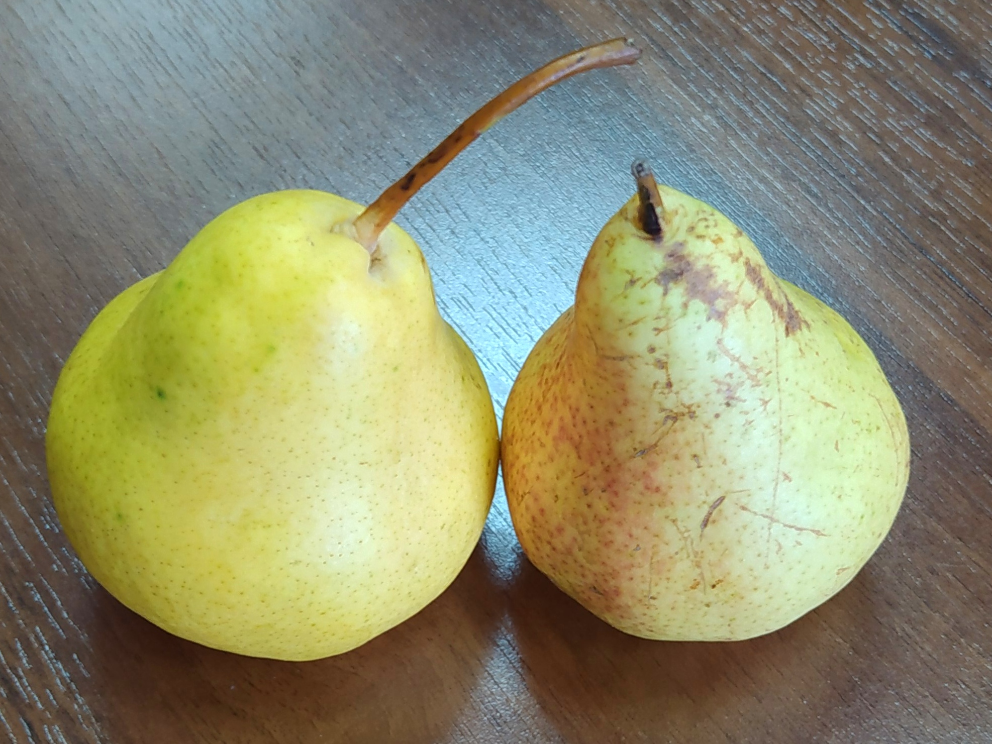 Вкус очень хороший у обеих сортов, сладкий, груши с маслянистой мякотью. У Дево желтовато-зеленоватая с прожилками у Виктории желтая.