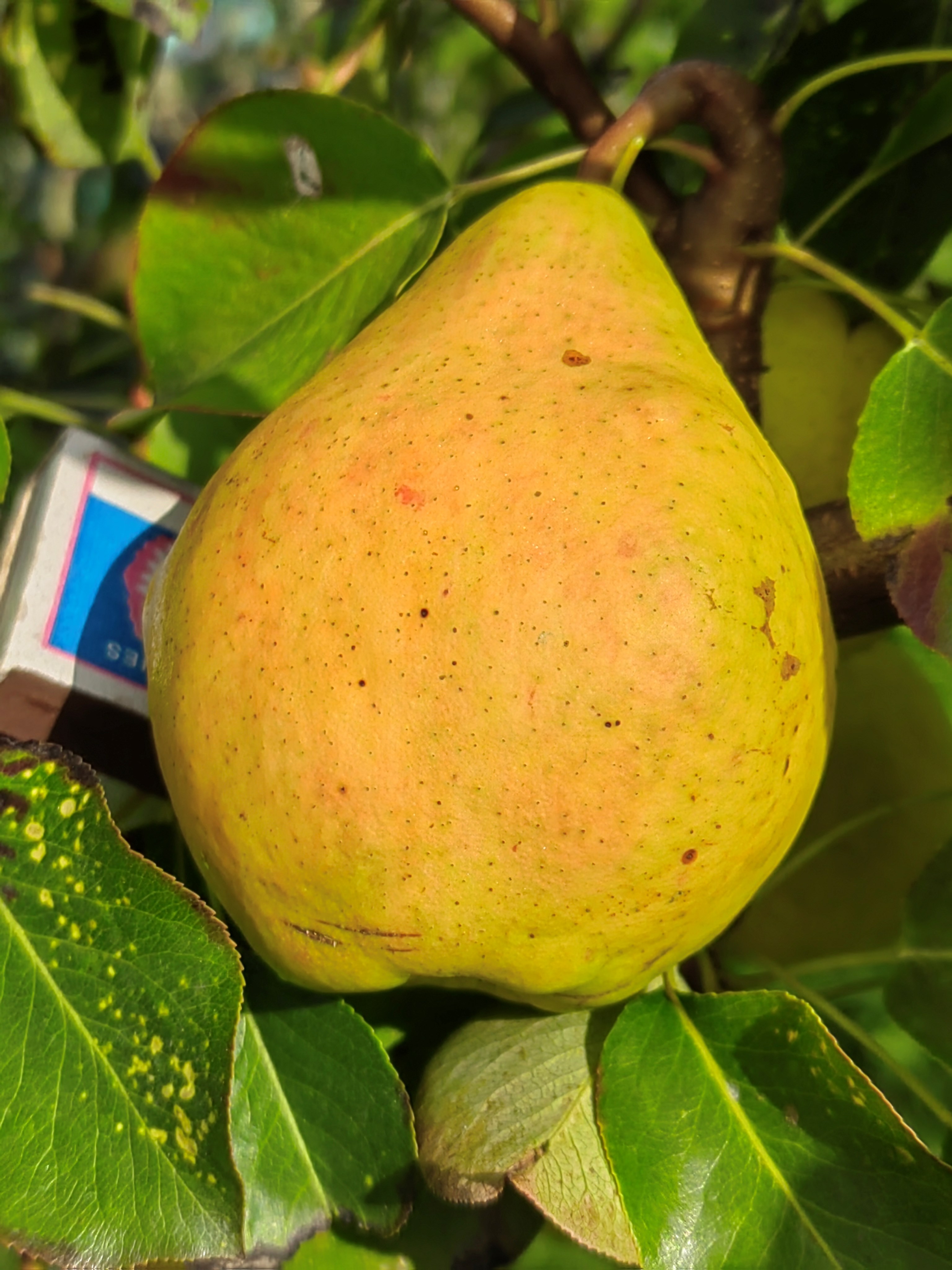 Вчера довелось наблюдать довольно взрослое дерево Есенинской, растущее уже более 20 лет в Домодедовском р-не МО. Высота примерно 6-7 метров (по описанию ВНИИСПК сорт средней силы роста), диаметр кроны не менее 4 м, толщина ствола у основания более 30 см. На данный момент все плоды созрели на дереве, но продолжают висеть. Лишь с нижних ветвей были сняты хозяевами. На дегустацию попали немного перезрелыми. Очень насыщенный сладкий вкус с небольшой кислинкой, едва заметная терпкость. Для сидра точно будет в самый раз)ДимаКо писал(а): ↑01.04.2023, 19:54 Разговаривал сегодня с автором Есенинской, Евгением Алексеевичем Долматовым (до прошлого года- заведующий лабораторией селекции, сортоизучения и сортовой агротехники груши ВНИИСПК). Вот что он сказал. Сорт достойный, плоды 120-130 г, вкусные, очень сочные, сладкие с кислинкой, с приятным мускатным ароматом. Мякоть полумаслянистая. Из плодов сорта получается очень вкусный перри (грушевый сидр). Он считает, что можно выращивать в МО деревом, морозостойкость до -35’С. Зимой 2005/6 годов при минимальных -38’ было подмерзание до 3х баллов.