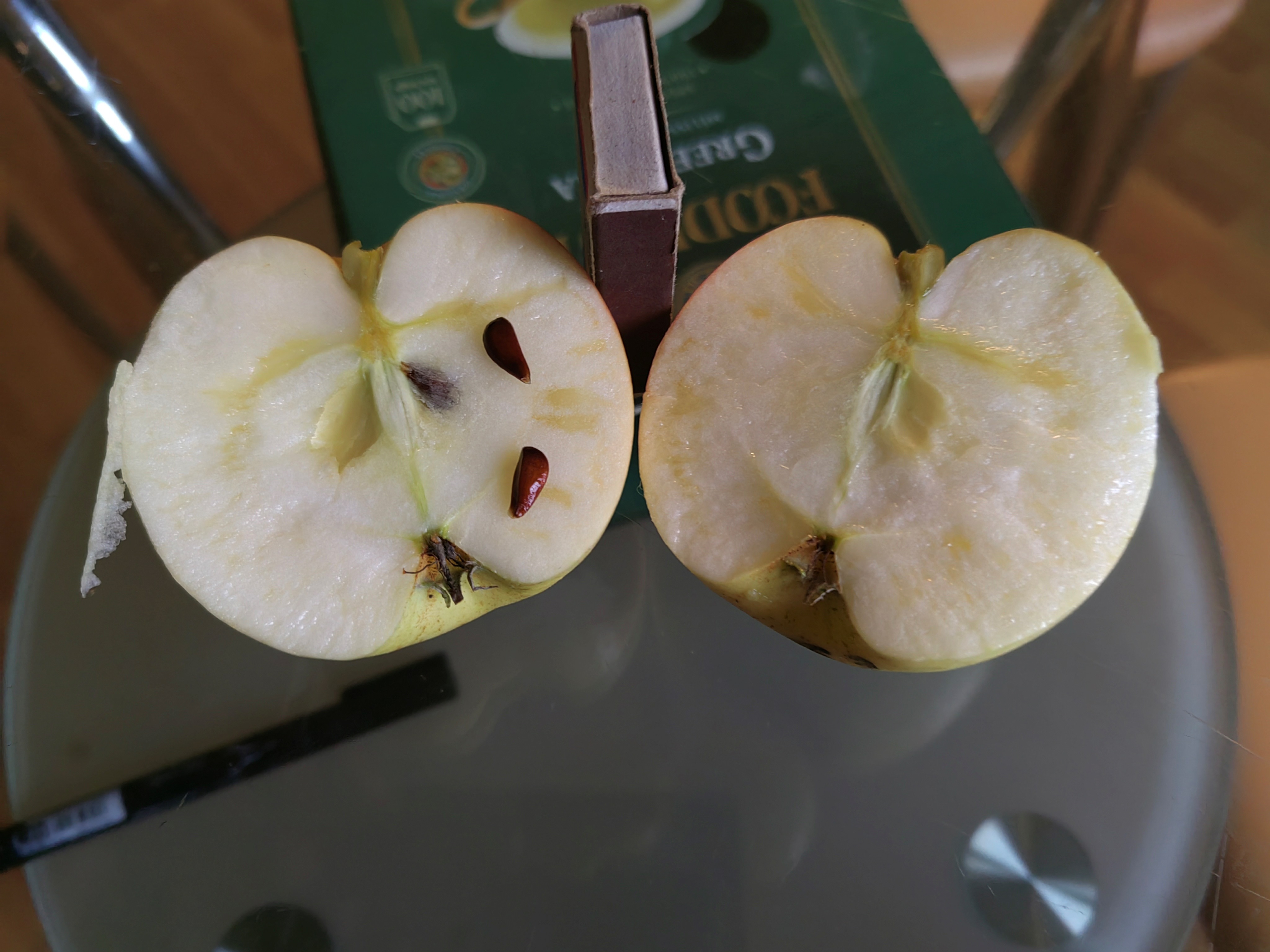 Не стали перепрививать из-за очень хорошего вкуса, высокой урожайности и хранения около 6 месяцев. Созревает 20 октября, на сегодня готово для съёма на хранение. Мякоть очень плотная, очень сочная, кисло-сладкого вкуса. Сахар пока 13,5’Brix. Д.о. 4,6. На уровне Брянского, но с более твёрдой мякотью. . .