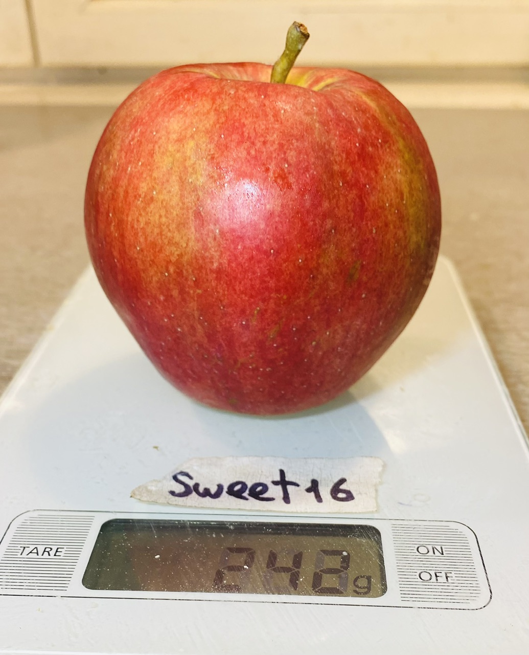 Свит 16- очень вкусные яблоки. Мякоть плотная, сочная, похожа на ХК, но менее грубая, насыщенного сладкого вкуса с приятным привкусом. Не ожидал. Сахар 17,6°Brix. Уверенно 4,7. Поставил бы и выше, но многие сорта ещё не пробовал, оставляю место.