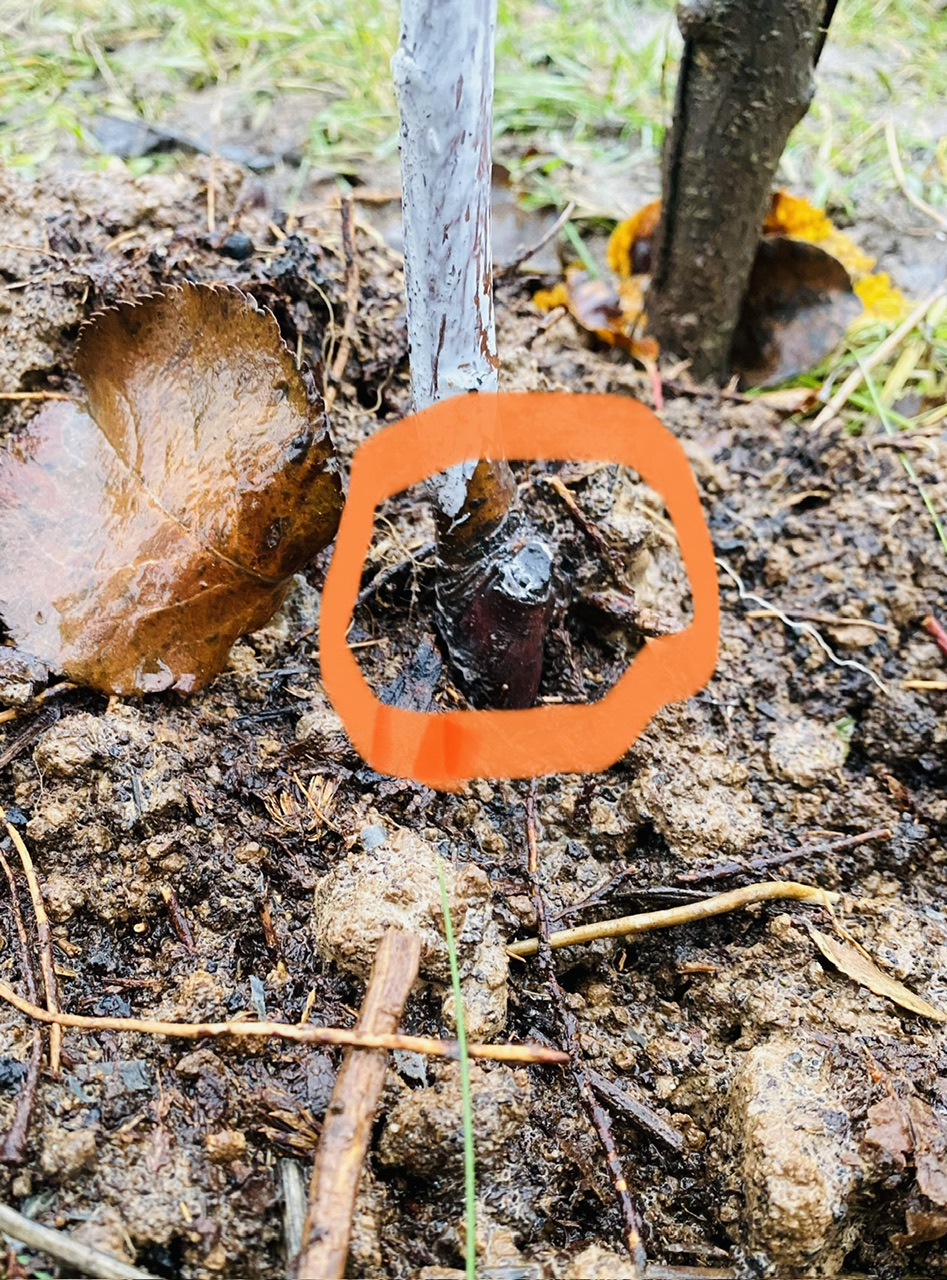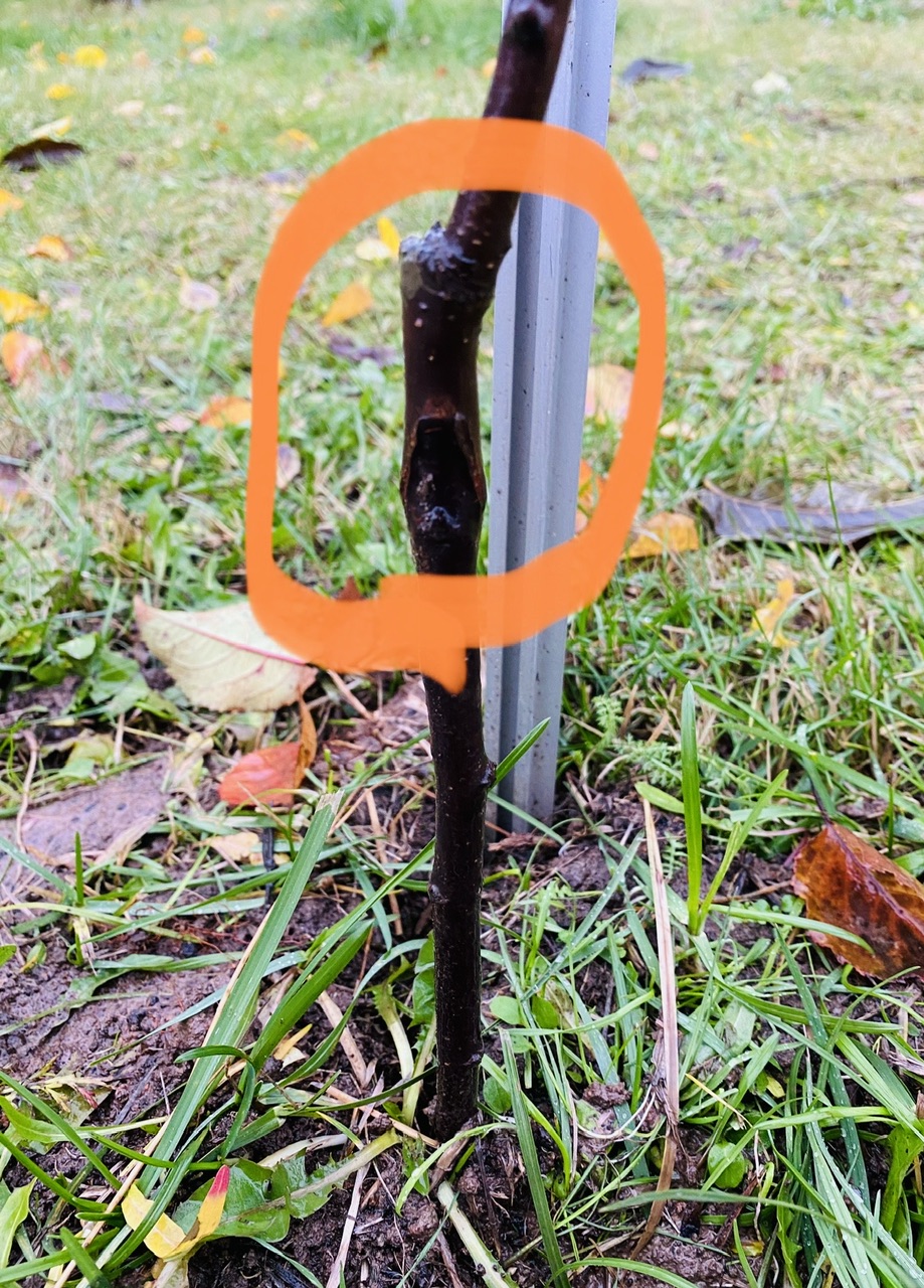 На фото-саженец Ольховича, привит на высоте 45 см, посажен с заглублением 25 см. .