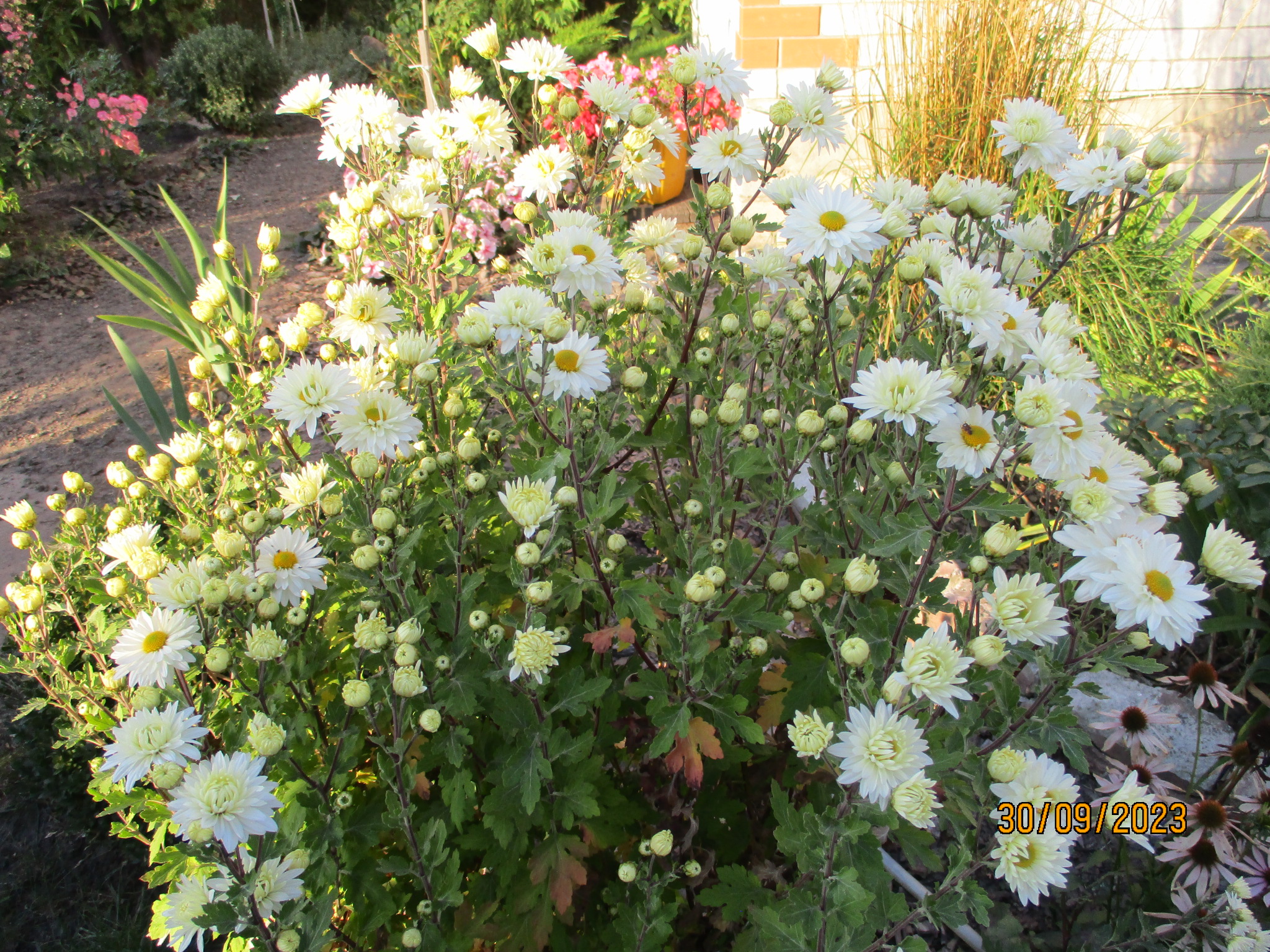 В прошлом году у меня все хризантемы вымерзли. Накупил новых. А самая крупная белая хризантема, цветущая огромной шапкой, вымерзшая в прошлом году, цвести отказалась почему то (дома черенки были, снова посадил)