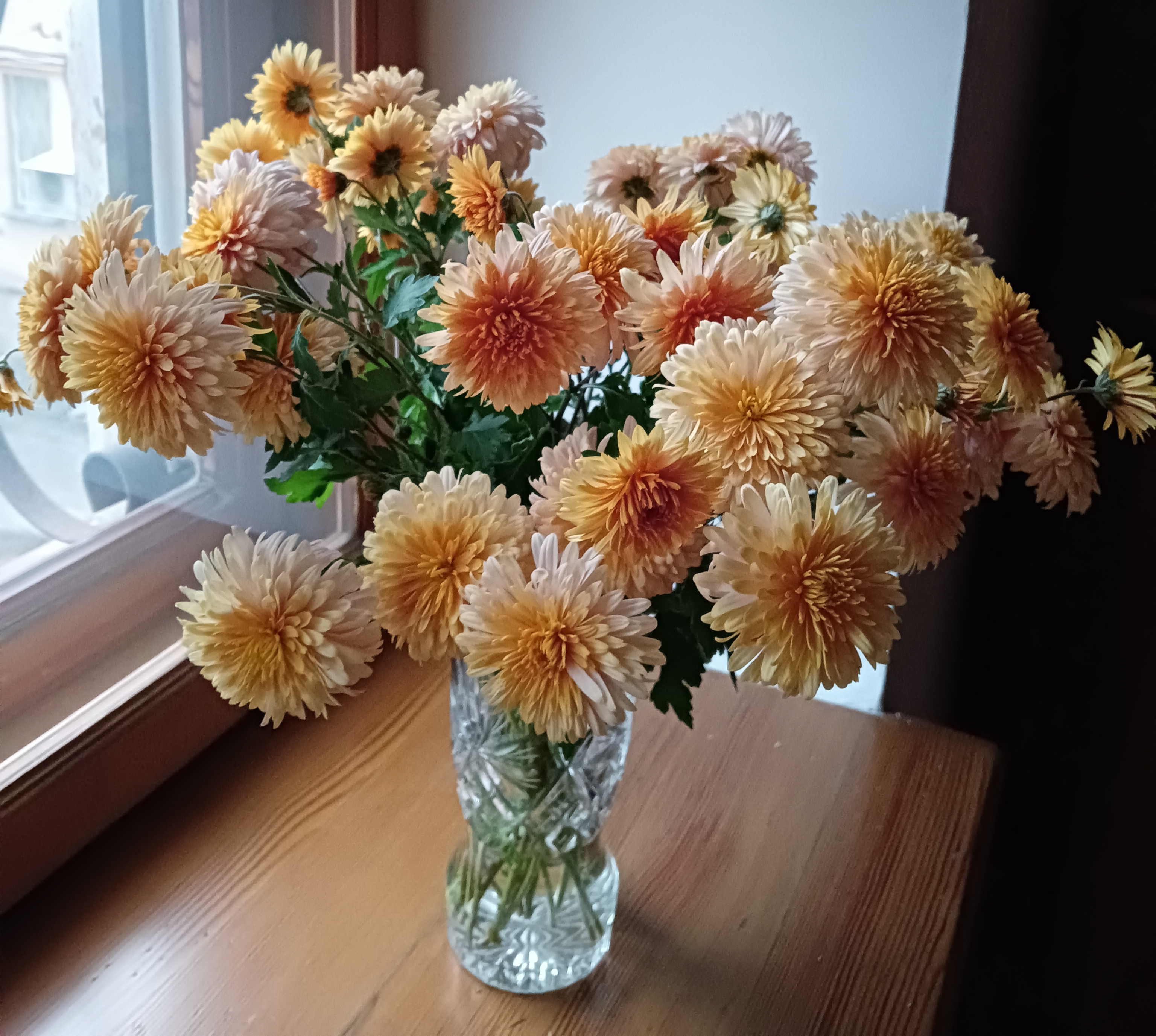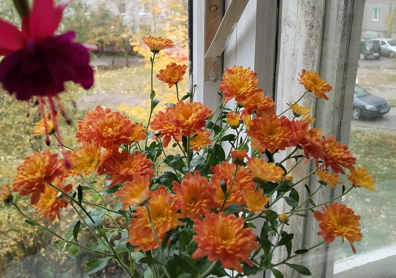 Последний сорт корейских хризантем цветет. В прошлом году не цвели в саду, срезала в бутонах в конце октября - раскрылись дома и простояли месяц.