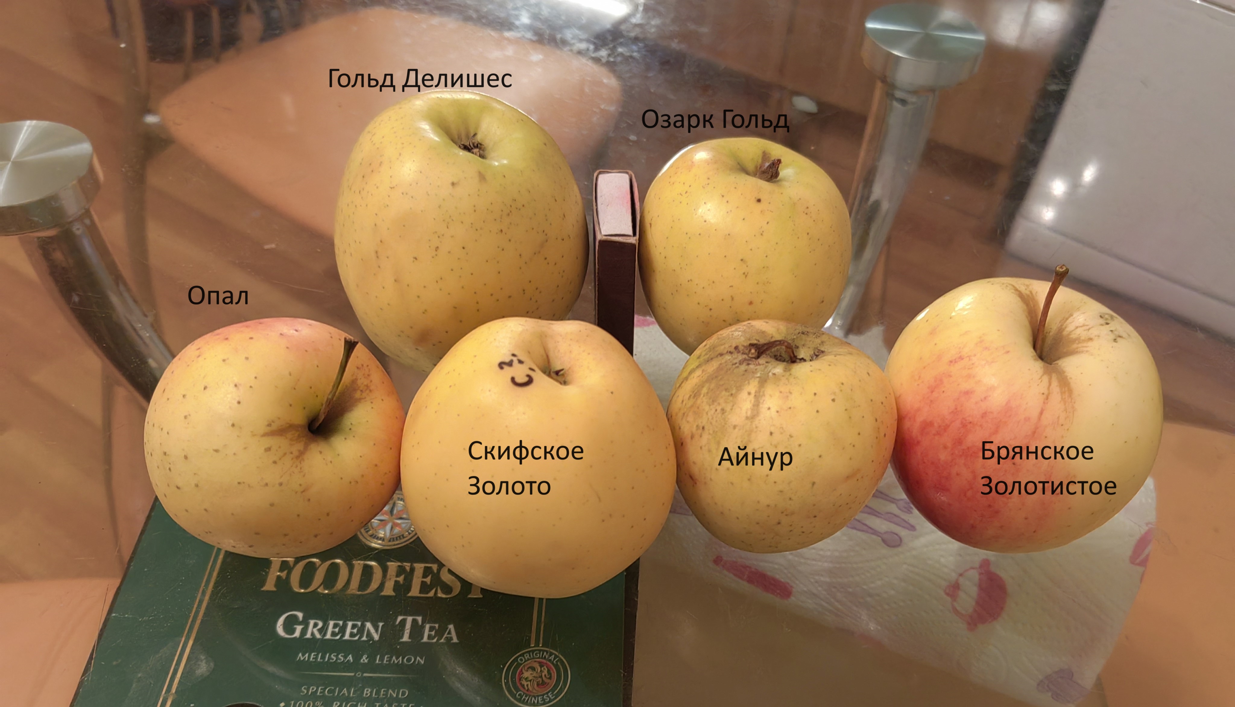 В погребе некоторые яблоки начали желтеть, решил продегустировать, в магазине для сравнения взял ГД(выбрал пожелтее).ГД, мякоть уже пошла, яблоко вкусное,но приходилось пробовать ГД и в лучшей кондиции.Озарк Гольд, самая твердая мякоть, очень хороший вкус, Опал, твердая мякоть ,очень хороший вкус.Скифское золото,мякоть помягче, очень хороший вкус,отличный внешний вид.Айнур, твердое , очень хороший вкус.У всех свой индивидуальный очень хороший вкус, выделить кого то трудно.Брянскское золотистое,твердое,сочное, по вкусу до остальных не дотягивает.