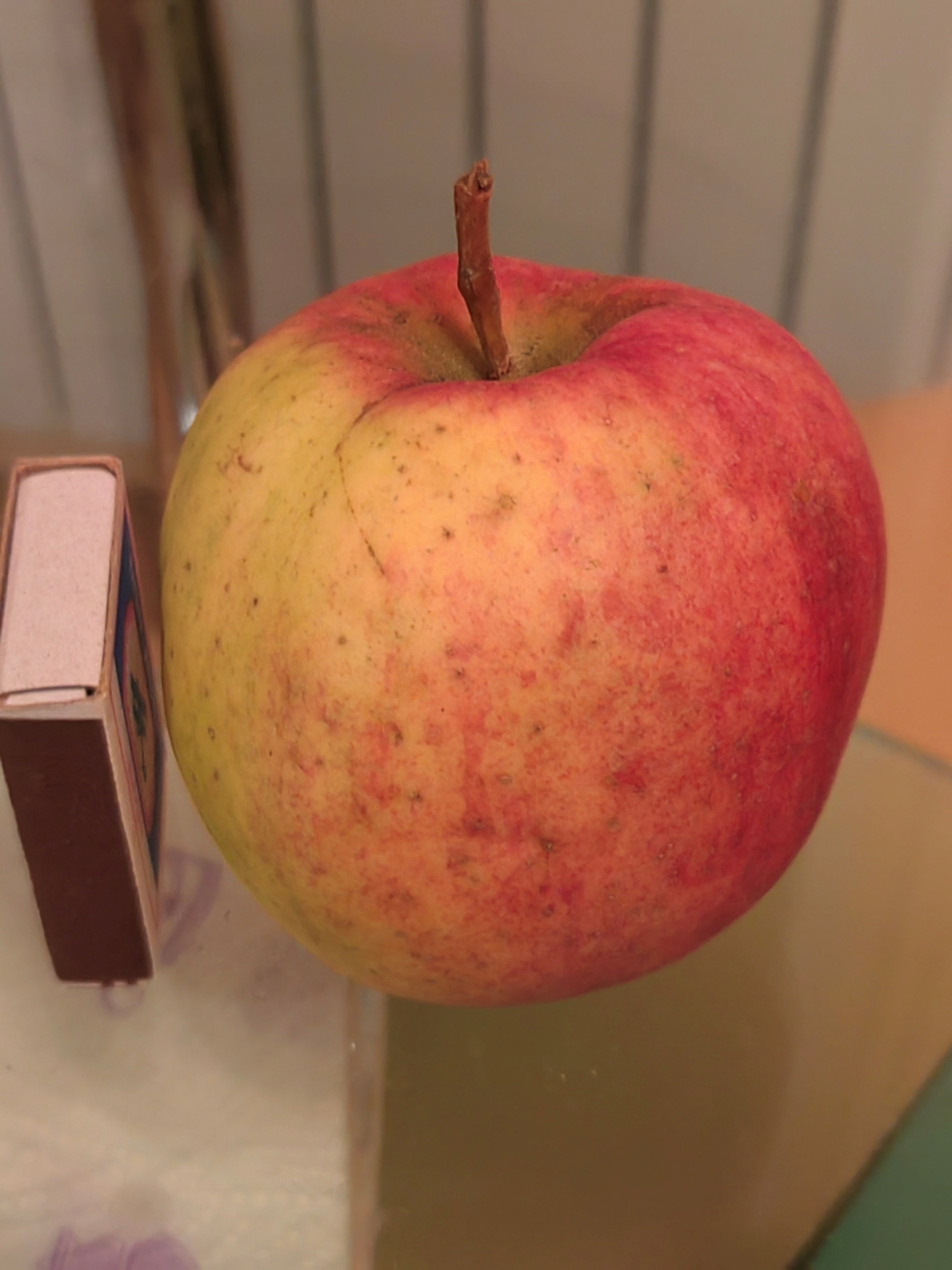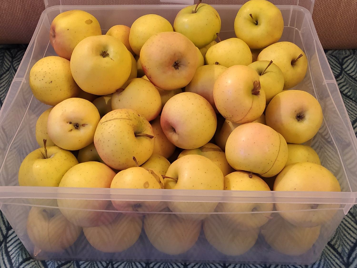 Решил попробовать Луну из нового урожая. На пятом году жизни дерево начало радовать заметными объемами. Удалось решить проблему прошлого сезона - поражение плодов горькой (чечевичковой) гнилью, характерную для многих сортов, производных от Голдена, даже иммунных. Помогли поздние обработки фунгицидами в конце лета и начале осени. Впервые использовал в саду комбинированный препарат Геката (т.н. "улучшенный Скор"). Хотя, полагаю, эффект был бы и от стандартных фунгицидов типа Хоруса или Скора, тут главное сам факт таких обработок. Для наглядности хочу показать не единичное яблоко, а плоды в массе, все они имеют очень товарный вид. Для фотосессии пришлось даже вынуть ящик из холодильника.