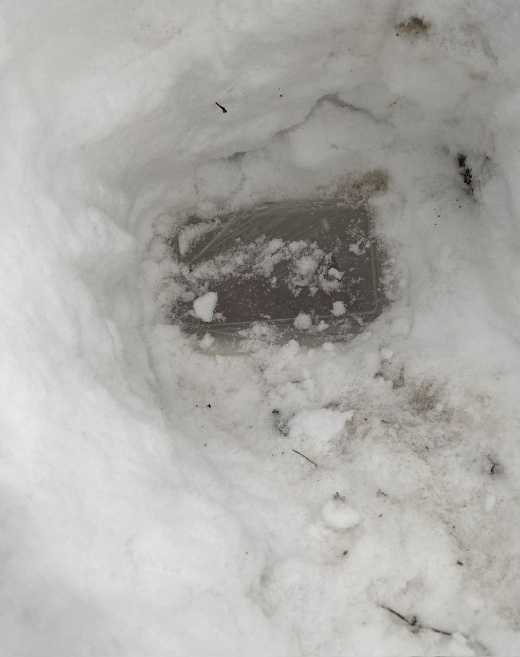 На фото- контейнер с яблоками Имант, в углублении ниже уровня земли под снегом.
