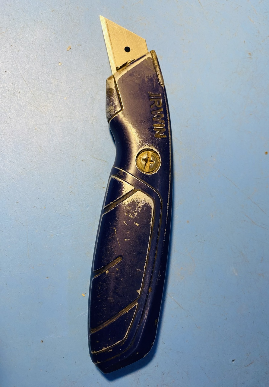 Начните с обыкновенного выдвижного трапециевидного или канцелярского ножа со сменными лезвиями, которые продаются в строительных магазинах. Их затачивать не надо. Сменил лезвие и готово.