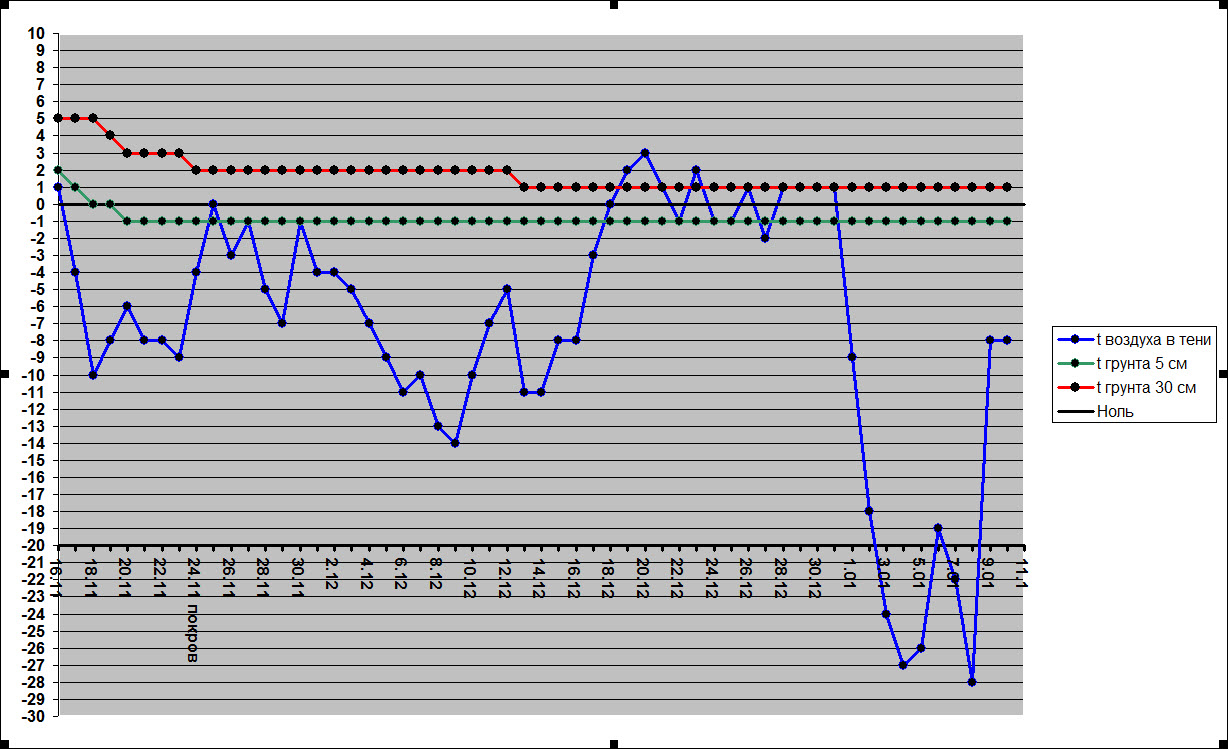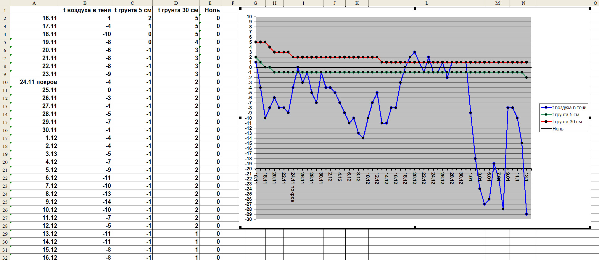 А два года назад обе температуры (на глубинах 5 см и 30 см) сумели забраться немного в минус (начало графика Narodmon).