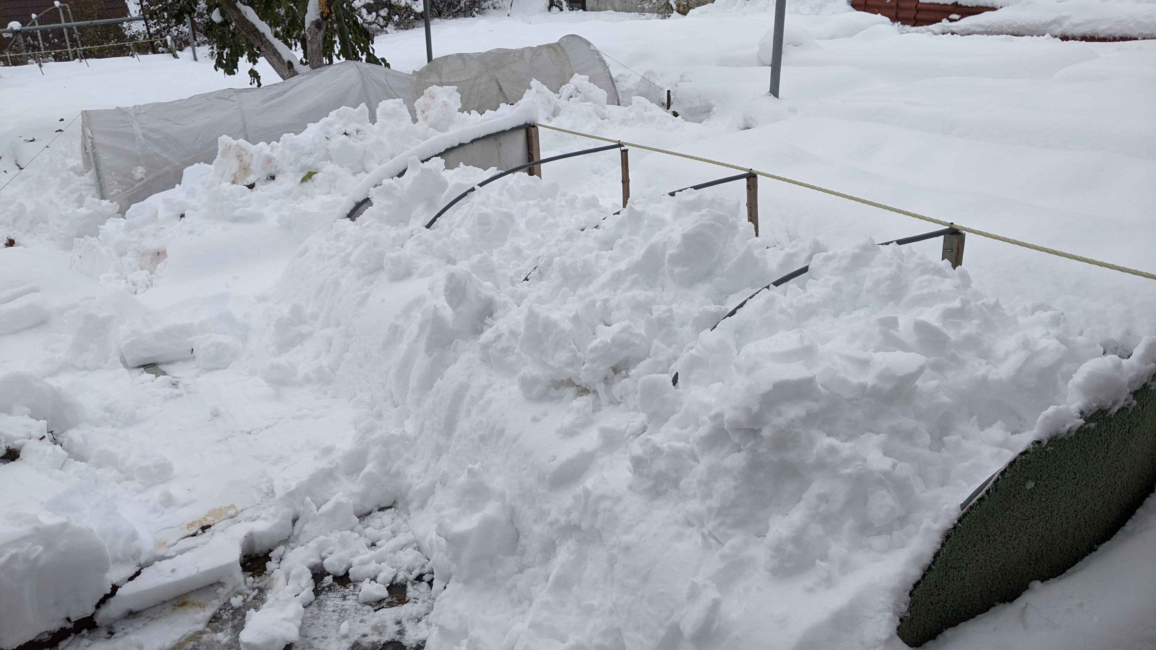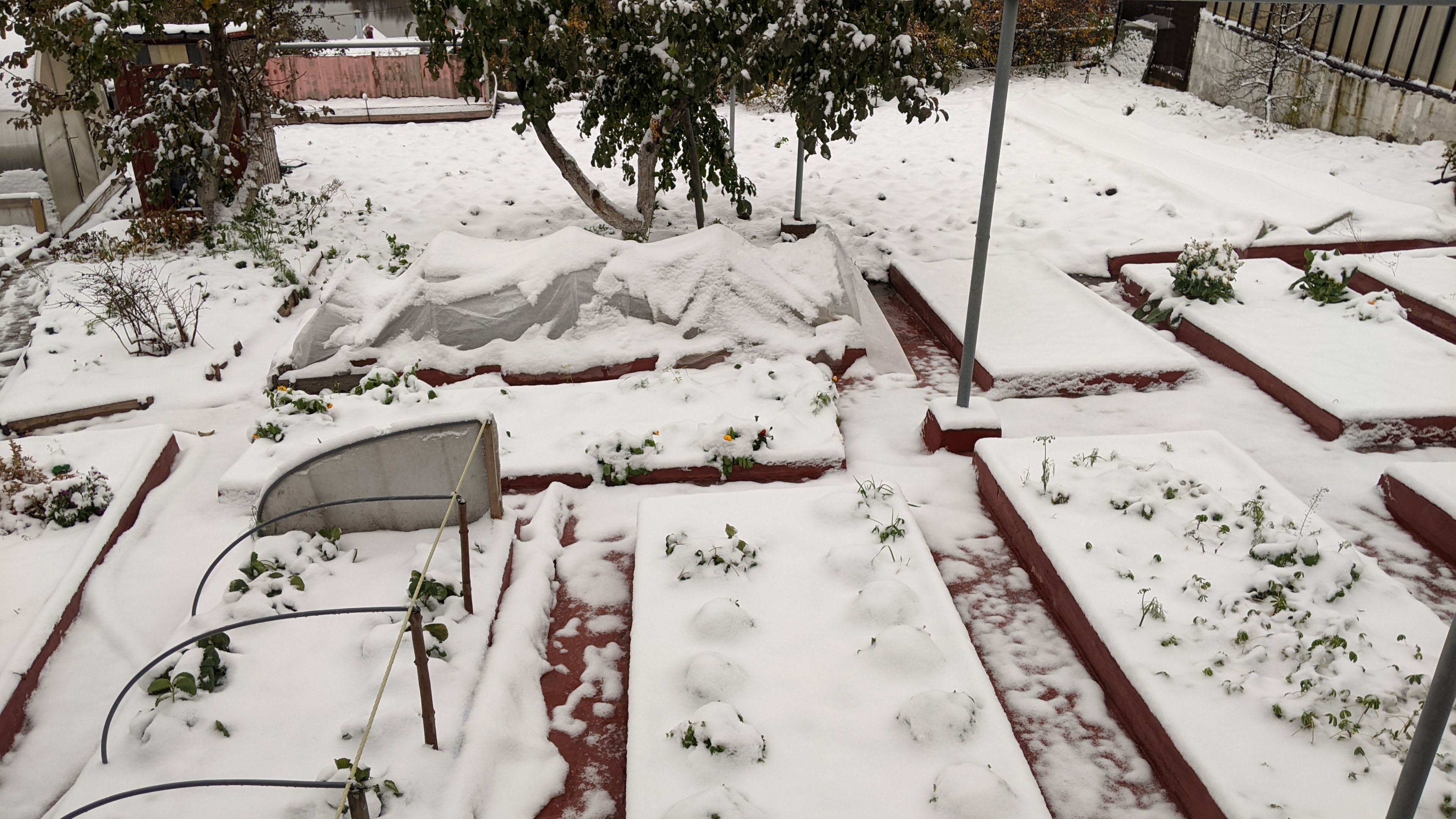Уже поставил по краям грядок БУ-шные панели ПВХ шириной 27 см. Укрытие намотаю на ПВХ-трубу, чтобы можно было оперативно смотать - размотать. Местами между кустиками можно будет разложить кучки мха, чтобы под НУМом при наличии толстой подушки снега осталась небольшая воздушная прослойка.