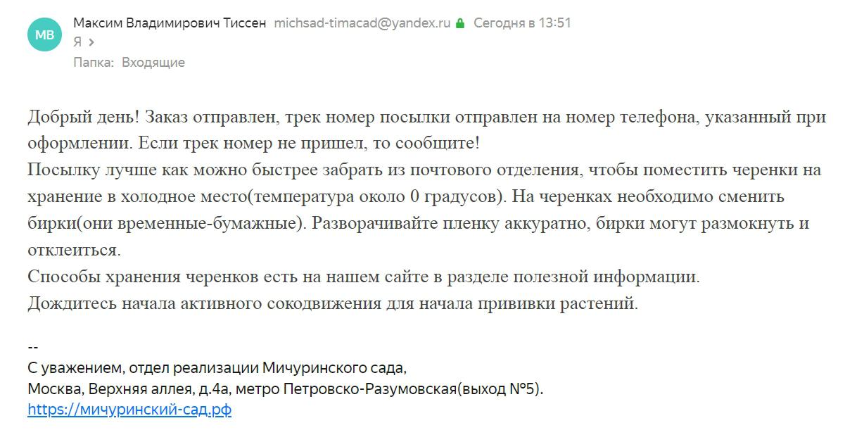 А, точно, соврал случайно (точнее, перепутал по давности). Не Сады Мордовии, а "Саженцы-и-семена.рф". В Садах Мордовии я делал заказ рассады тогда же. Там другие вопросы были.
