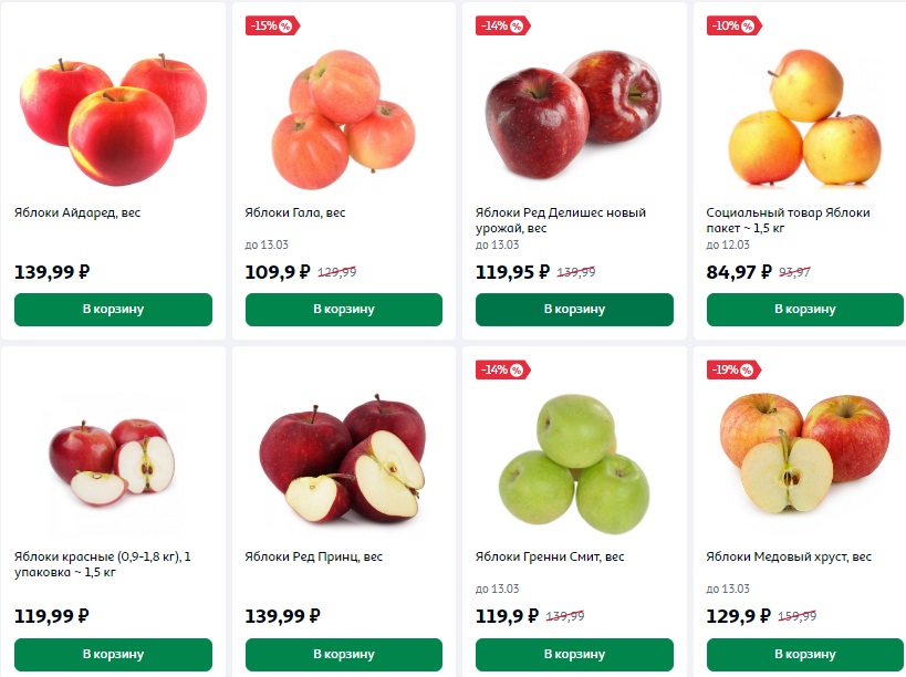 Честно говоря, к магазинным ассотриментам особо не присматривался. Своих яблок хватит еще минимум на месяц, хотя урожай был не самый богатый. Сейчас у всех торговых сетей есть свои сайты с каталогами товаров. Вот, например, текущие предложения Ашана. Лигола нет)