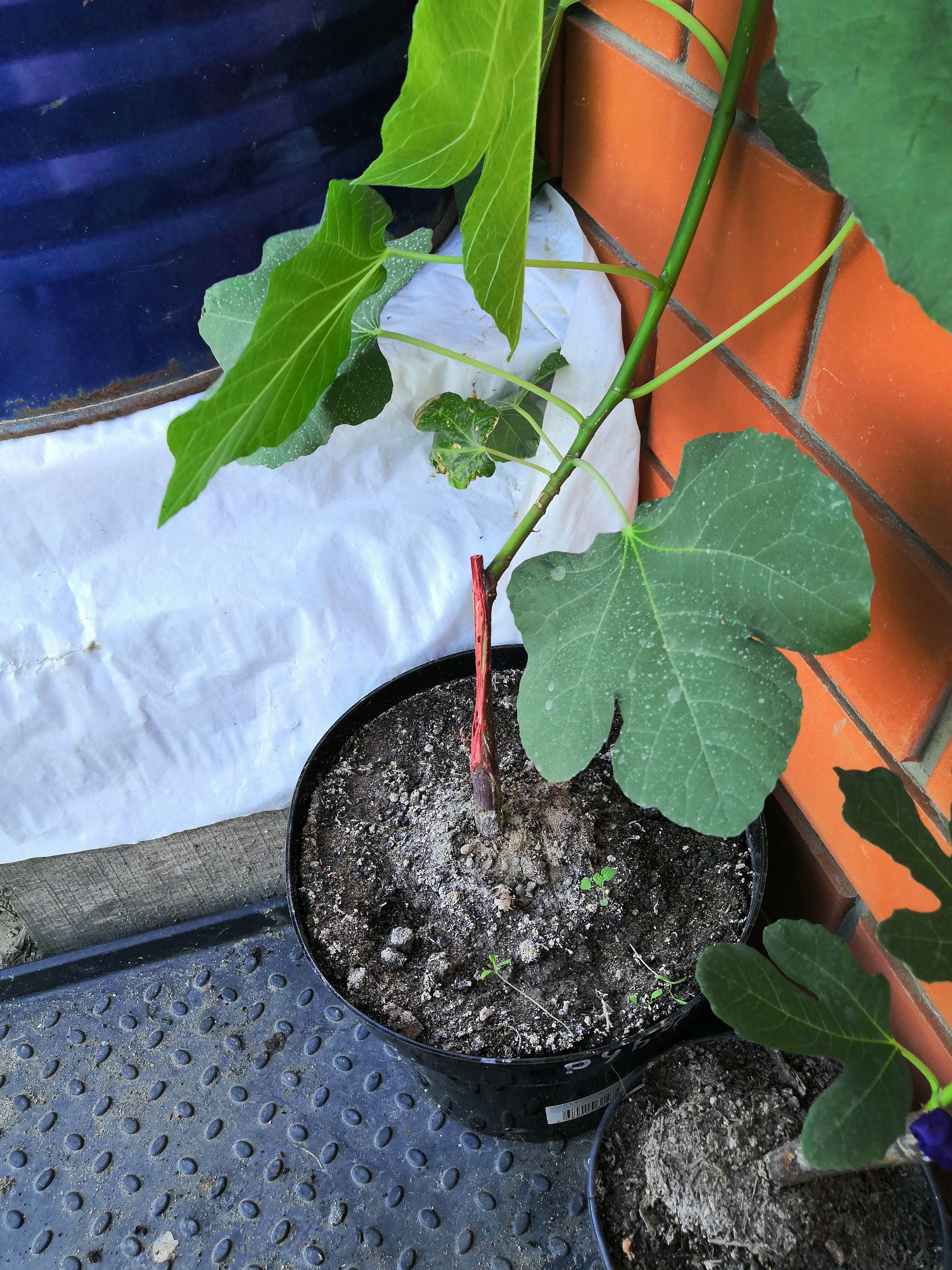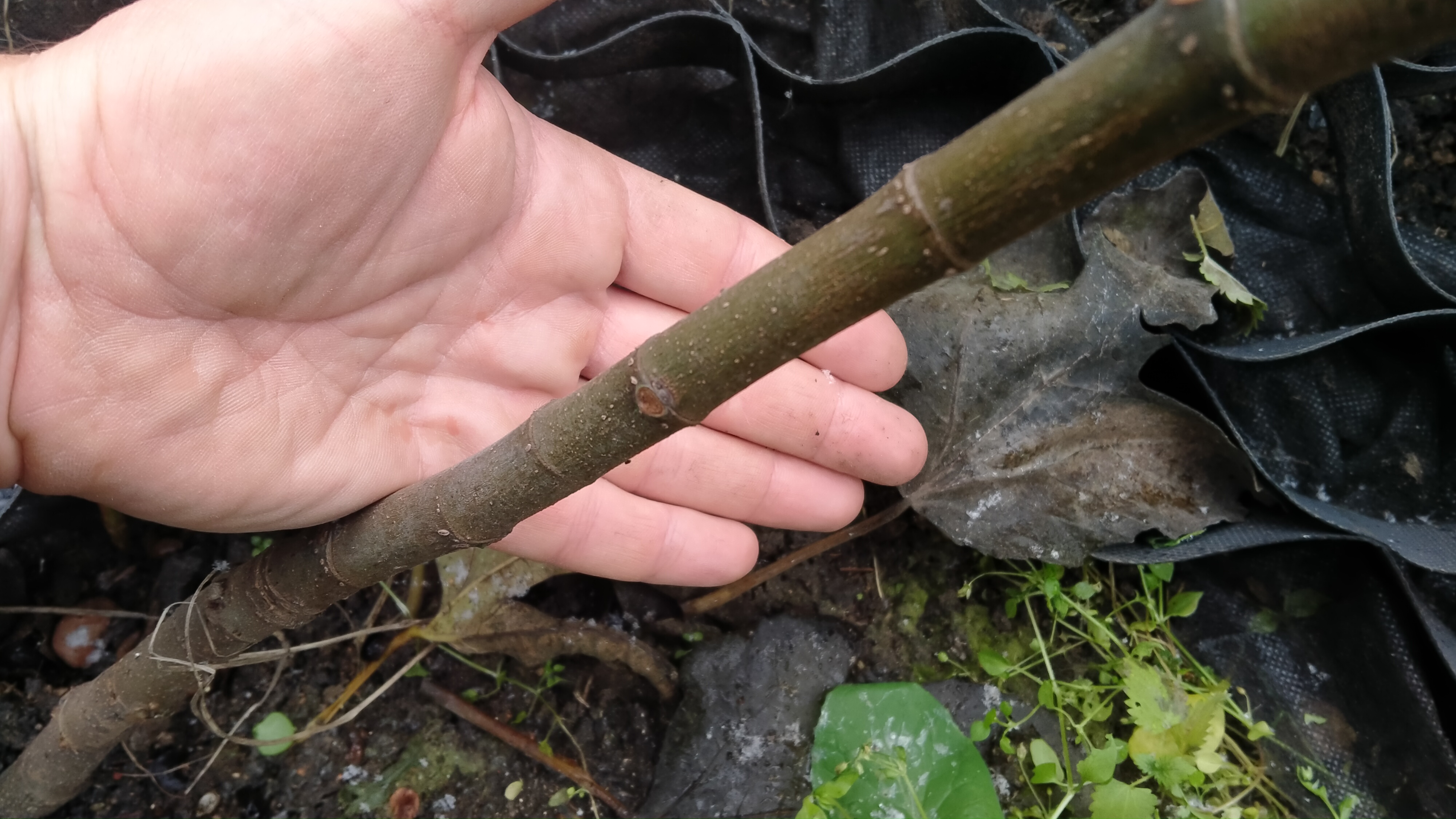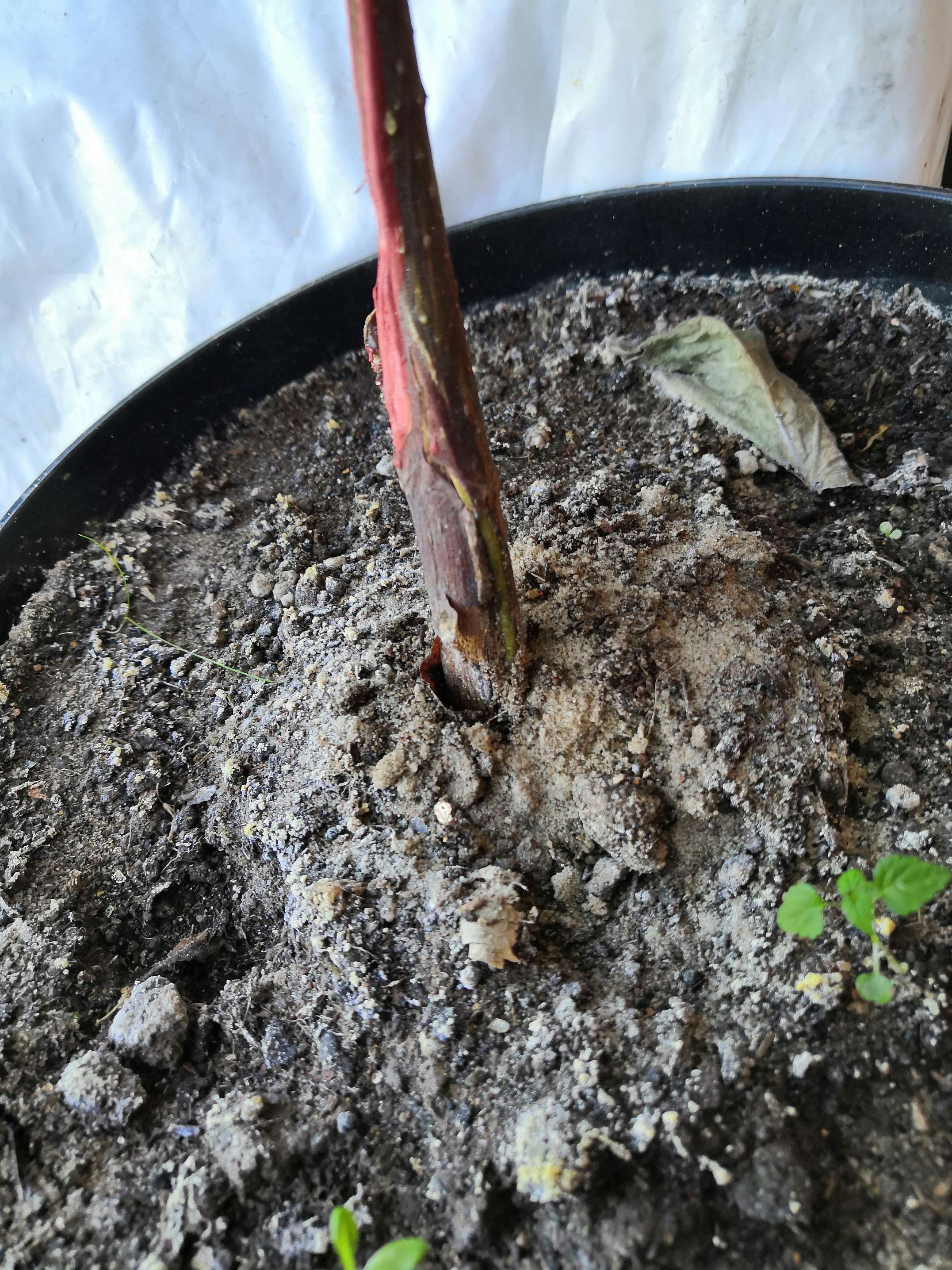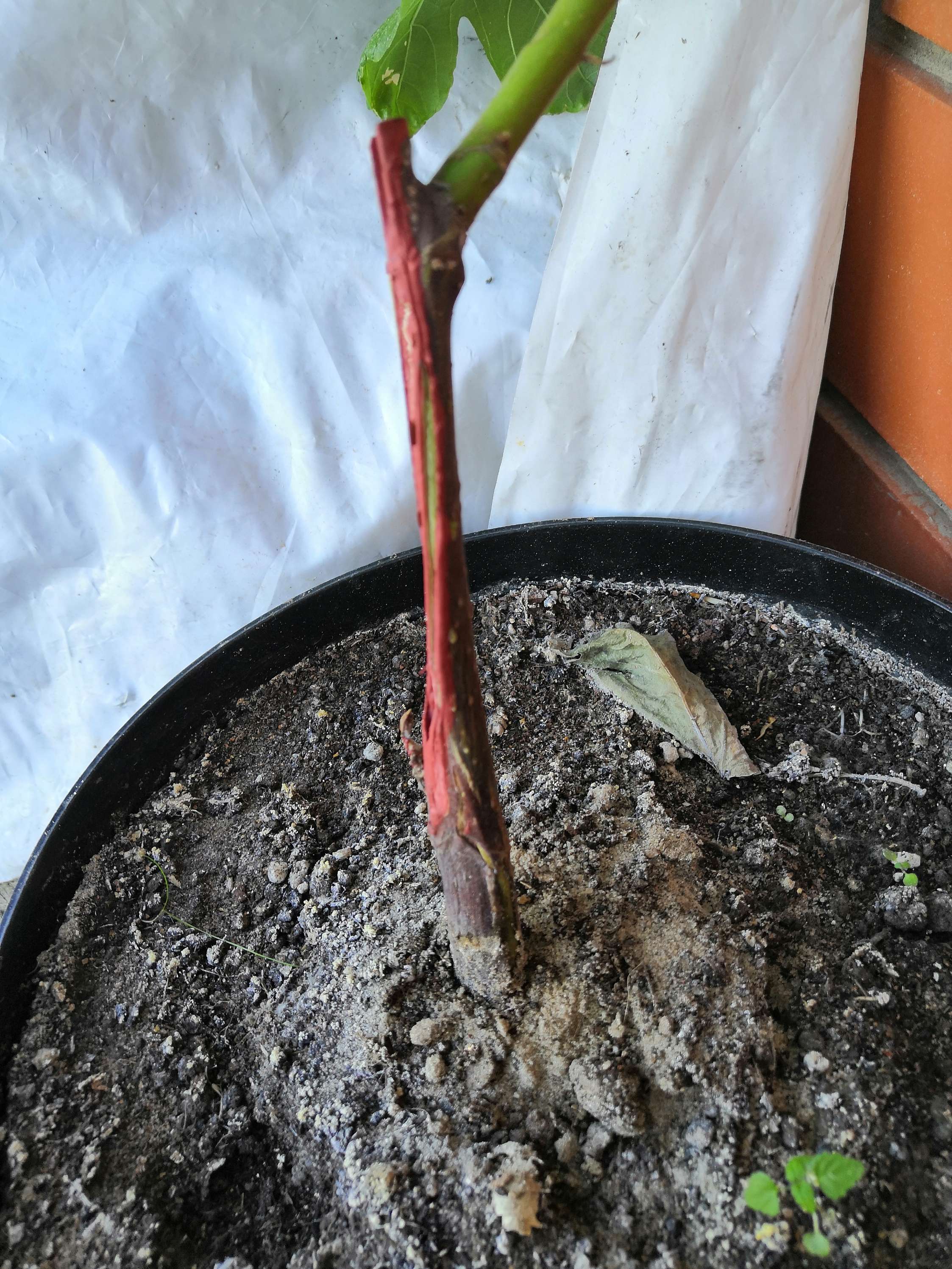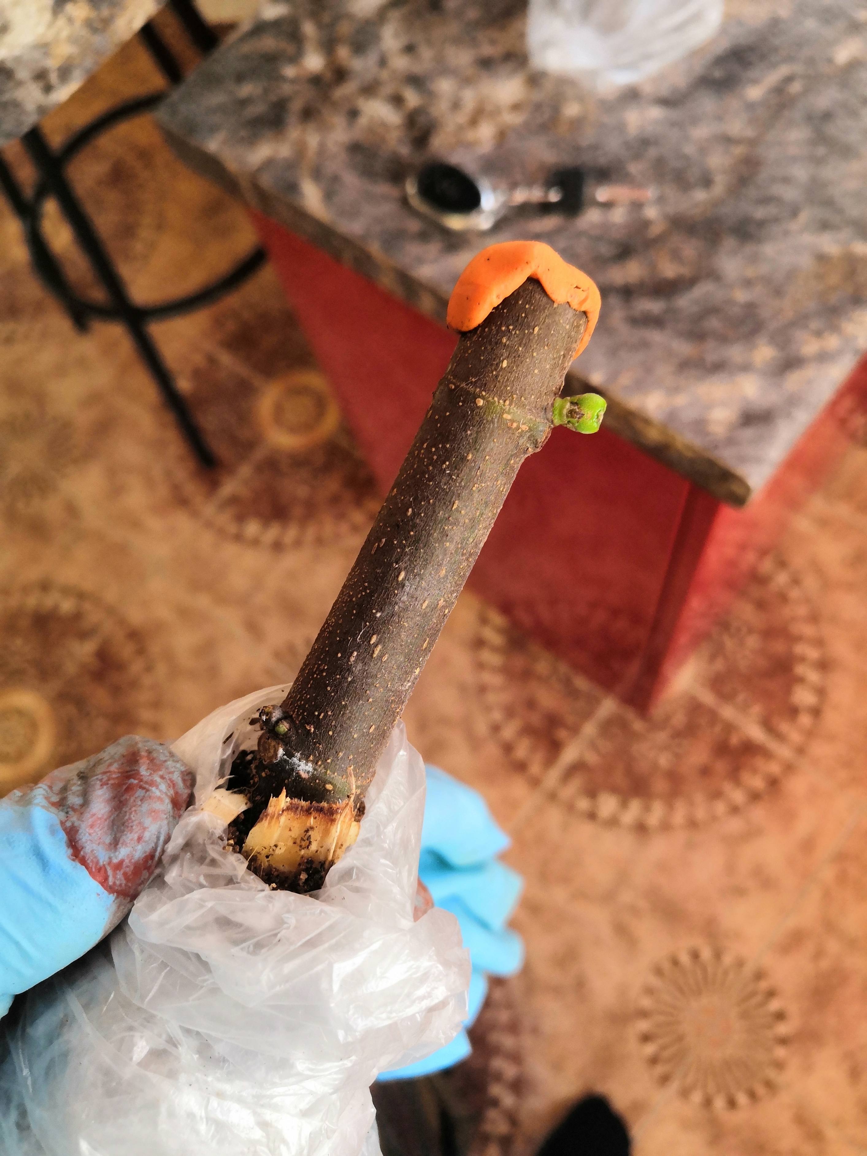 Укорененный черенок инжира вот так выглядит. В процесс загнил, пришлось отсечь измененные ткани, почему-то не отбивает почки от корня, опасаюсь, что отломится... Что посоветуете?