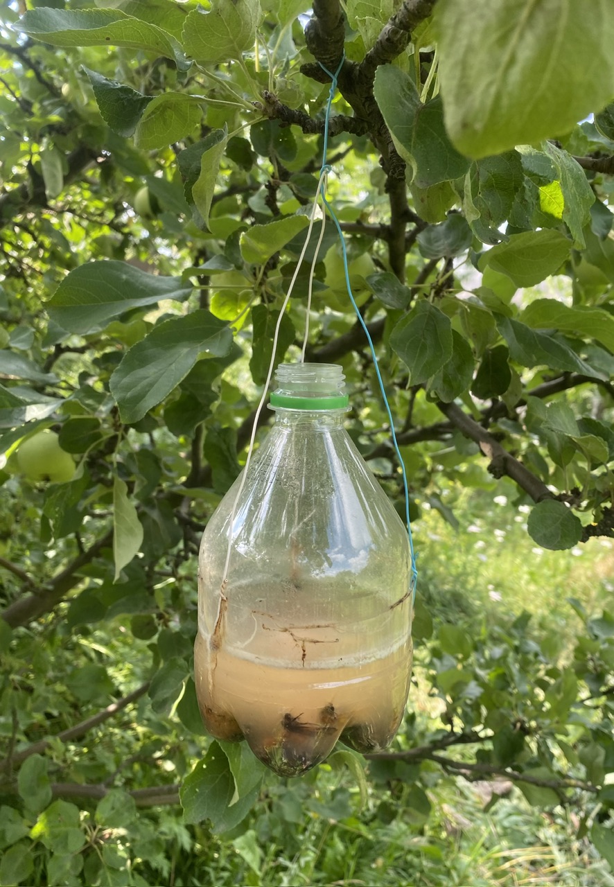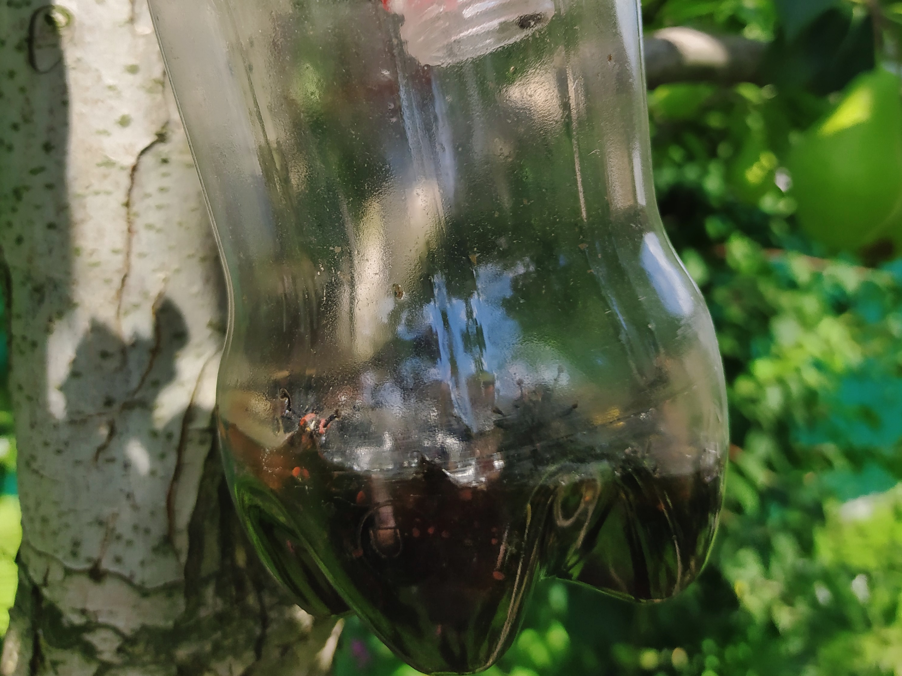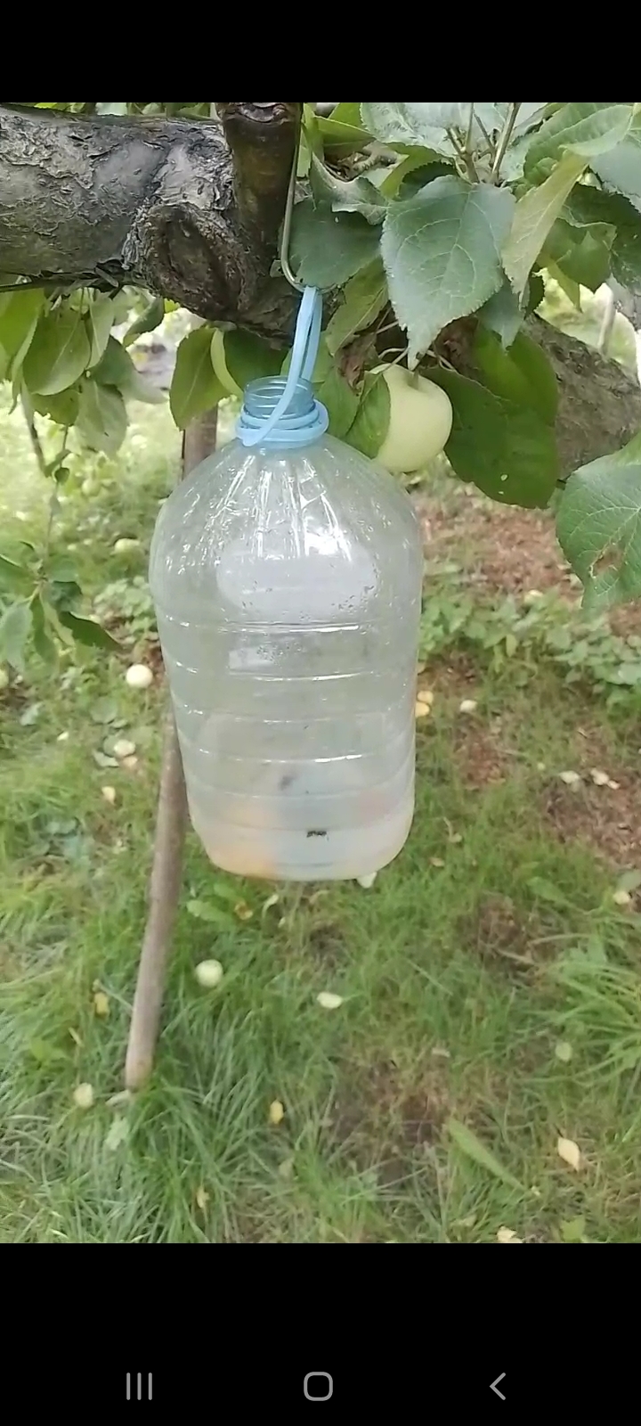 В этом году просто замечательно отработали баклашки с медом от ос (см. выше). Принцип простой если груша сильнорослая на сеянце - одна баклашка на дерево. Если ряд на шпалере - на крайних столбах. Как правило всегда сильнее всего страдают крайние деревья в саду. Ни одной пчелы в ловушках не замечено.