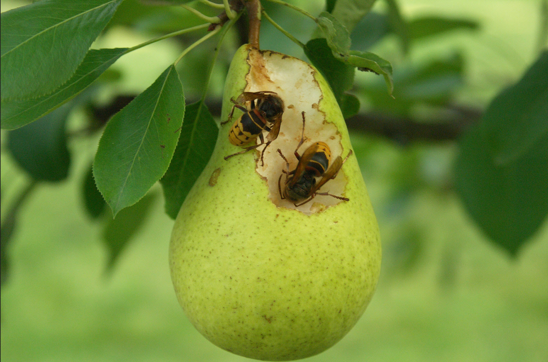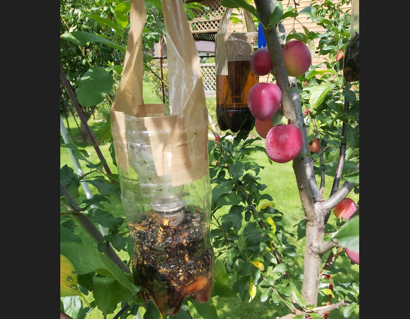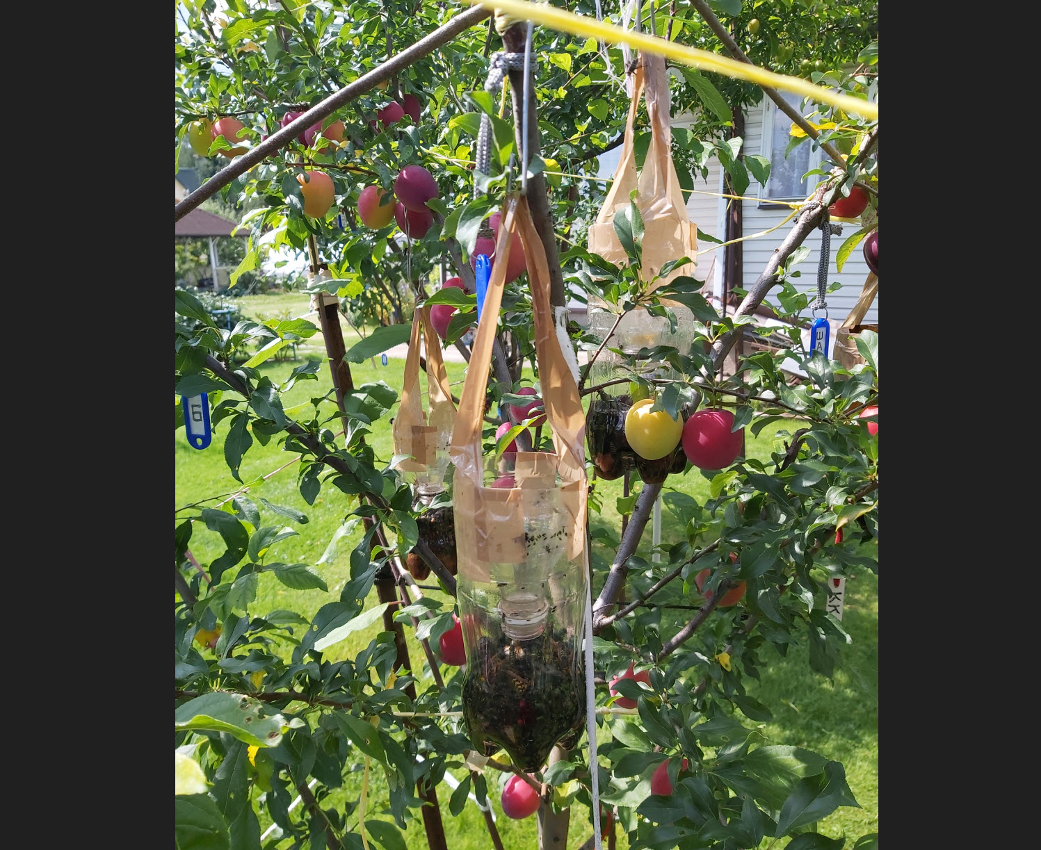 В этом году просто замечательно отработали баклашки с медом от ос (см. выше). Принцип простой если груша сильнорослая на сеянце - одна баклашка на дерево. Если ряд на шпалере - на крайних столбах. Как правило всегда сильнее всего страдают крайние деревья в саду. Ни одной пчелы в ловушках не замечено.