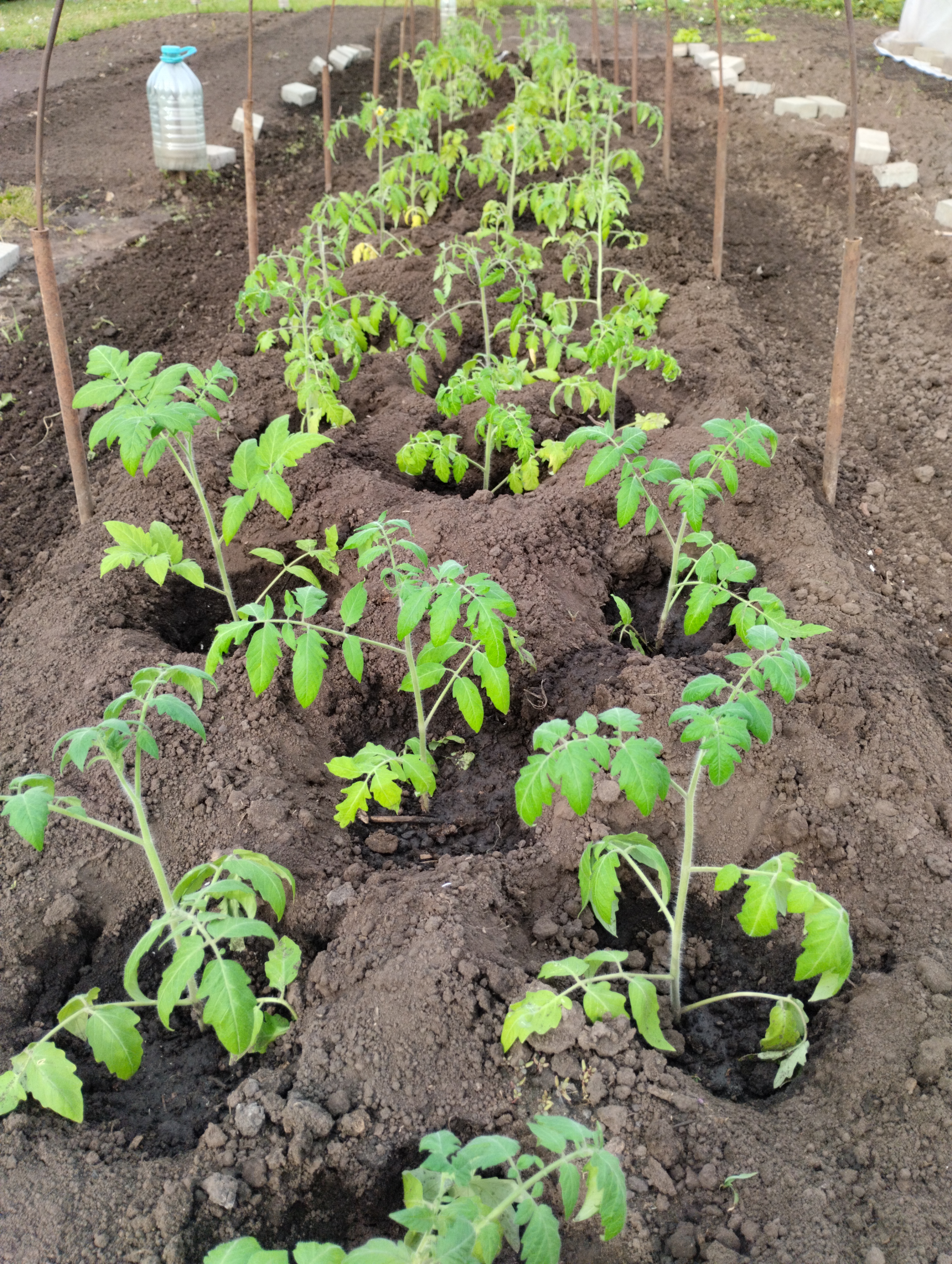 Качает воду, а испарить не может при 100% влажности в закрытом парнике. Укрытия с двух грядок снял. Домашняя листва цела, на одном даже ещё попался семядольный, постепенно отходят 1-2й лист. Посадочные ямки в сеточке корней, присыпал, бугры после посадки все сровнял, дал по листу Фертику томат 5г/2.5л/70кустов. Многие сорта зацвели.