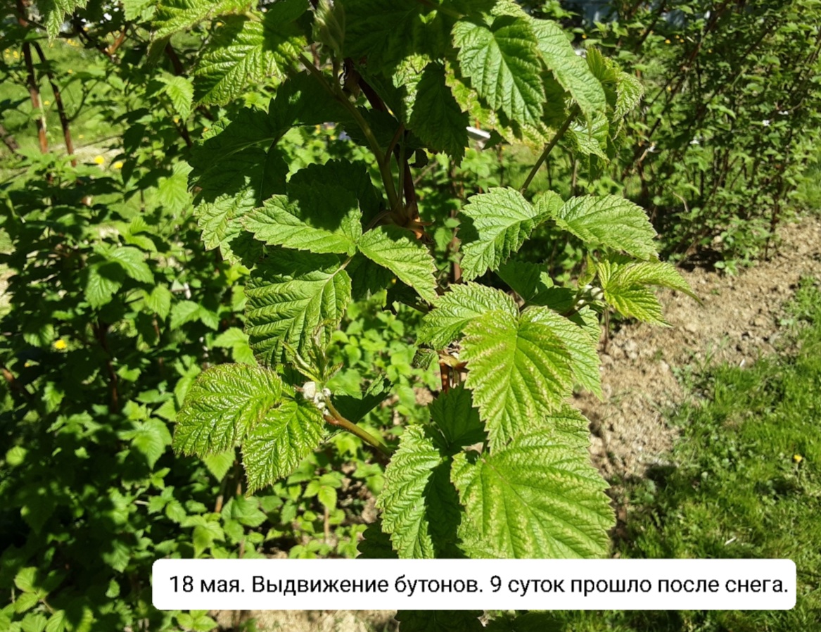Вроде, ничего так. Минус 34 январские кусты не заметили, они под 60-ти сантиметровыми сугробами лежали. А Ярославцев Е.И.(селекционер и зам. директора ВСТИСиП) пишет, что и минус 45 для прикрытой снегом малины не страшны. А заморозки были с 3 мая по 9 мая. Тогда плодовые маленькие веточки уже из почек вылезли, даже листики развернулись. Но бутоны выдвинулись только 18 мая. Т.е., бутоны, цветки не пострадали.