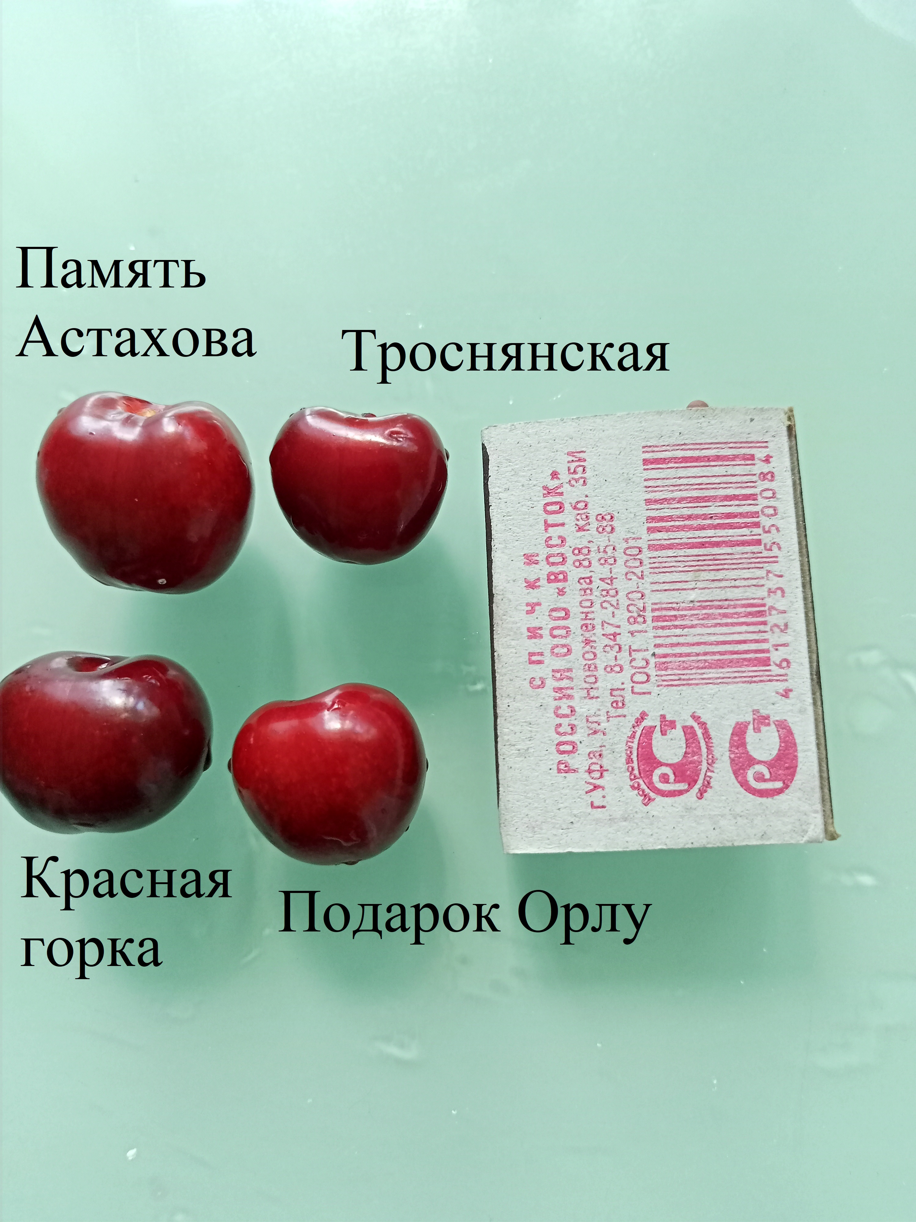 По вкусу: Красная горка, Подарок Орлу и Память Астахова практически одинаковы, сладкая хорошая черешня. Только Память Астахова прям хрящеватая, а Подарок Орлу и Красная горка не такие плотные и больше сочные. Троснянская имеет в послевкусии кислинку, которая её не портит, наоборот делает вкус более интересным. Есть надежды что благодаря этому из неё будет хорошее варенье, на уровне вишнёвого.