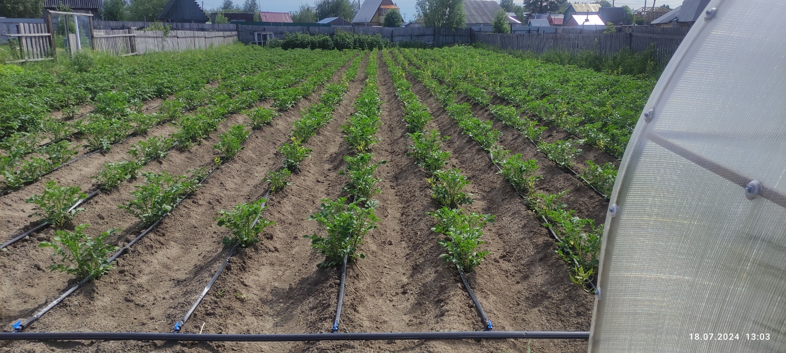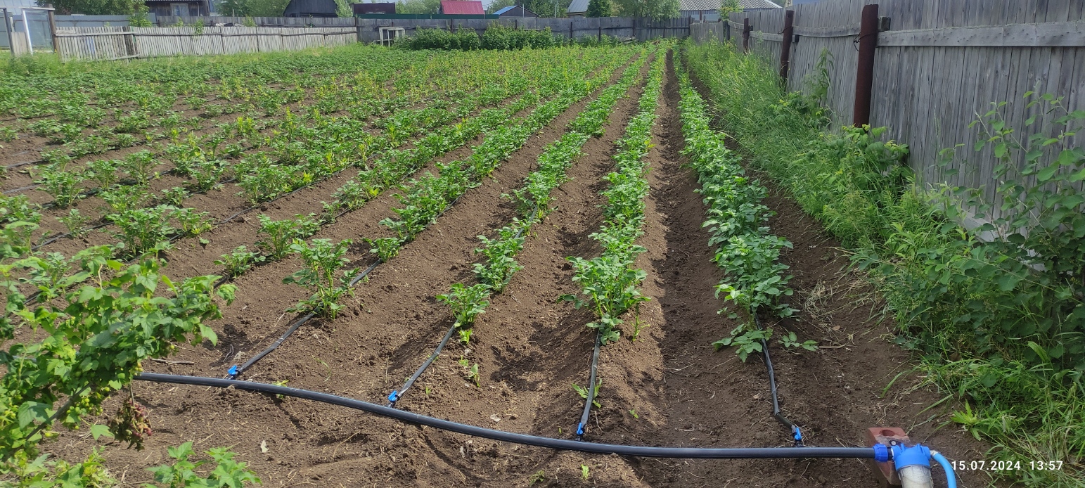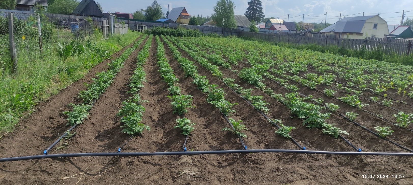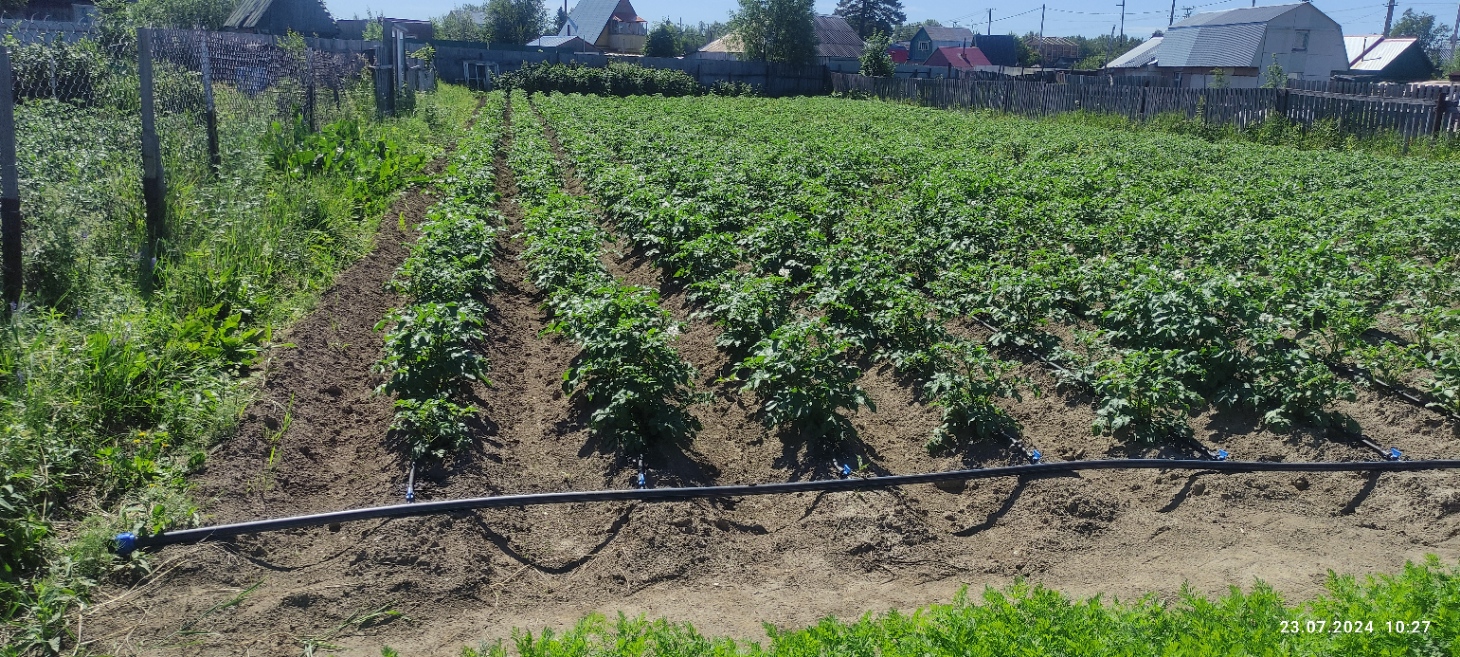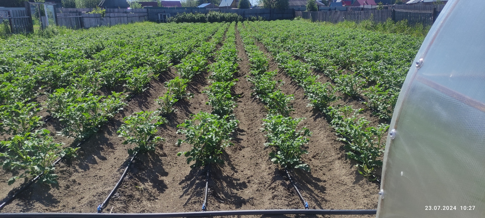 Несмотря на позднюю посадку, надеюсь, что картофель по урожайности наберет товарную массу, тем более прокинут капельный полив - будет регулярно и обильно увлажняться.