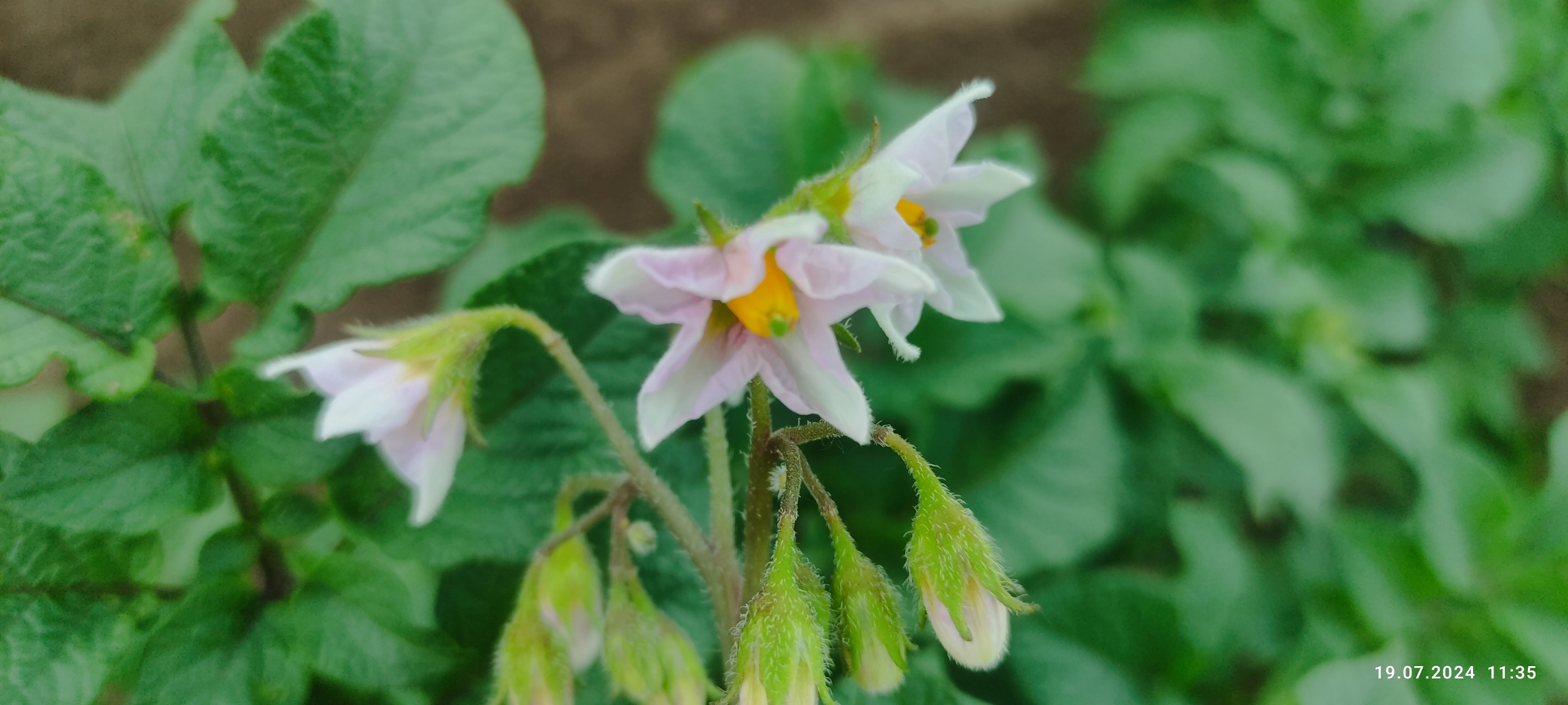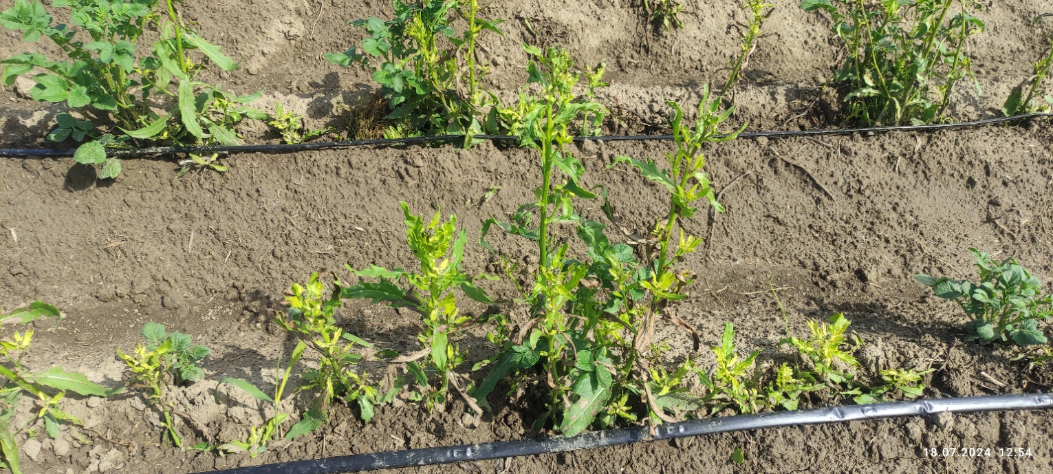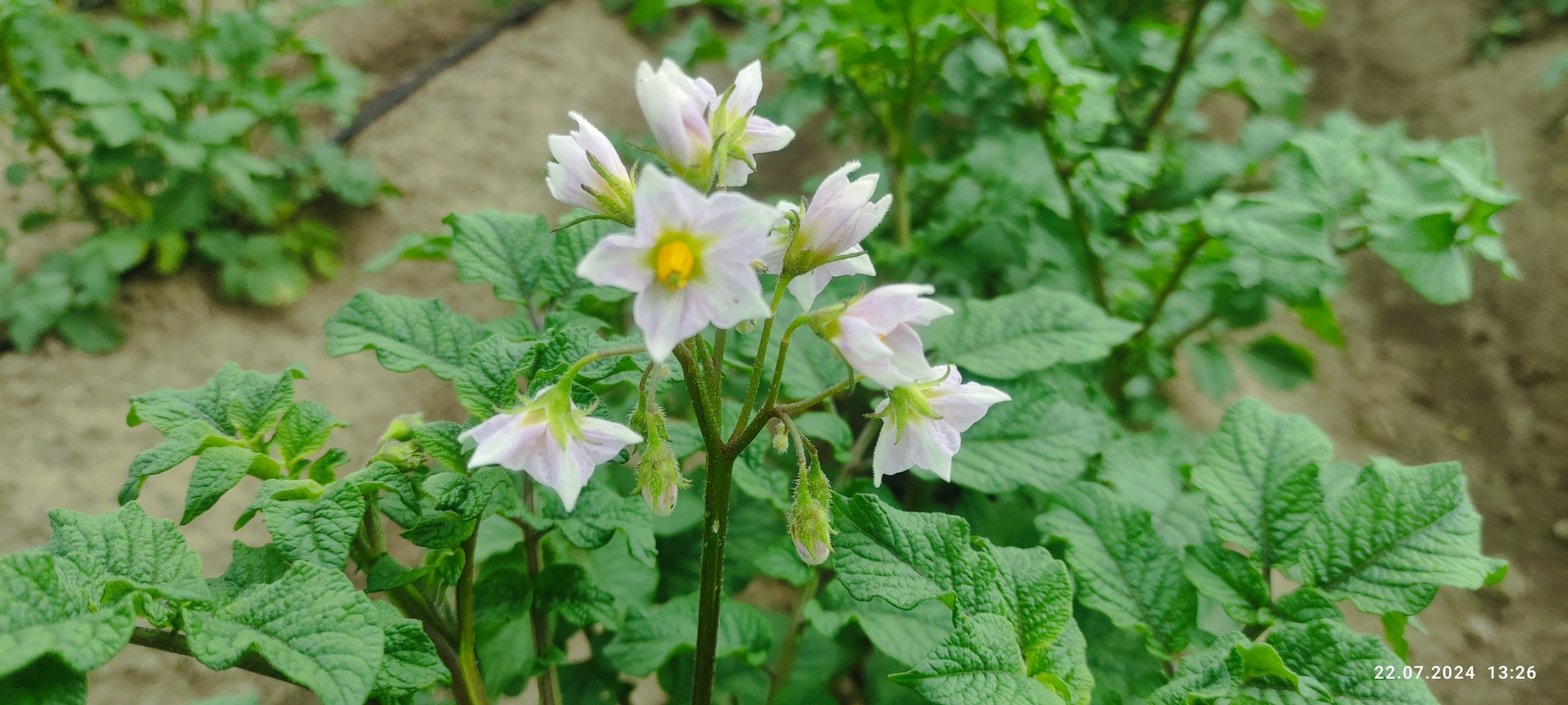 Картофель после окучивания и проброса капельного полива прет как на допинге - радует мне глаз. Смущает цвет цветков картофеля Ред Скарлет: вместо Красно - фиолетовых цветков - описанных оригинатором сорта, цветки бело/слабо-фиолетовые, возможно привез за 1,5 ткм пересорт семенного материала.