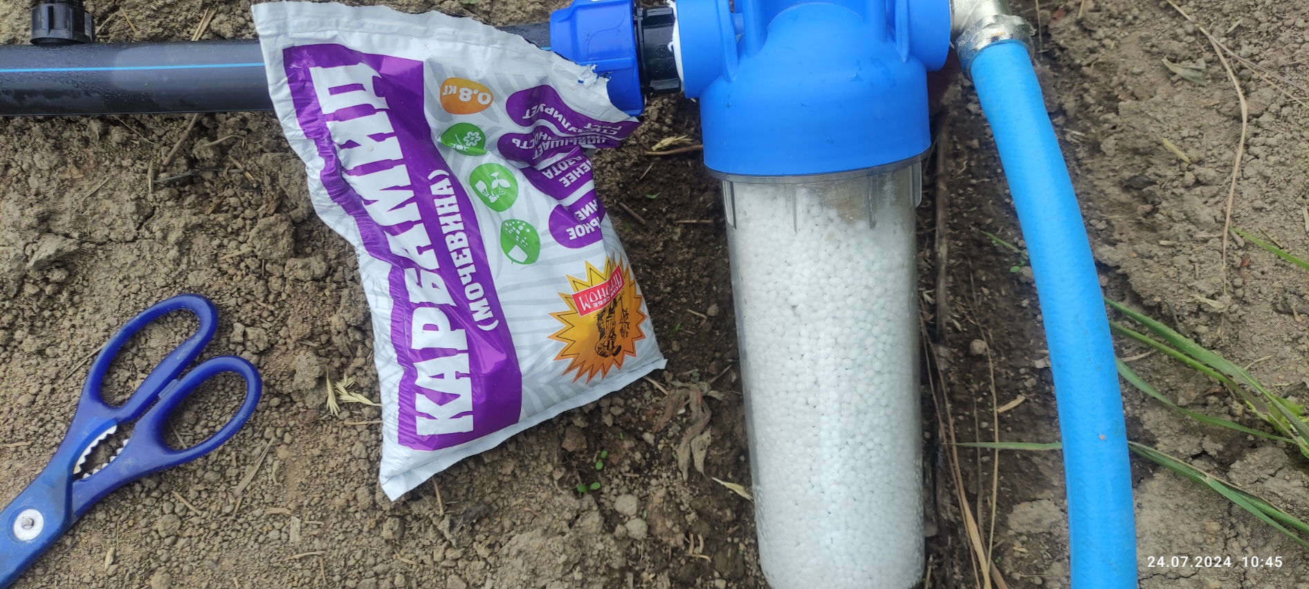 Ради интереса вкачал в систему капельного полива 1,6 кг. карбамида, путем внесения в наружную (дофильтрованную) часть фильтра. За один раз влазит примерно 400 г. удобрения, карбамид быстро растворяется - примерно до 1 минуты, поэтому равномерность внесения под вопросом. Можно будет поэксперементировать с подкормками путем капельного полива.