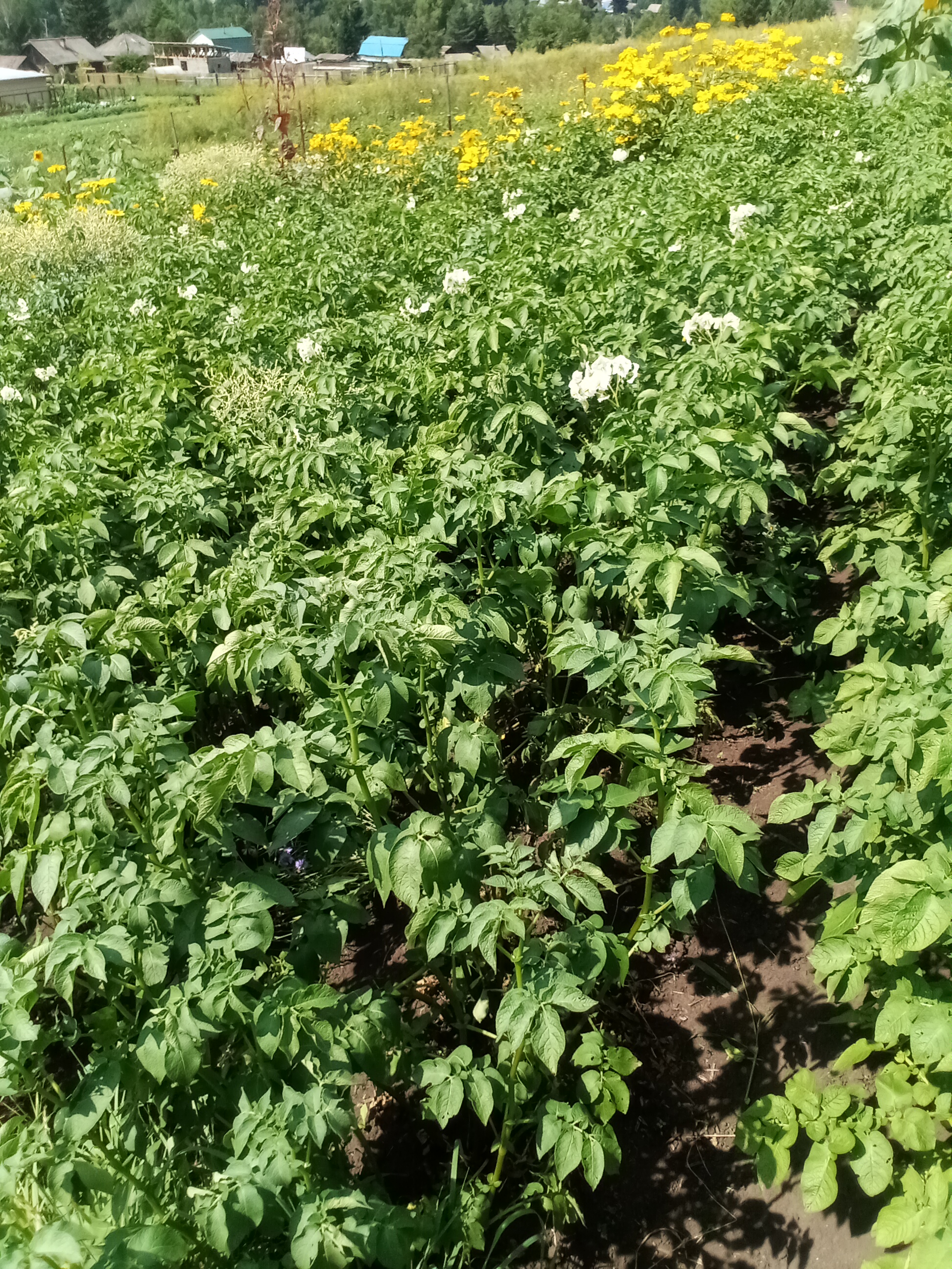 Сорт Кумач решил побить рекорд по ботве и по продолжительности цветения. Цветёт уже больше месяца а высота ботвы перебила 150см. В прошлом году мы его не поняли, наверное рано копали, попробуем подержать подольше.