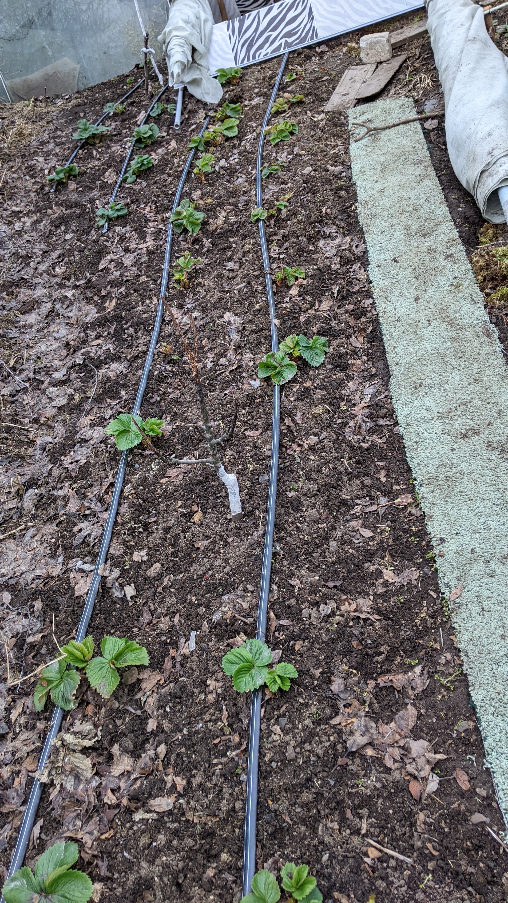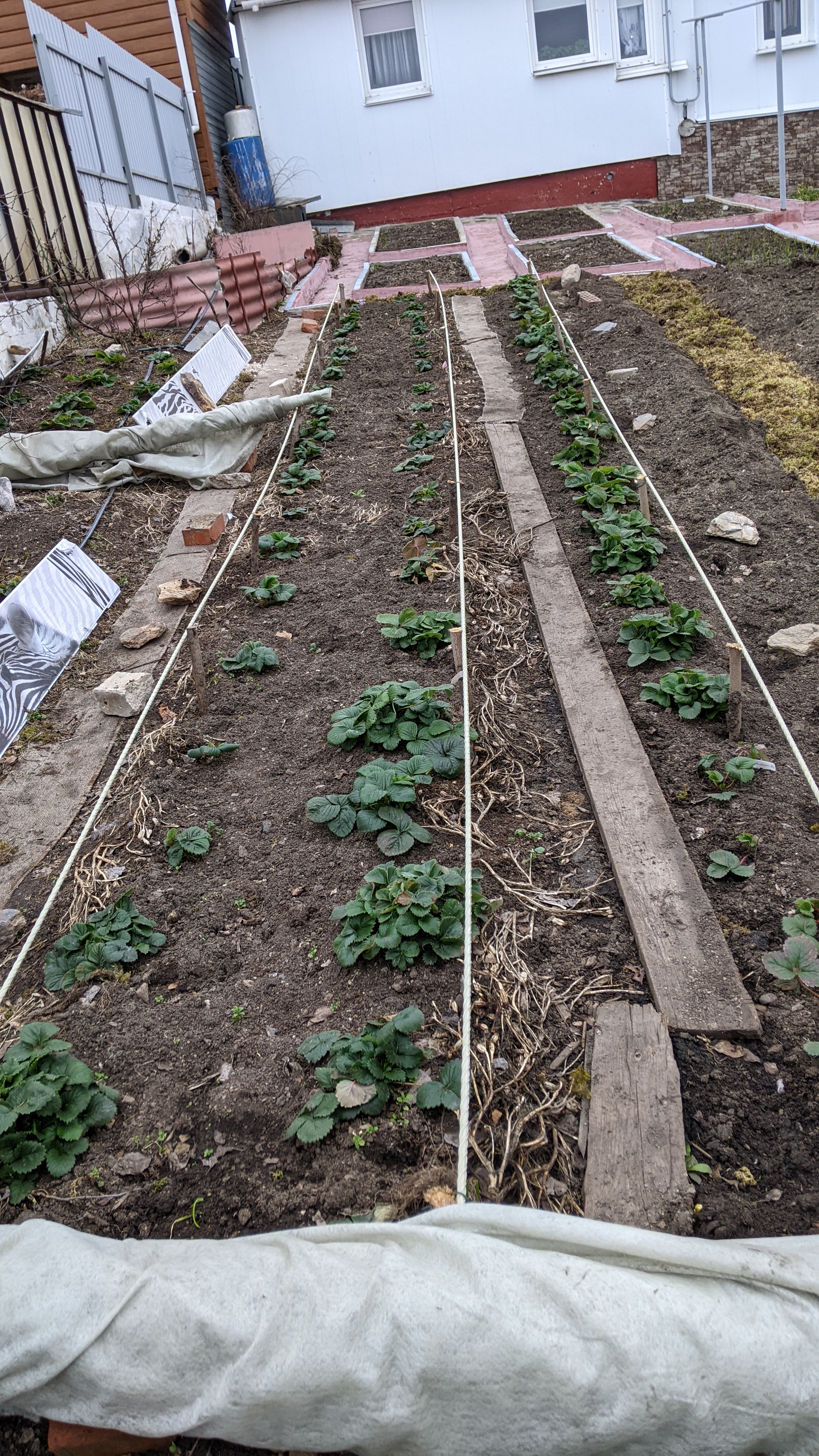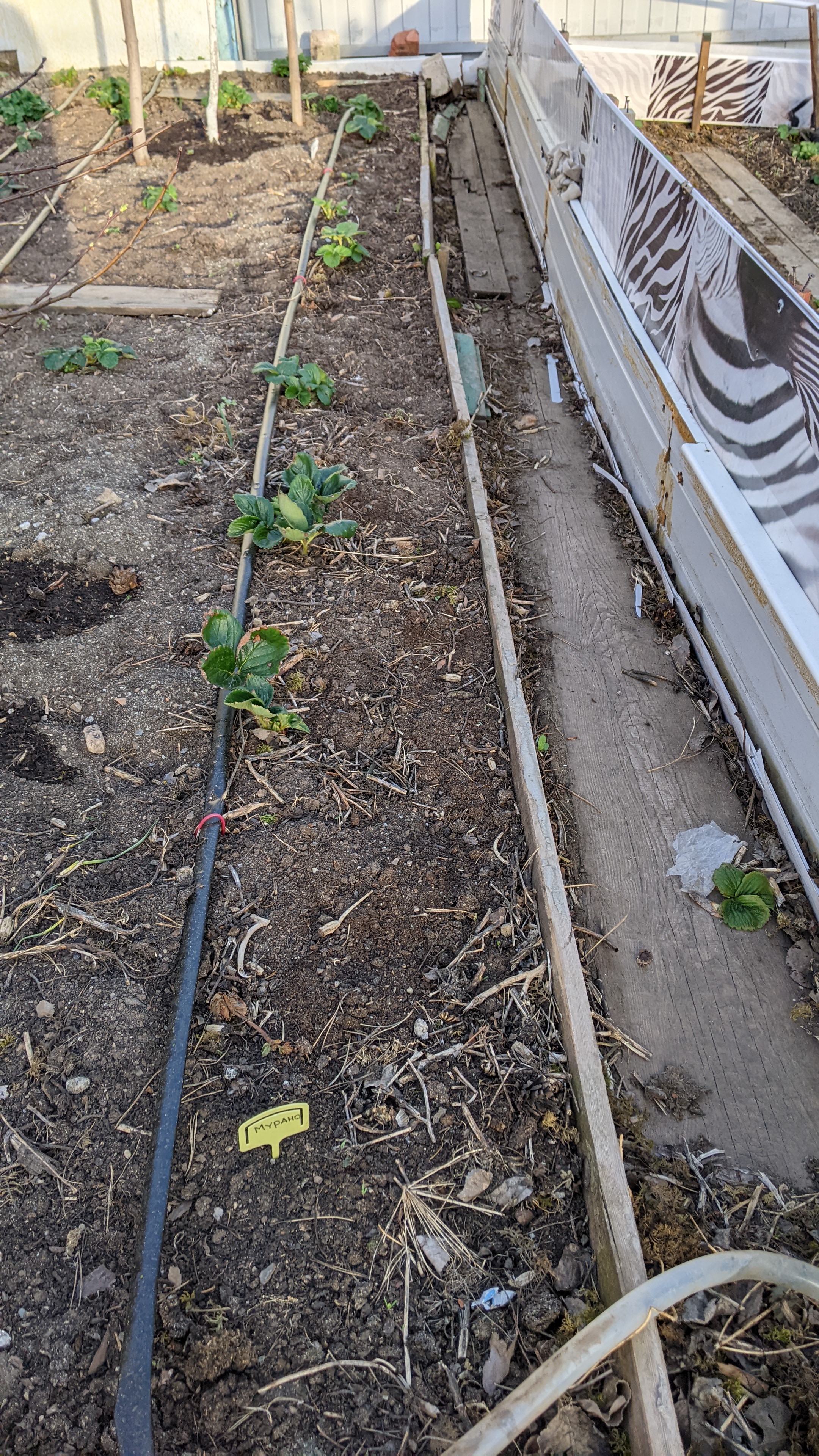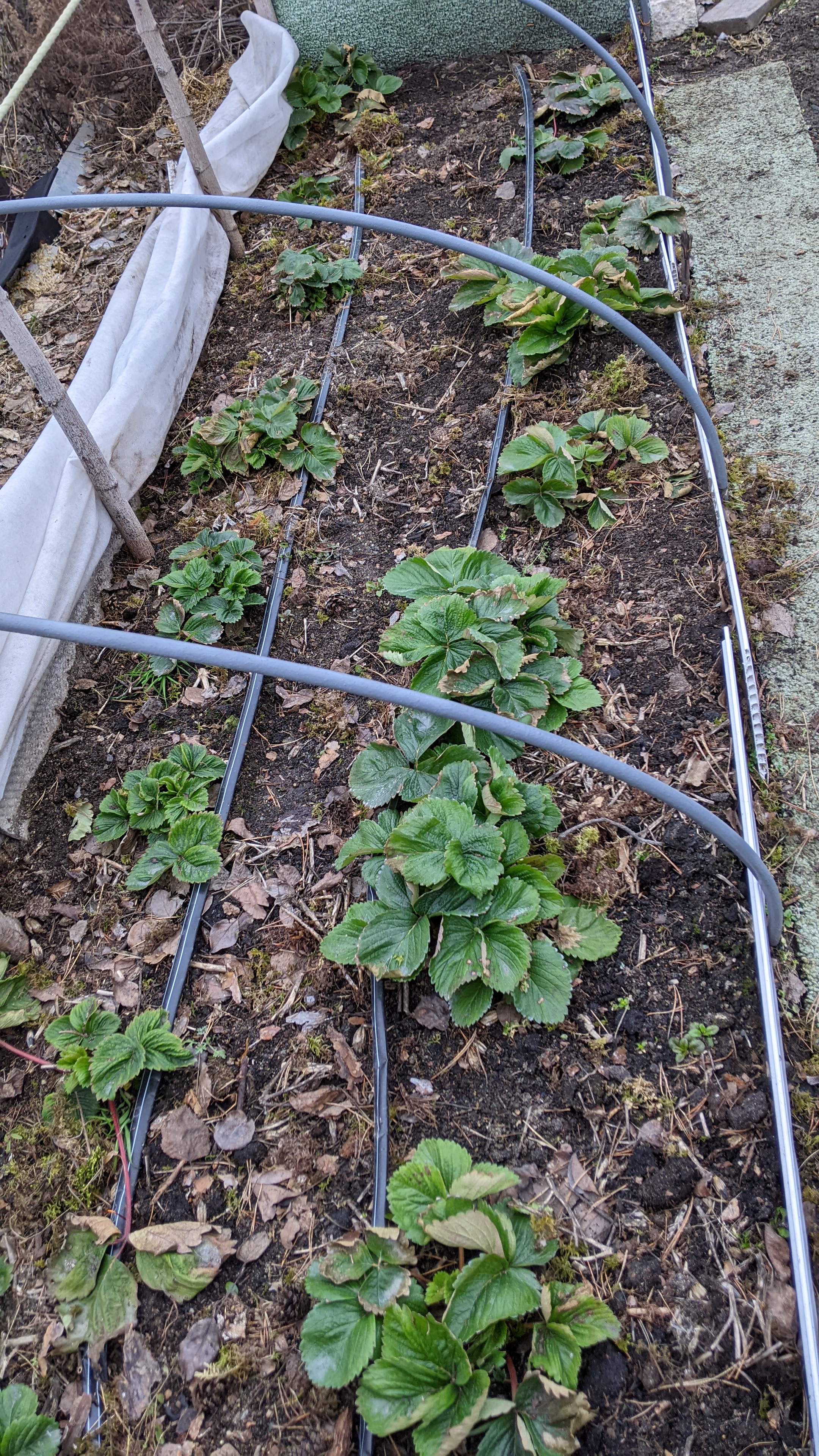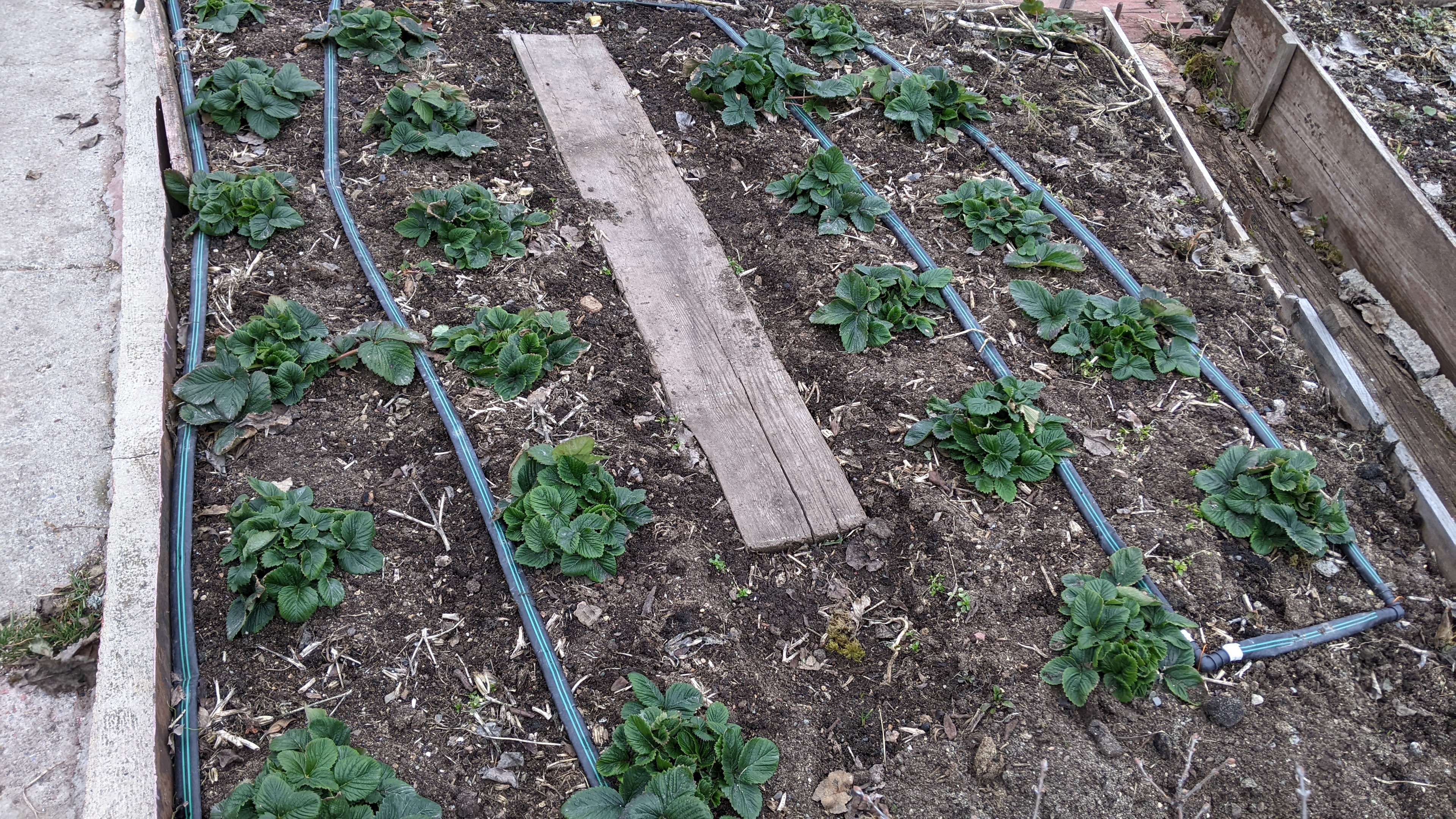 Думал: ладно, чеснок остался недоеденный - хватит весной посадить. И школка земляники примерно там, где я стоял, не залита. Чуть позже, по мере таяния, вода схлынула дальше по склону - направо по фото. На удивление, ничего не погибло. ПОлучается, ледяная корка удержала грядки от размывания. Выпады земляники были, единичные. Примерно из 120 корней, посаженных осенью 2022, выпали 3-4 - недоукоренились, слабая рассада, сорт не зимостойкий... да мало ли.