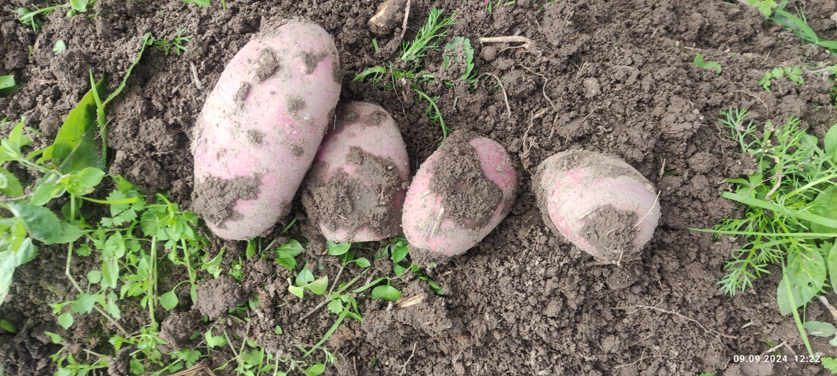 Преимуществ по количеству клубней и качеству в сранении с Балтик Роуз не увидел + трескаются клубни - возделываться более не будет.Скосил ботву, подготовив свою часть участка с Королевой Анной к уборке мотоблоком