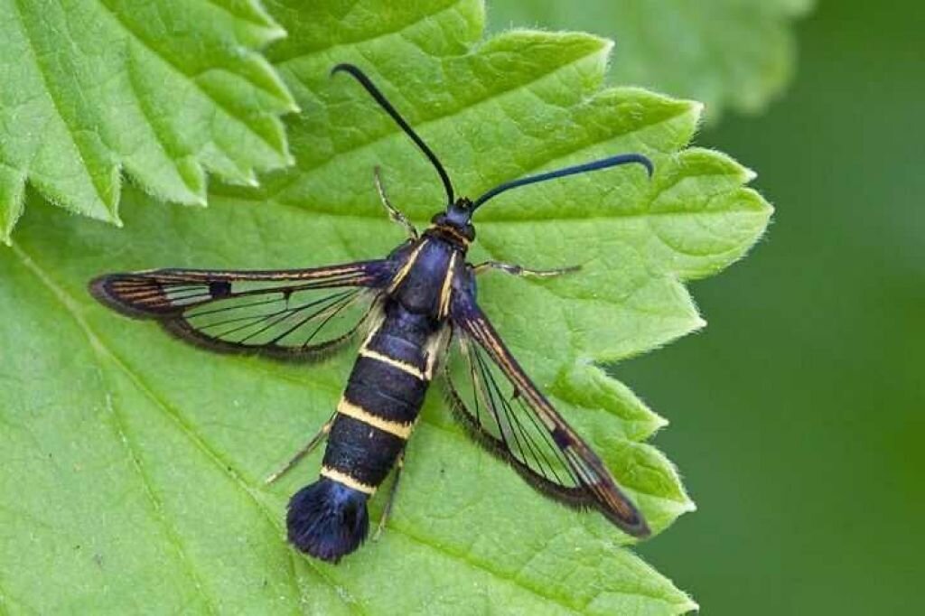 Да, тут много раз уже упоминали стеклянницу. Основная проблема в том, что период лёта приходится на цветение и налив ягод. Сама бабочка ищет повреждения для кладки яиц.