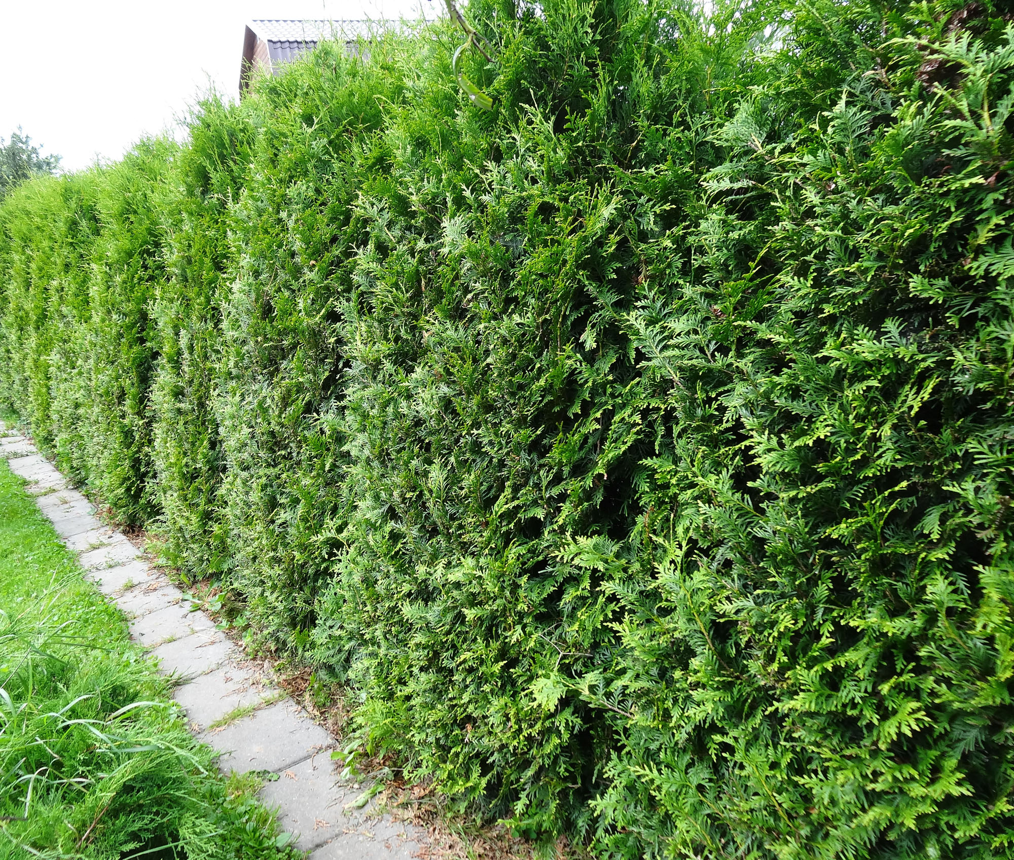 Чтобы закрыться от соседей круглогодично, хорошо подходит живая изгородь из туй, лучше для этой цели сорт Брабант. Правда, такая ЖИ немного скучновата. Вот моя, она загораживает соседский забор. Высотой около 2,5 м, но я ее стригу, чтобы не росла высокой, а так она может вырасти до 5-6 м.