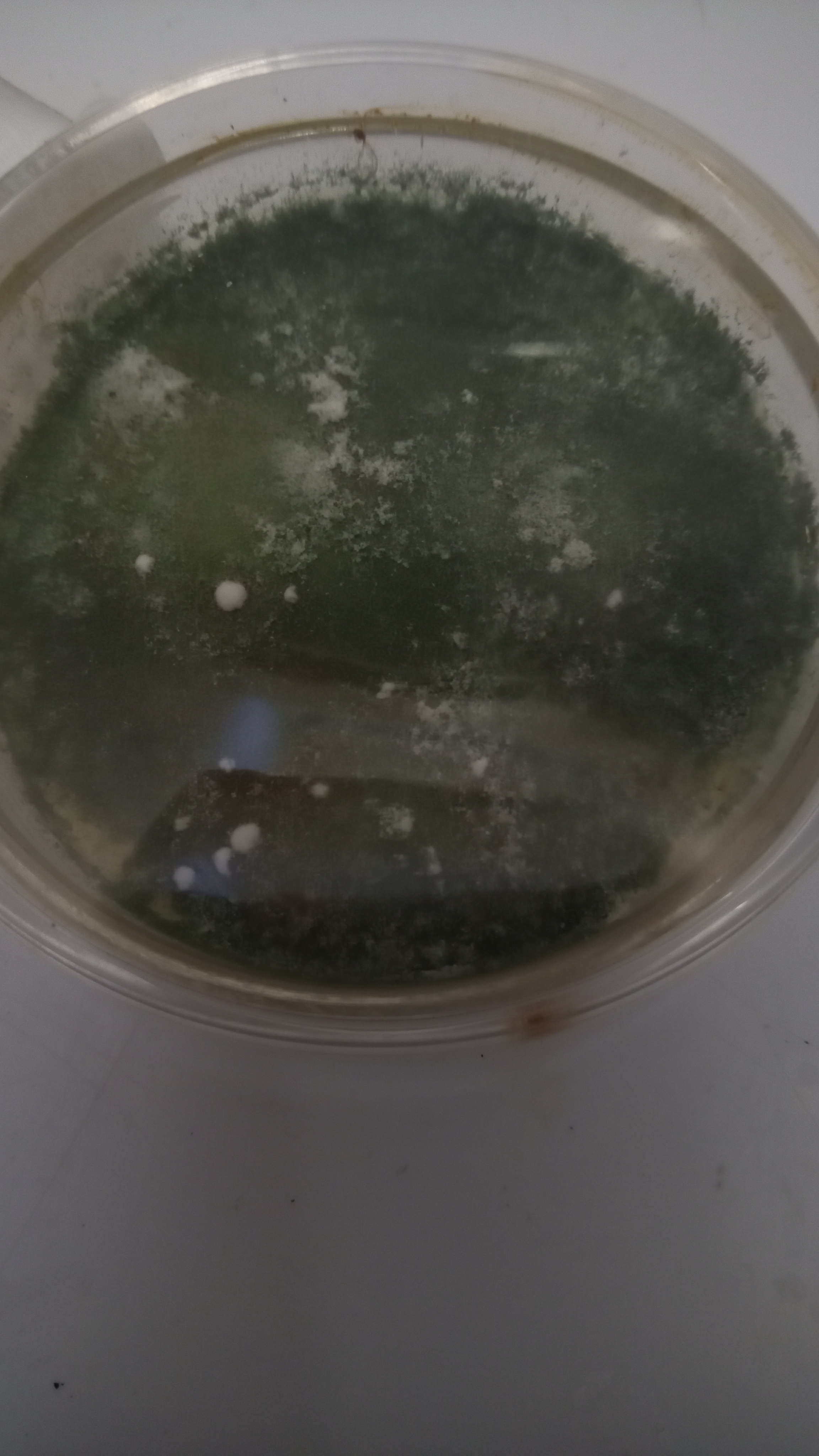 После засева на третьи сутки при +25С бОльшей частью нарос мукор в местах засева, точно не уверен...похоже на мукор. Такая белая пушистая плесень. Зелёная триходерма тоже есть, но совсем чуть-чуть. Перловка была стерильной, поскольку плесень росла медленно вниз с места посева перловой крупы.