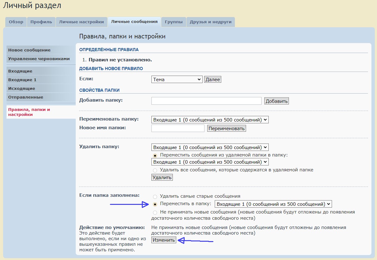 Теперь при переполнении папки "Входящие" самые старые сообщения (или новые?) будут перемещаться в папку "Входящие 1"