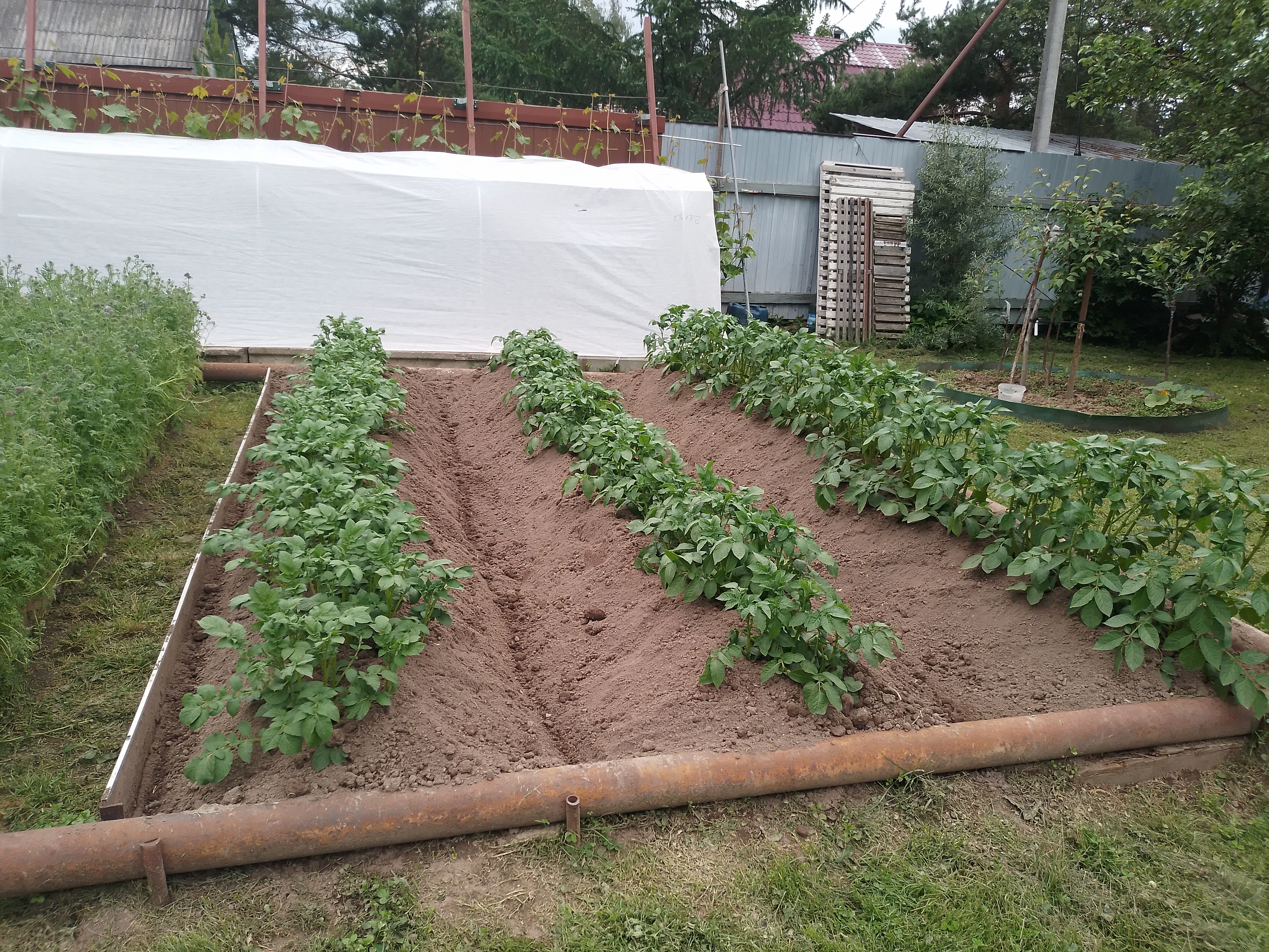 Немного картофельной жизни. Площадка 3х4.5м.,посадка 17.05. Слева направо К.А, Пламя, Кумач. Всего 51шт. Ожидаемый урожай 120-150кг.