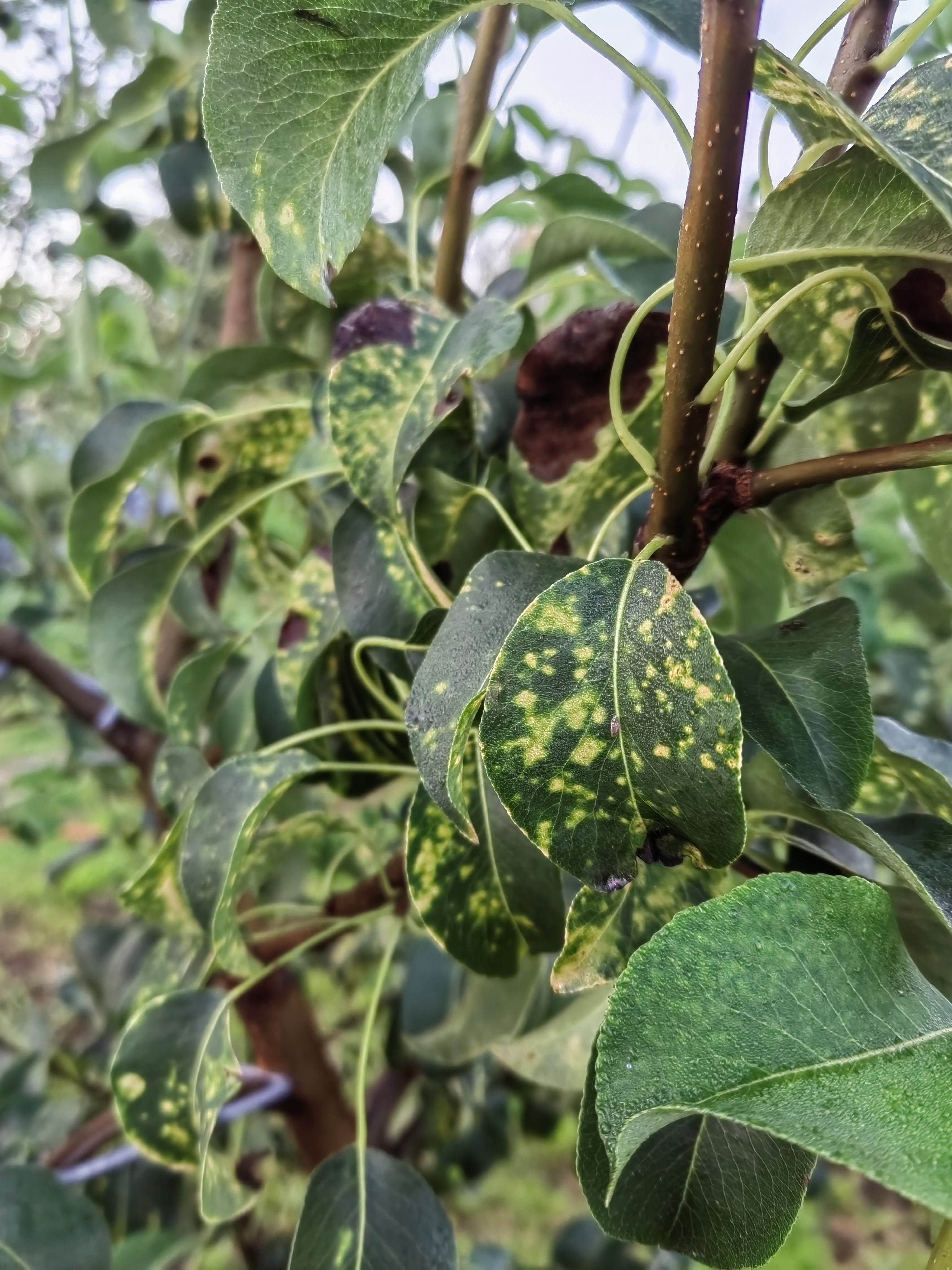 А ЕЩЕ все плоды потрескались и того... но это как раз у обоих груш... так что вряд ли связано... умеренная ржавчина тож на обоих