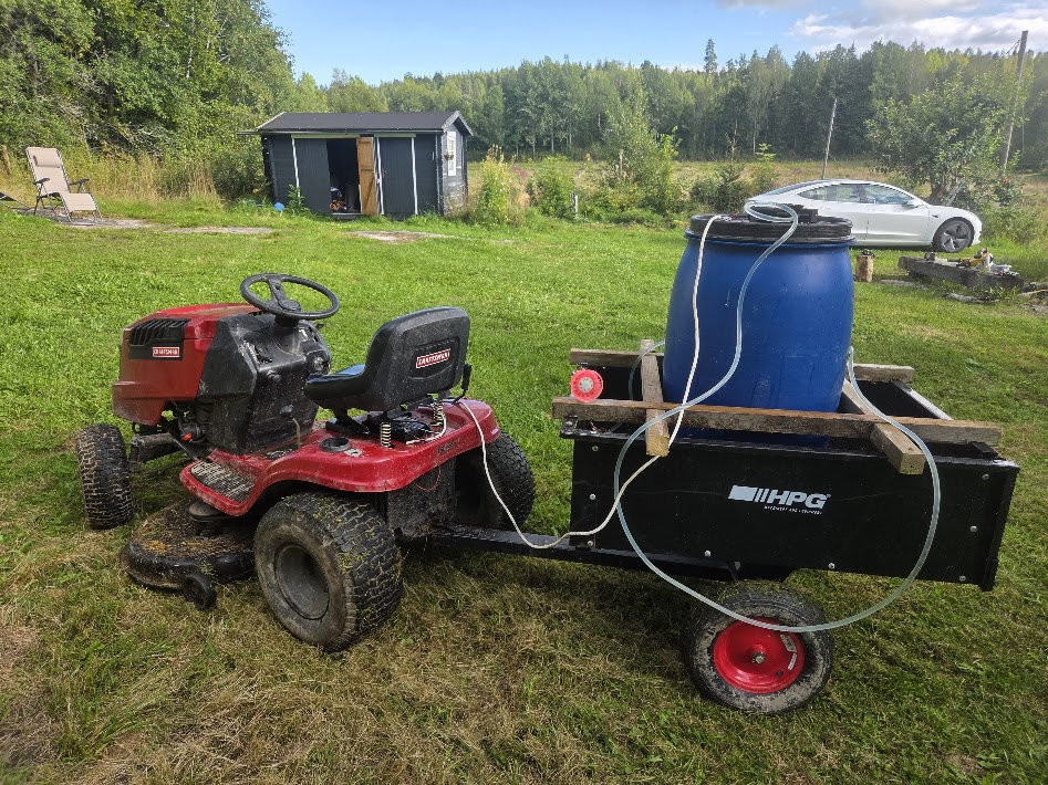 Надоело бегать с ранцевым опрыскивателем, установил бочку в прицеп газонного трактора + 12в насос. Можно совмещать покос травы с защитой сада, лучше делать это вдвоем, второй сзади идет с опрыскиванием.