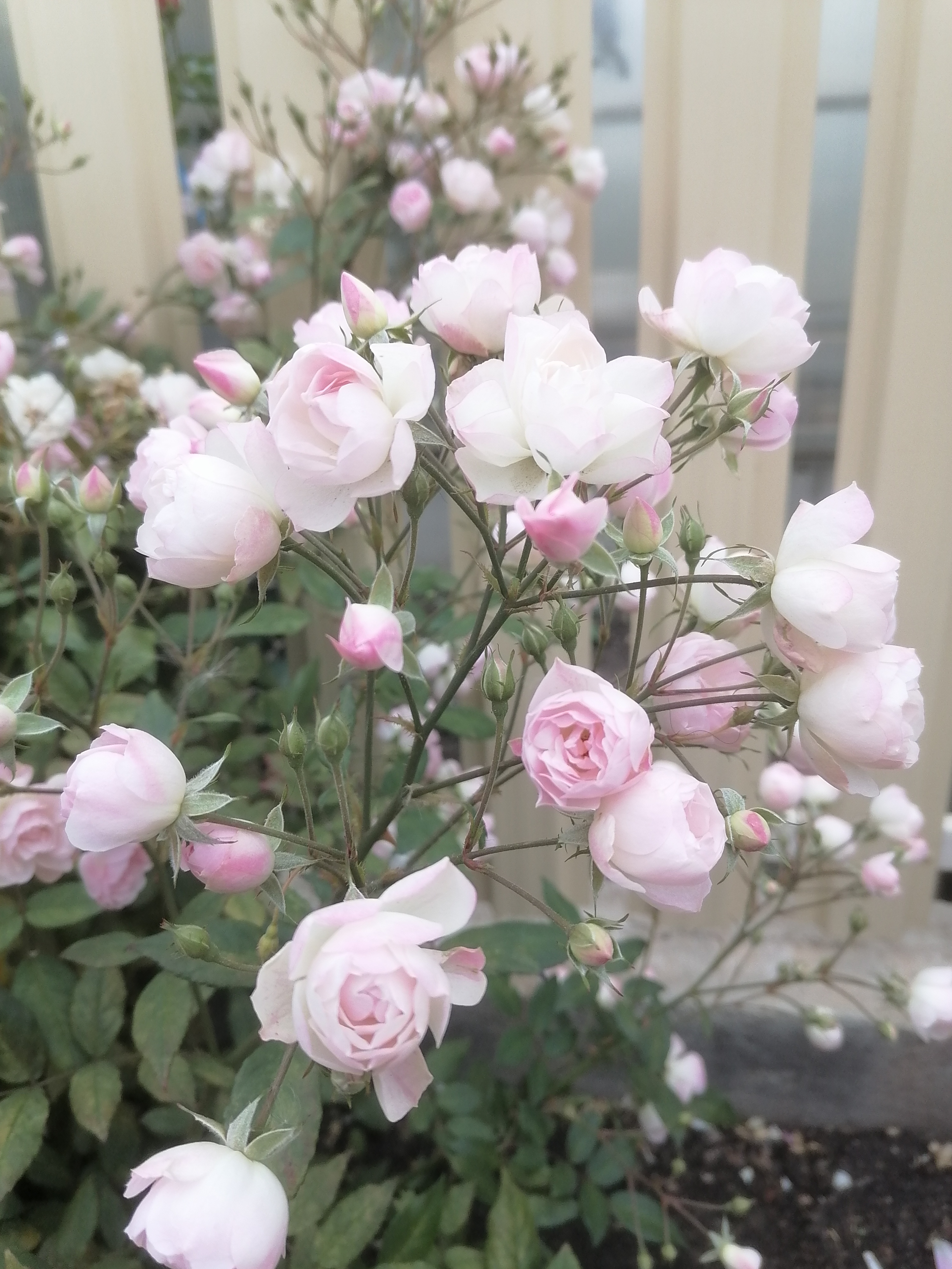 Юля, розе года 4. Высота чуть больше 1,5 метра. Не сильно становится плетистой. В этом году розу не подвязала,она побеги вес опустила. Стоит как горочка.На фото роза в центре. Очень обильная, душистая. Режу ,стараясь сохранить высоту,боковые побеги укорачиваю,мелкие,слабые удаляю.Зимовка отличная,роза не болеет ничем. Даже сейчас стоит чистенькая. Цветет долго,повтор тоже хороший. Много базальных побегов дает за лето.Укладывается легко.