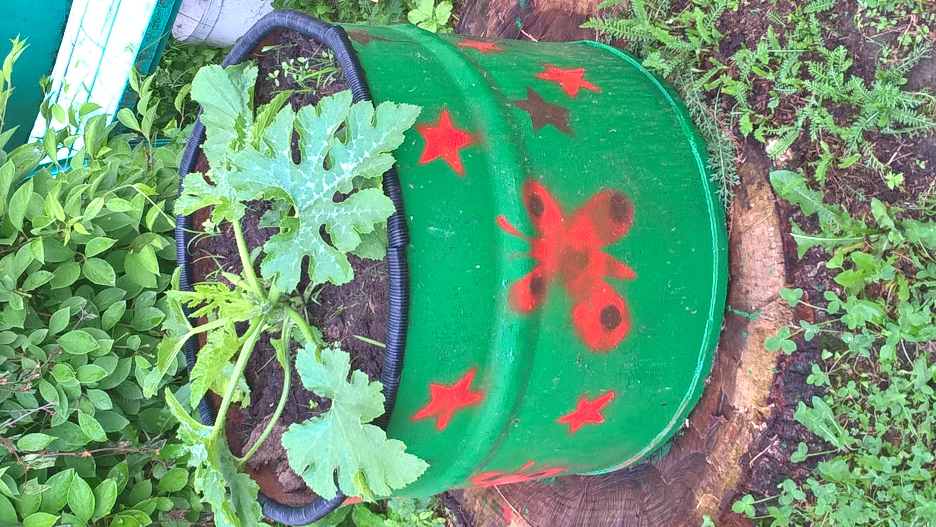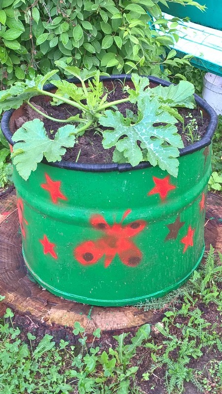 Я насмотрелась-наслушалась,и сварганили мы с мужем вазон для раннего кабачка из дырявой бочки. Подставка у вазона-дубовый пень. И вот что получилось. Пораньше хочется кабачков!