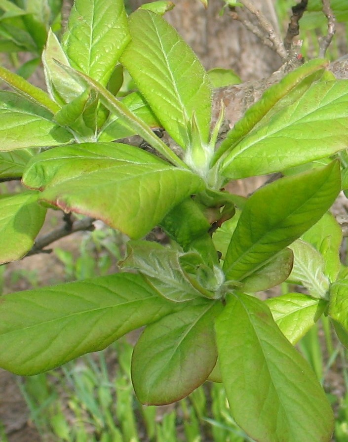 Тимур, вот описание из Кремера Бруно П."Деревья"." Листья очередные, почти без черешков, сидячие, длиной 5-12 см, шириной 2-4 см, продолговато-овальные или эллиптические до обратнояйцевидных, очень короткозаострённые. У основания округлённые, цельнокрайние или мелкопильчатые, немного морщинистые из-за глубоко посаженных жилок. С верхней стороны матовые, тёмно-зелёные, с нижней - беловатые. войлочно-опушенные. " Может быть, Вы с близким родом перепутали, с Хеномелесом?