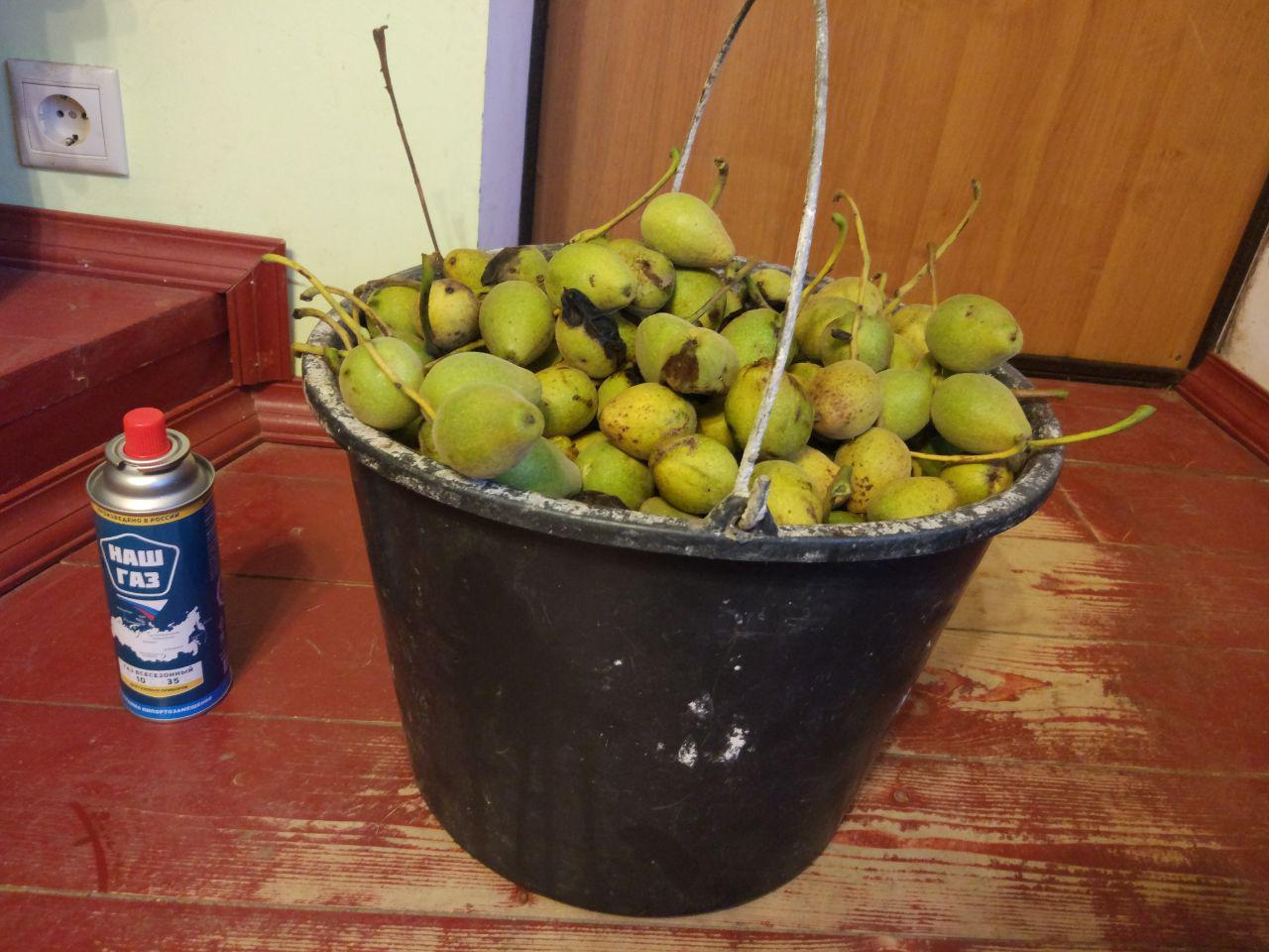 Урожай в этом году - большое строительное ведро (неочищенных от кожуры) плюс немного уже раздали. В радиусе 300 - 500 м другие цветущие орехи не растут (есть пара видимо стерильных гибридов), поэтому мой скорее всего самоопыляемый.