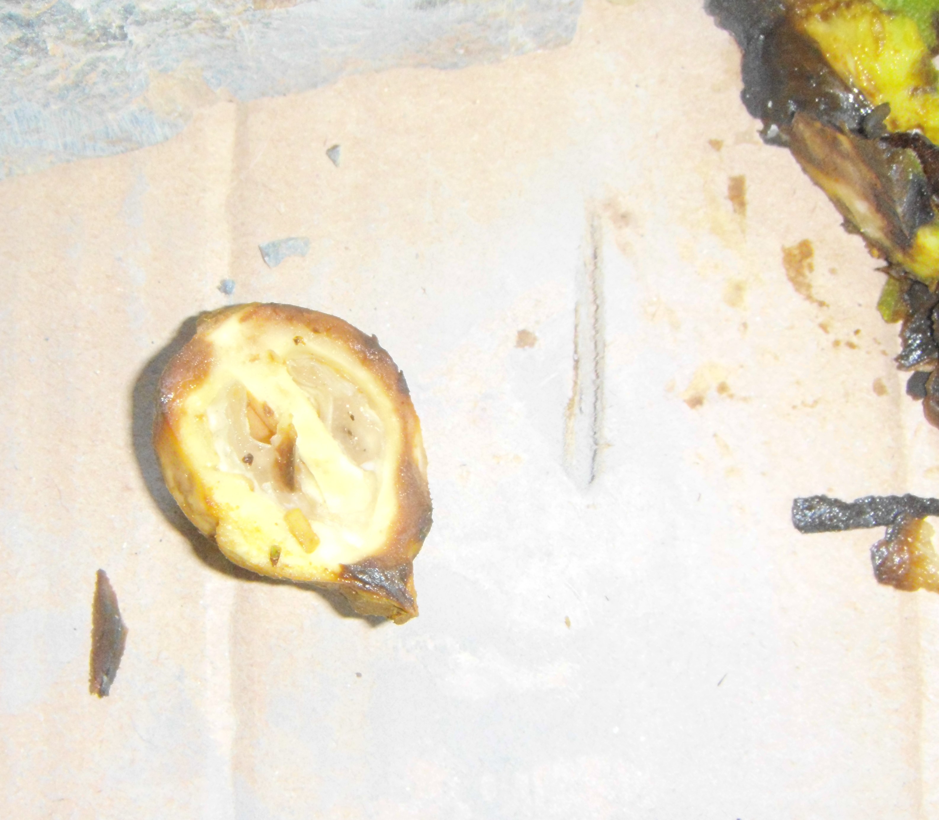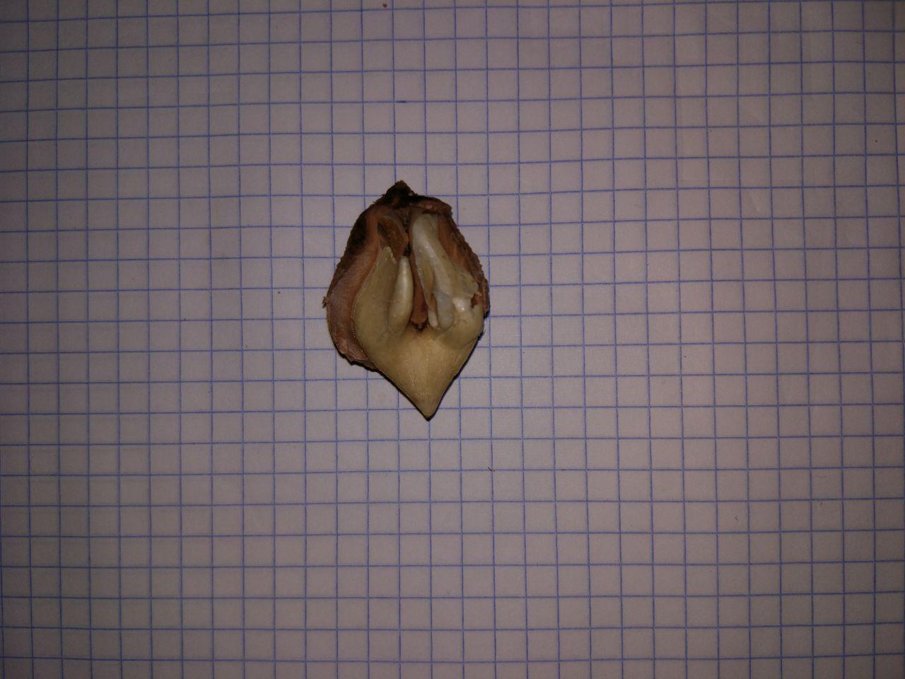 Все же вскрыл один из своих гибридов, уж больно они не пропорционально легкие. Картина безрадостная, сомнения не обманули, стенки толстенные, но даже и оставшаяся емкость заполнена менее половины, практически одна пленка вместо ореха. Встает вопрос, толщина скорлупы сердцевидной мамы чуть больше 1 мм, толщина орешка скороплодного папы уровня ксероксной бумаги (на некоторых вообще дыры), а у их дитя скорлупа мм 3-4. Почему? Информация к размышлению: 1. Данное дерево сердцевидного росло медленно это было первое и единственное соцветие, опылились 3 гибрида и 1 свой. Последний вырос совсем мелкий, тоже с толстой скорлупой и пустой внутри. 2.Но в прошлом году на другом (большом)дереве тоже завязались два орешка один упал рановато, мог недозреть (пустой), второй вроде нормально, но при вскрытии примерно та же картина что сегодня с гибридом, вместо орешка некоторое его подобие, практически одна пленка. Но в этом году орехи, как видно на фото вполне созревшие и приличные.
