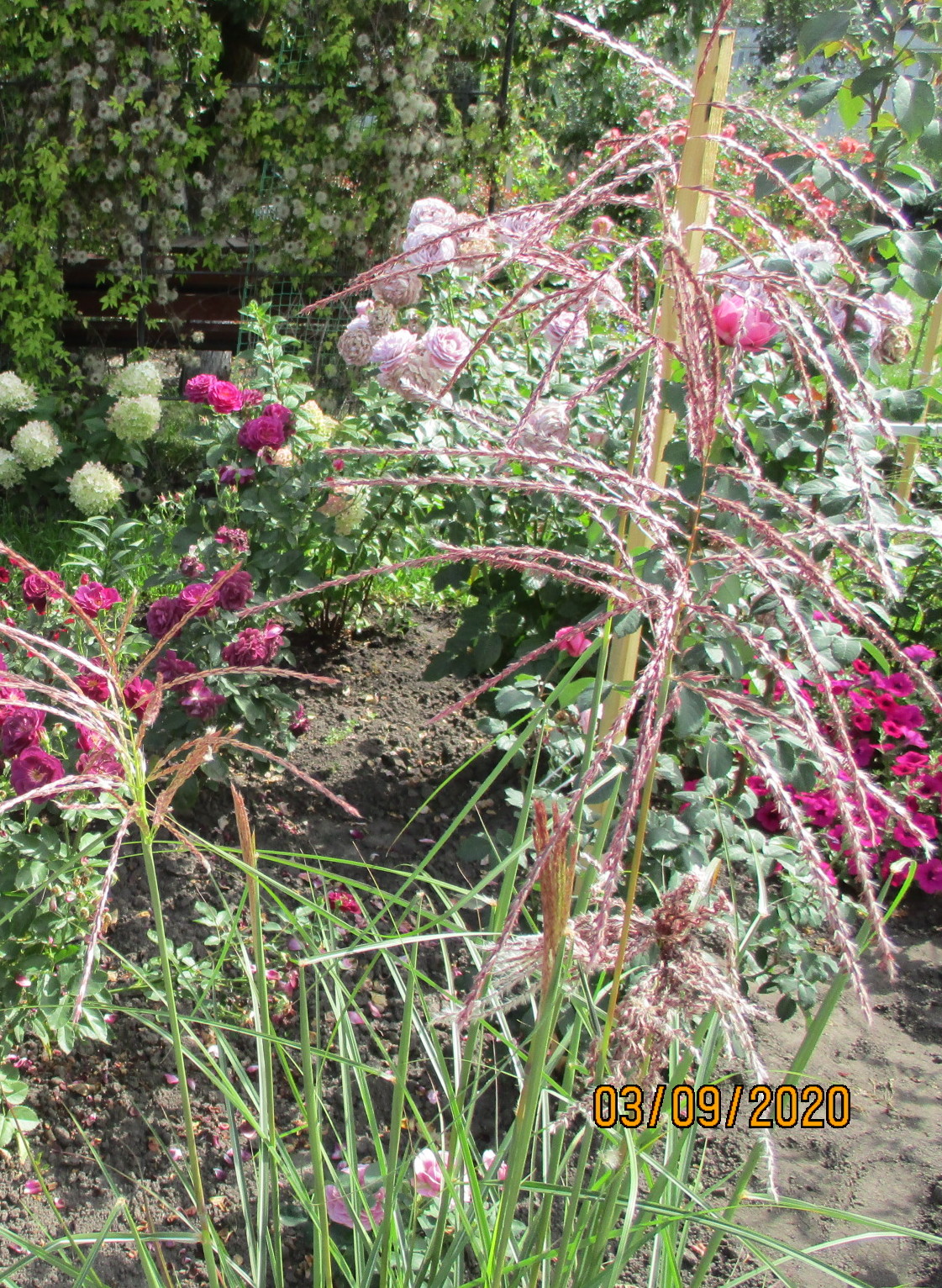 Лена,это Мискантус. Очень нежно цветет. Не похож совсем на сорняк. И никакого ухода. Иногда разделить нужно, потому что разрастается довольно быстро.