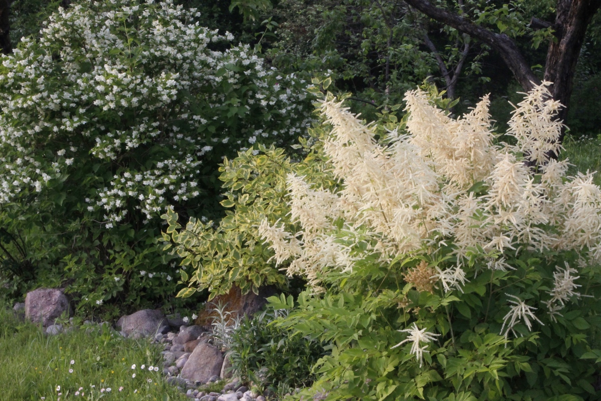 Вот вариант с чубушником и дёреном Шпета.