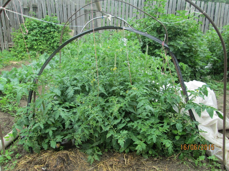 А что у томатов с посадкой может быть не так?? Обычный суглинок, обычные мин. и оргудобрения, обычная-стандартная посадка "лёжа", тут же вся поверхность почвы мульчирована (с досыпанием в междурядья) и подвязано посажение к колу (сейчас бы иначе сделал, "голова" куста между 2-мя шпагатами на ряду кольев, хотя не знаю как бы это держалось, нужно натяжение).