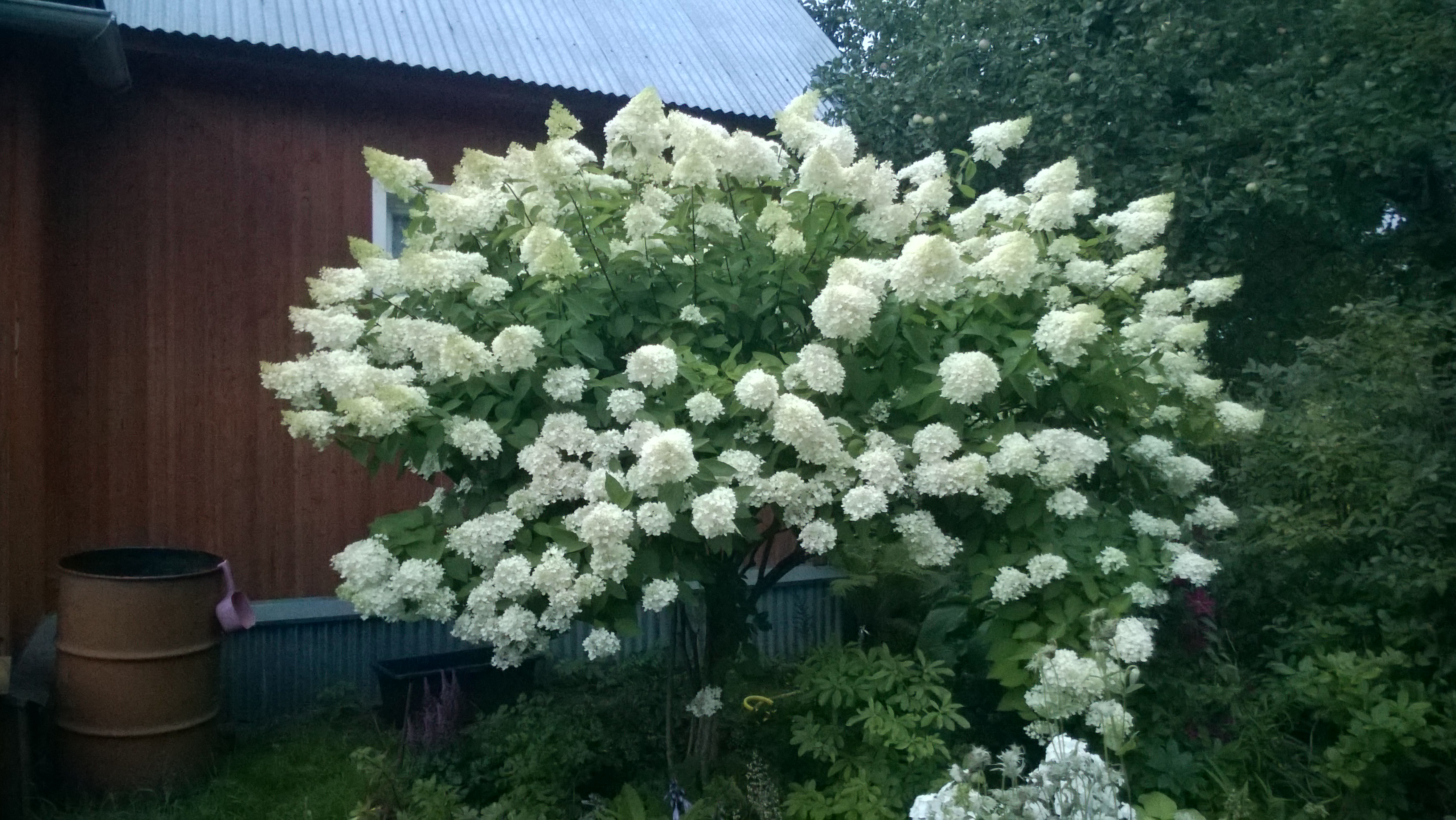 Я выше писала, что моя мама перепутала какую гортензию стричь "по колено", и обрезала метельчатую вместо древовидной. Вышло очень неплохо