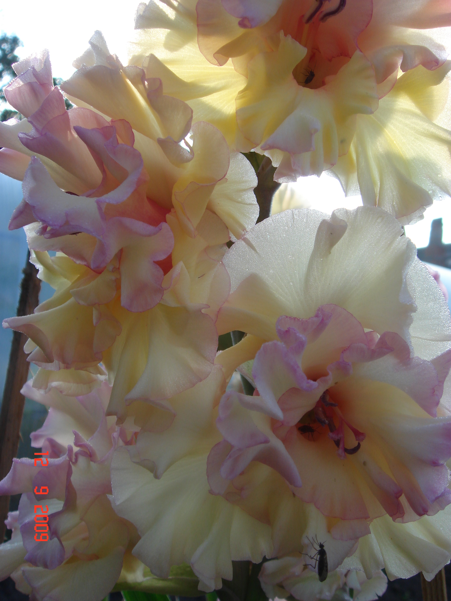 Очень красивый гладиолус. Нежно-палевый с розово-сиреневой подсветкой, нижний лепесток светло-золотистый с сиренево-розовыми краями и прожилками в горлышке. Цветы настолько сильно гофрированы, что похожи на гвоздики!