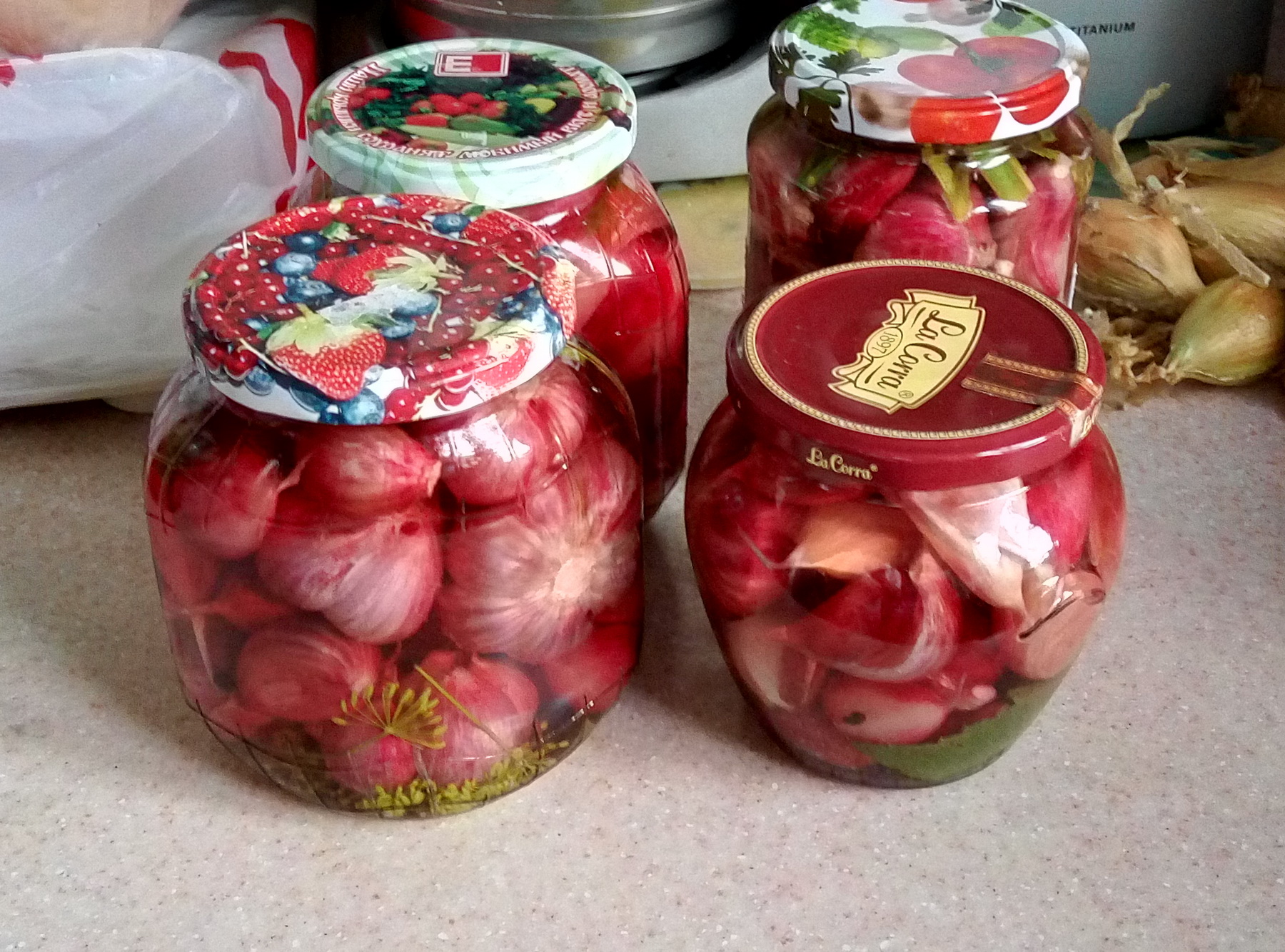 татя, Девочки говорят в повареннной книге он есть, я напишу, как я делала в этот раз: на 1,5 литра воды 1 ст.ложка соли (крупной) и 2 ст. ложки сахара, перец горошком душистый и острый, лавровый лист ( можете по желанию любые травки). Ставите маринад на огонь и пусть кипит потихоньку. Чеснок очищаю от верхней шелухи, если головки не очень большие закладываю в банки целиком, если крупные, то приходится ломать. На дно банки зонтик укропа и лист смородины, листьев хрена нет, весь скосили. Делаю в пол литровых и 800-граммовых банках. В каждую банку добавляю на кончике ножа лимонную кислоту (можно уксусную) , но мой не может с уксусом. Заливаю кипящий маринад и ставлю стерилизовать, вчера стерилизовала в обычной кастрюле, доводите температуру внутри банки до +70-75°, вынимаете, закрываете и переворачиваете до полного остывания, ничем не накрываете.