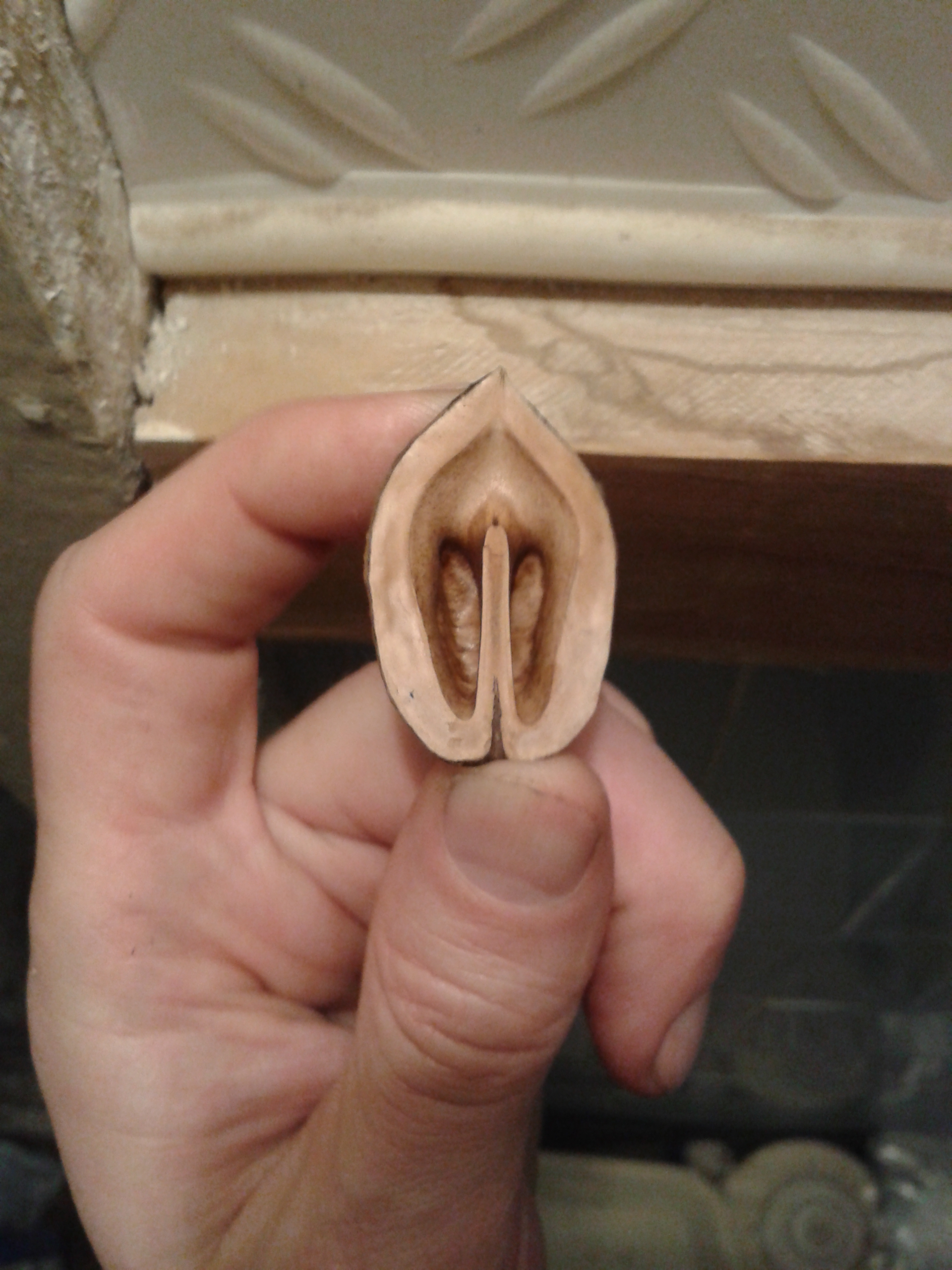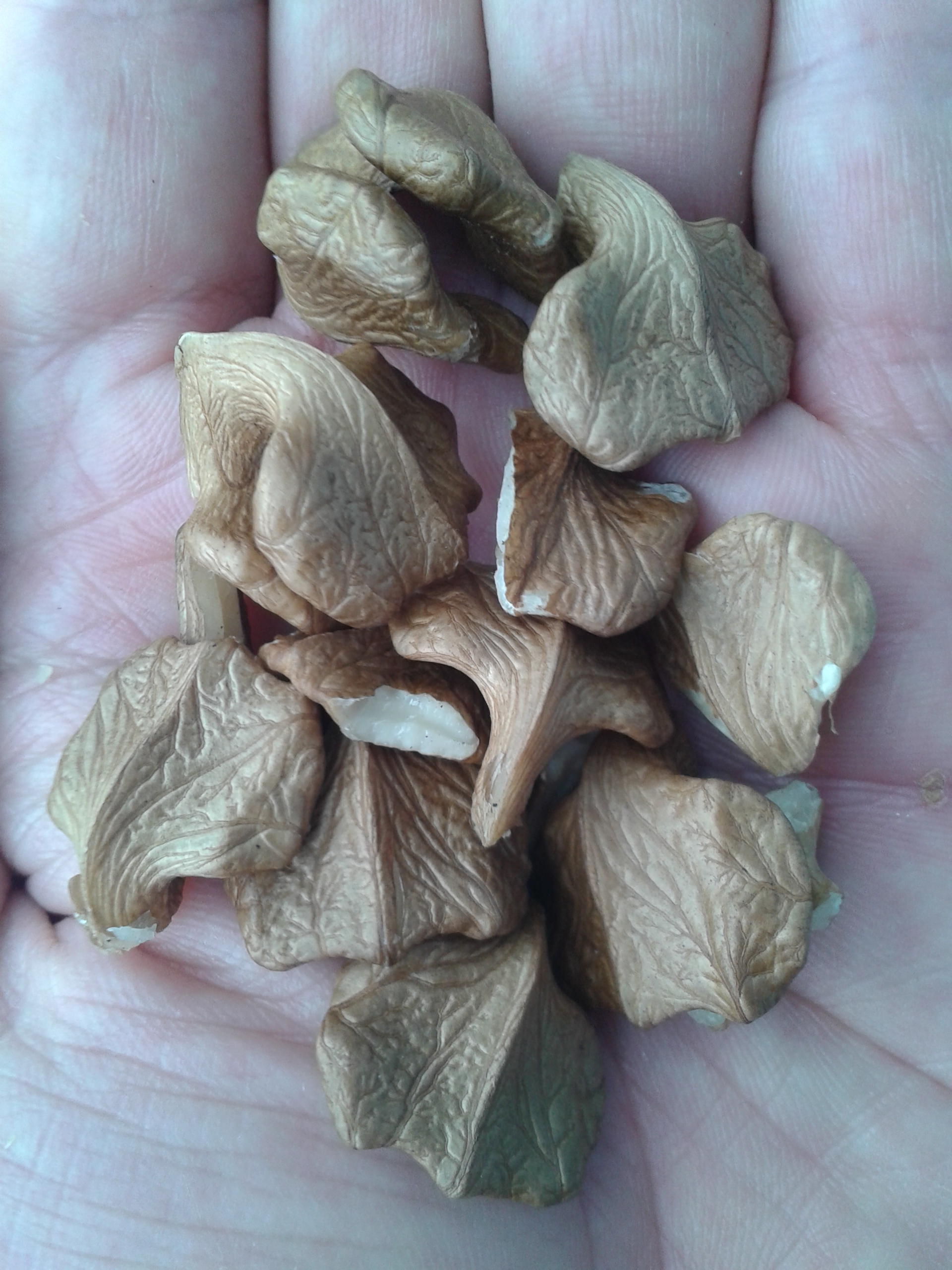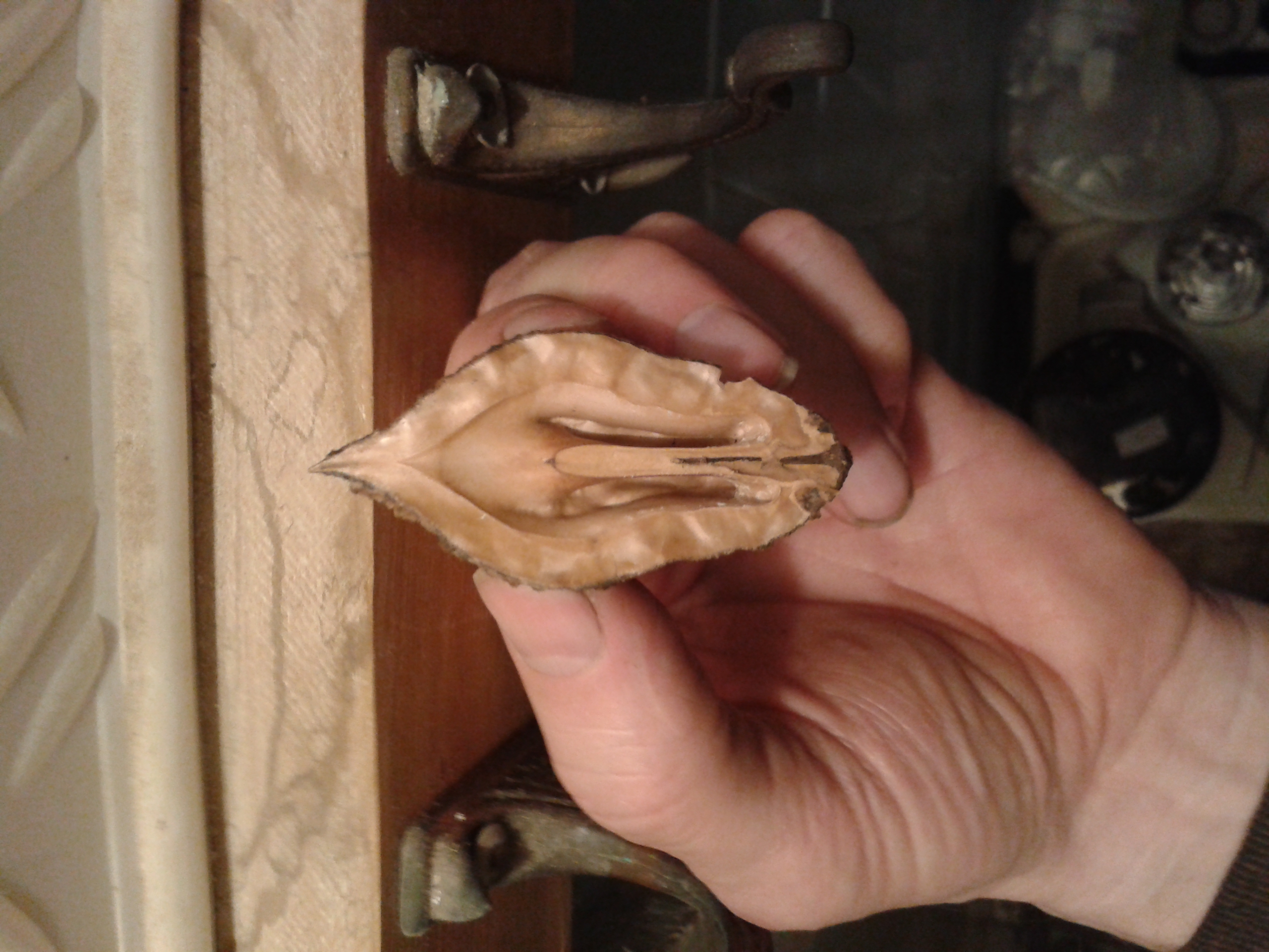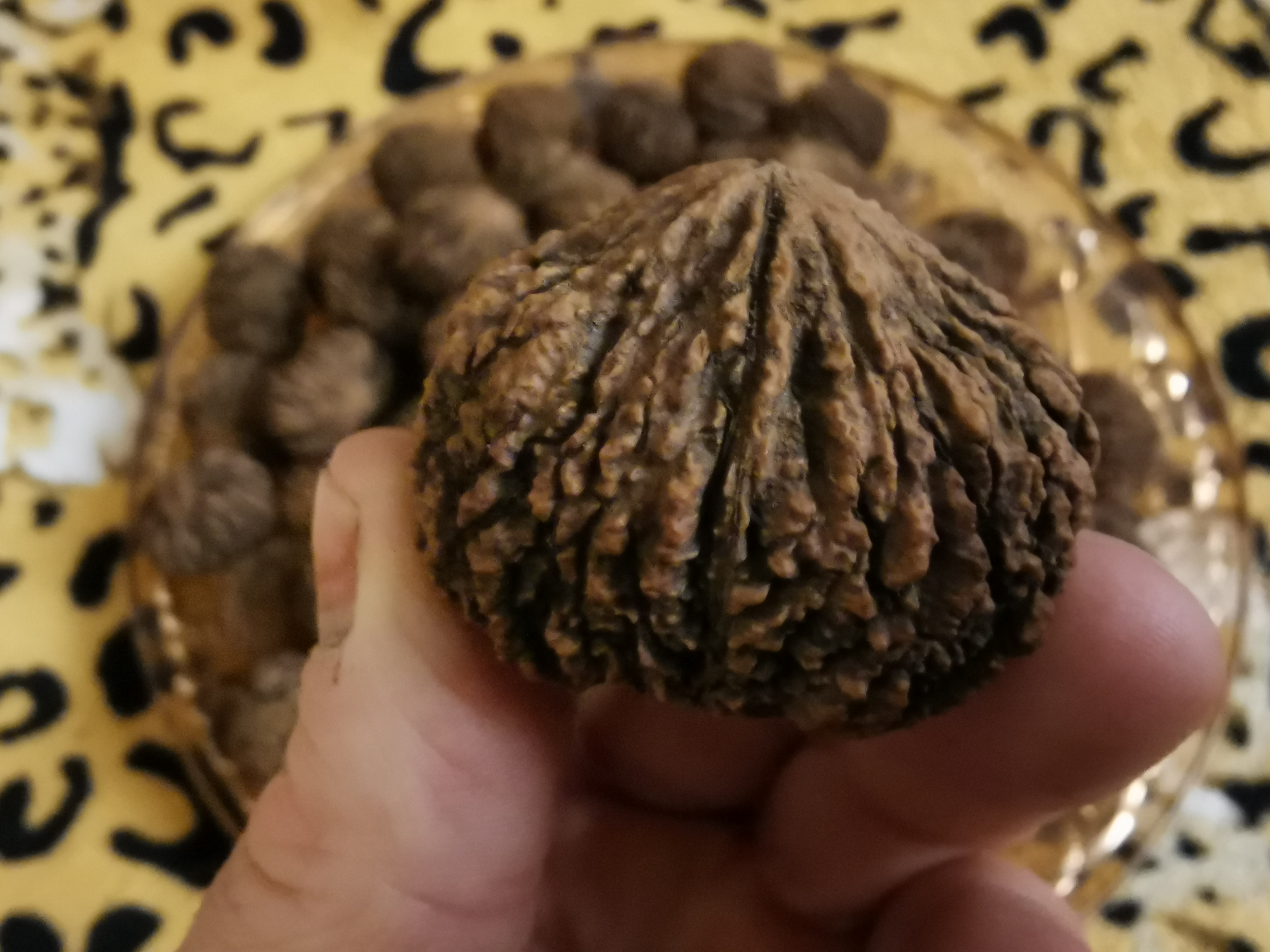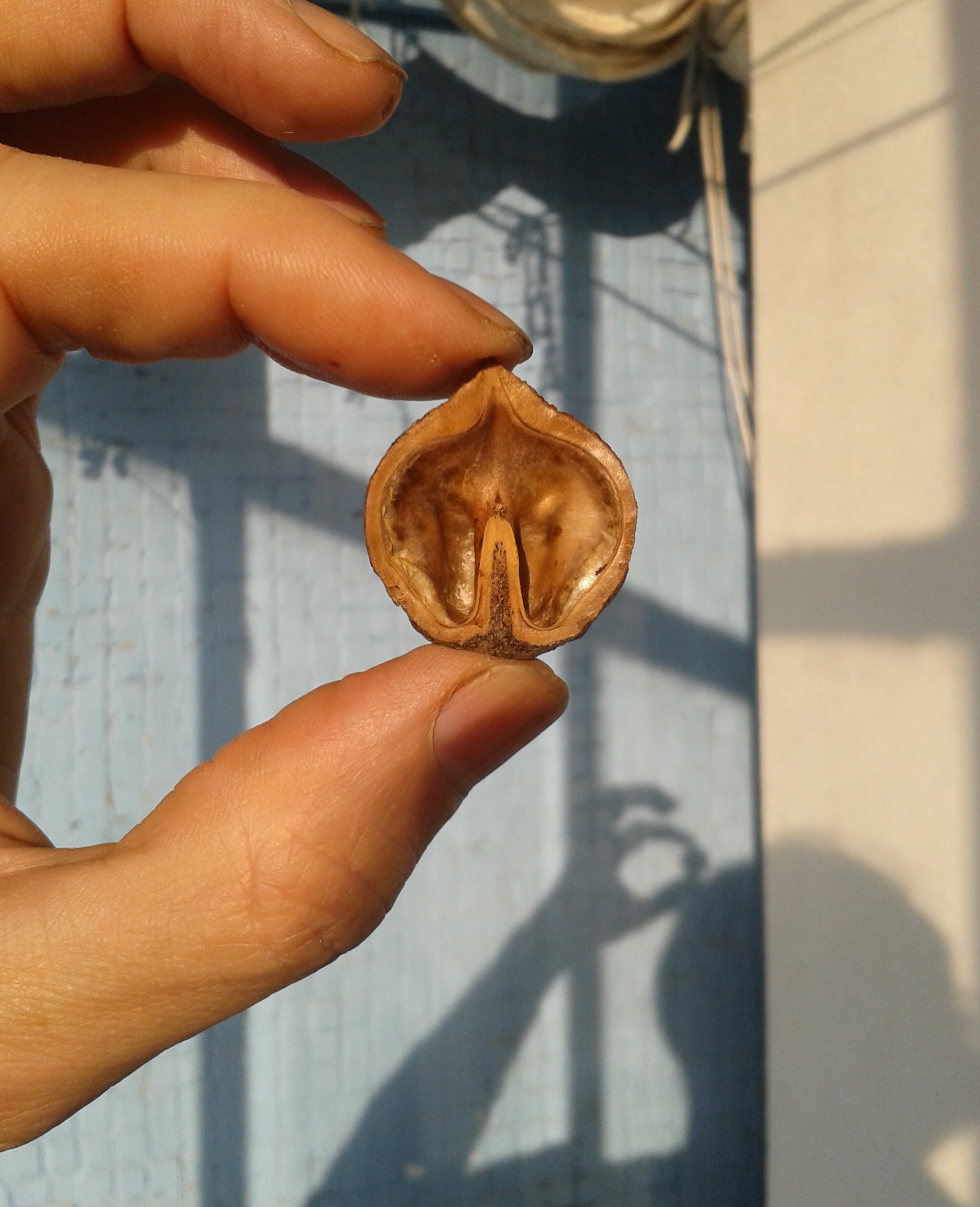 Но при этом ядро более гладкое,вполне "доставабельное",а в материнских вообще не вытащить,мозги какие-то по виду и плотно переплетены со скорлупой.И мои вкусные. Только очень жирные.