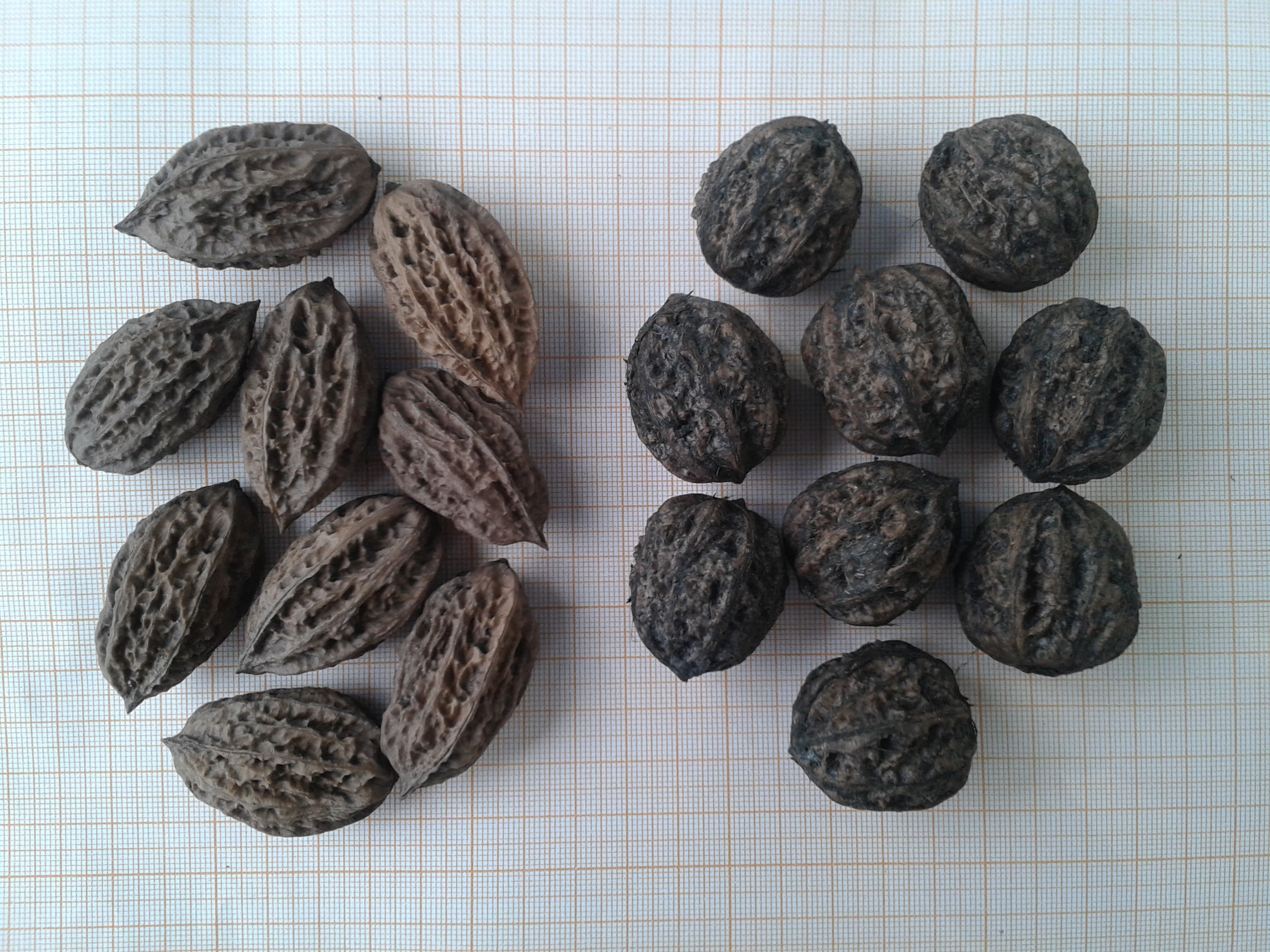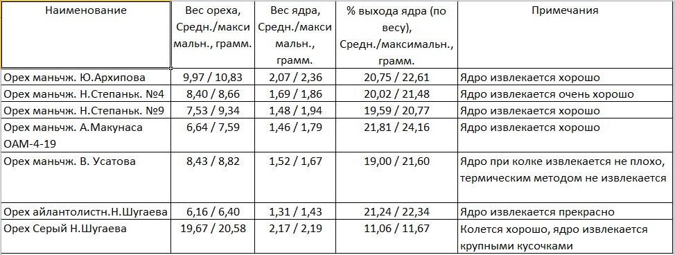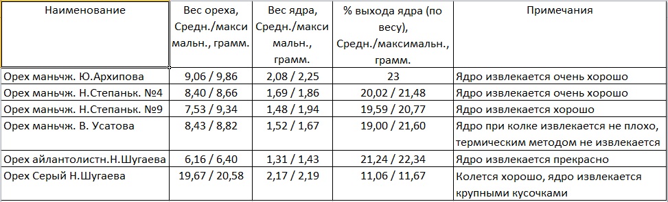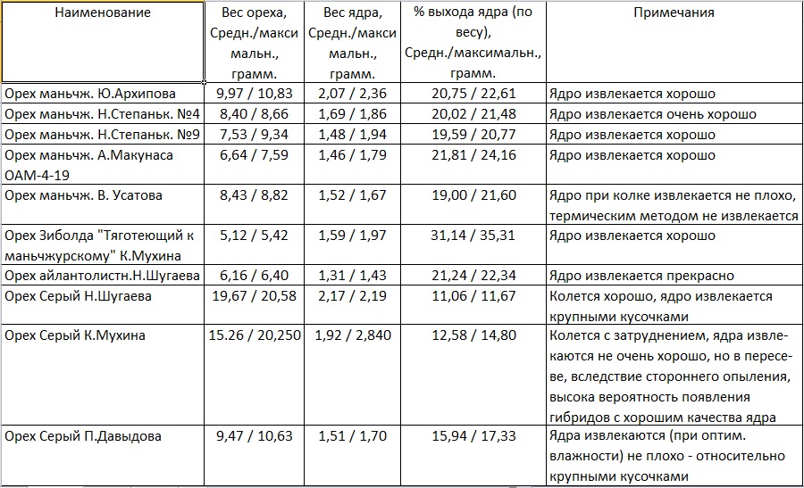 Несколько дней назад перечитывал статью Ольги Рейф "ВНУТРИВИДОВАЯ ИЗМЕНЧИВОСТЬ ОРЕХА МАНЬЧЖУРСКОГО В ПРИМОРСКОМ КРАЕ" и обратил внимание на раздел «Культуры (посадки) ореха (г. Уссурийск)» в таблице. Размер ядер маньчжурского ореха в этом разделе существенно выше, чем в природных популяциях, как и процент выхода ядра - то есть, в этих культурных посадках растут, судя по всему, уже предварительно отобранные, лучшие формы ореха маньчжурского. Причём цифра среднего веса ядра ореха маньчжурского и его выход в культурных насаждениях составляет, соответственно, 2,84 гр и 21,90%, а отдельные позиции существенно выще - 3,25 гр. и 23,90%: это очень высокие показатели для маньчжурского ореха: Даже самые крупноплодные орехи Зибольда, которые я держал в руках не имели такого веса ядра! Самый крупный Зибольда, который я видел и взвешивал имел ядро 3,12 грамм.